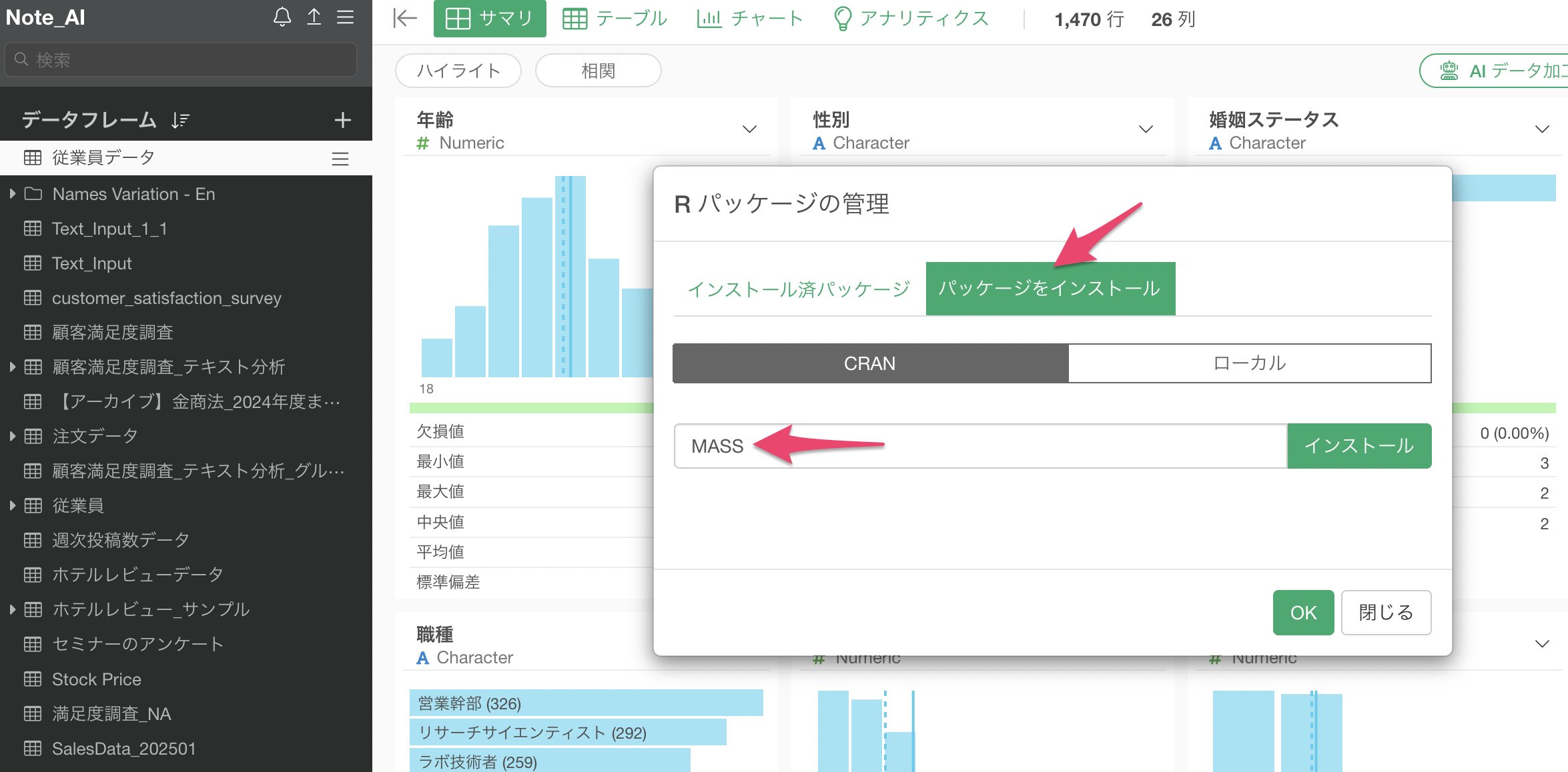 MASSパッケージがインストールされていないステップワイズ法は、統計的な基準(AIC)に基づいて予測モデルに含める変数を自動的に選択する手法です。ExploratoryのUIには直接的なステップワイズ法のメニューはありませんが、ノート機能でRのMASSパッケージを使用することで実行が可能です。