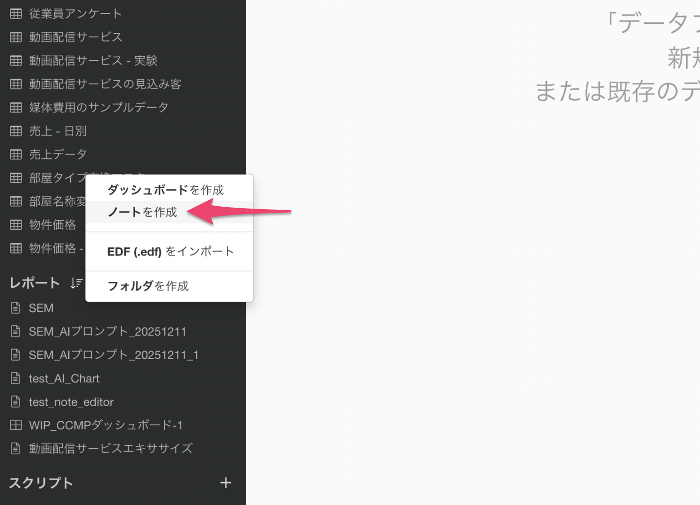 レポートのプラスボタンから「ノートを作成」を選択します。