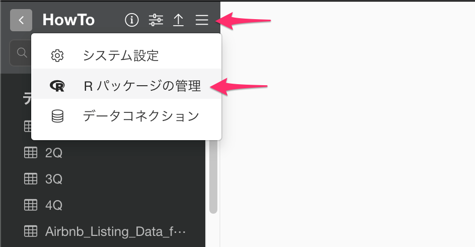 プロジェクトを開き、横線3本のメニューからRパッケージの管理を選択します。