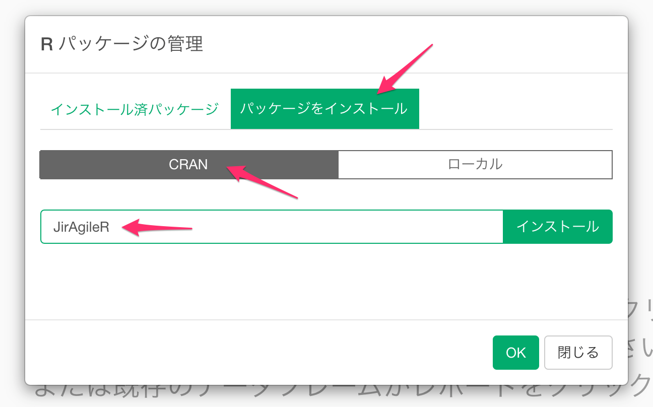 パッケージをインストールを選択し、CRANをクリックします。JirAgileRと入力して「インストール」ボタンをクリックします。