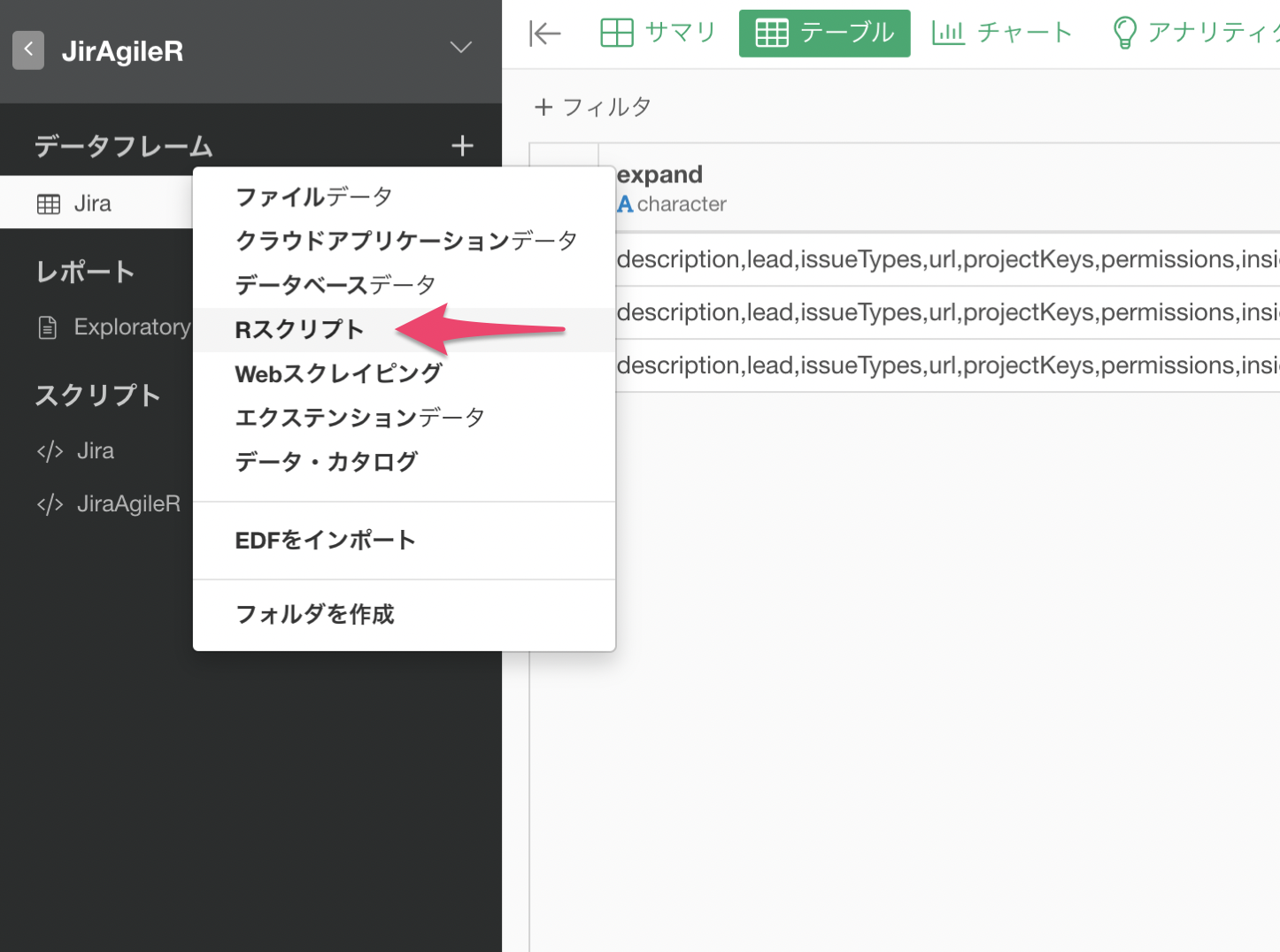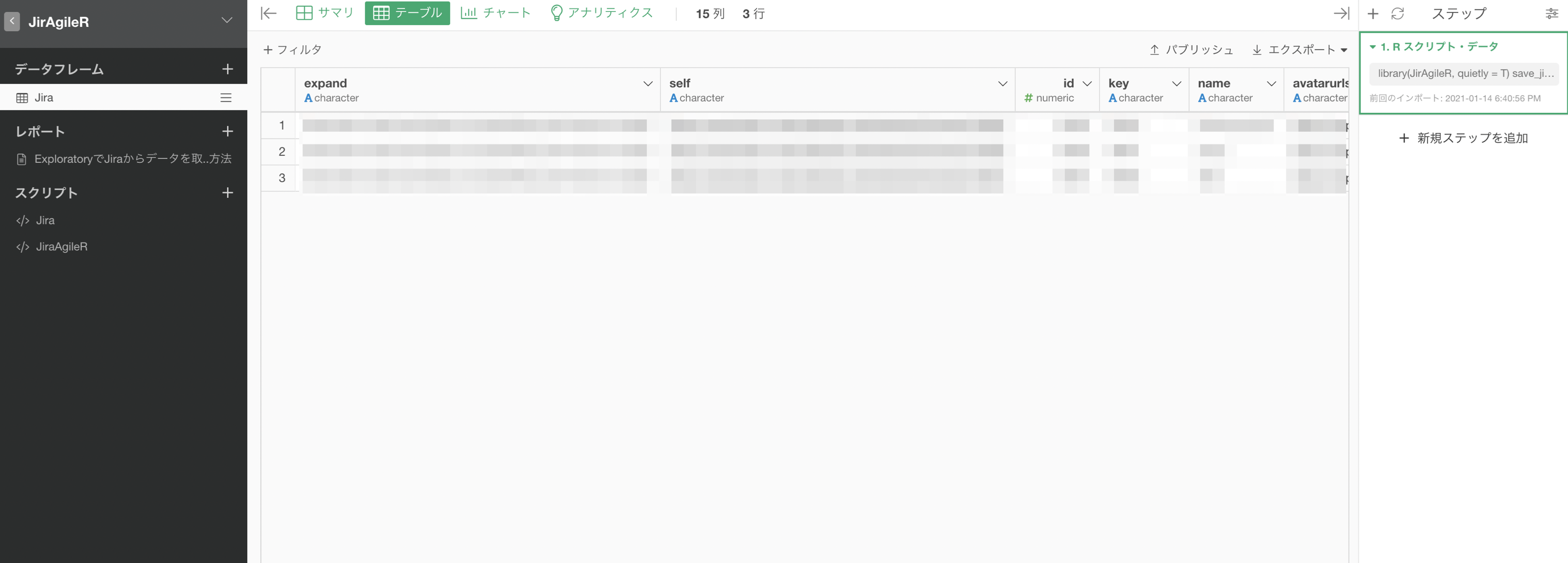 ExploratoryでJiraからデータを取得する際に、JirAgileRというパッケージを使うことで簡単にデータを取得することができます。