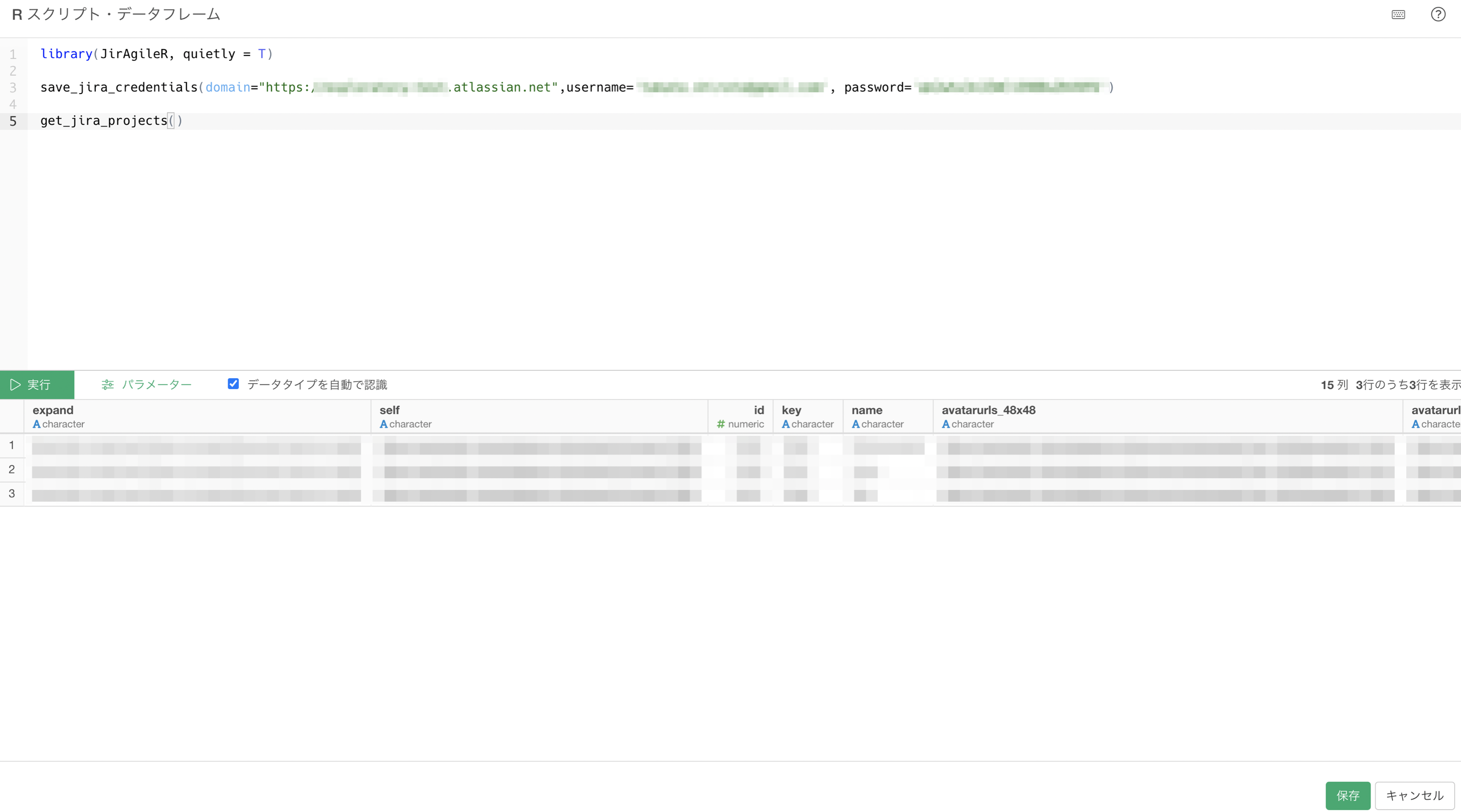 保存ボタンをクリックすることで、Jiraから取得したデータをデータフレームとして保存することができます。