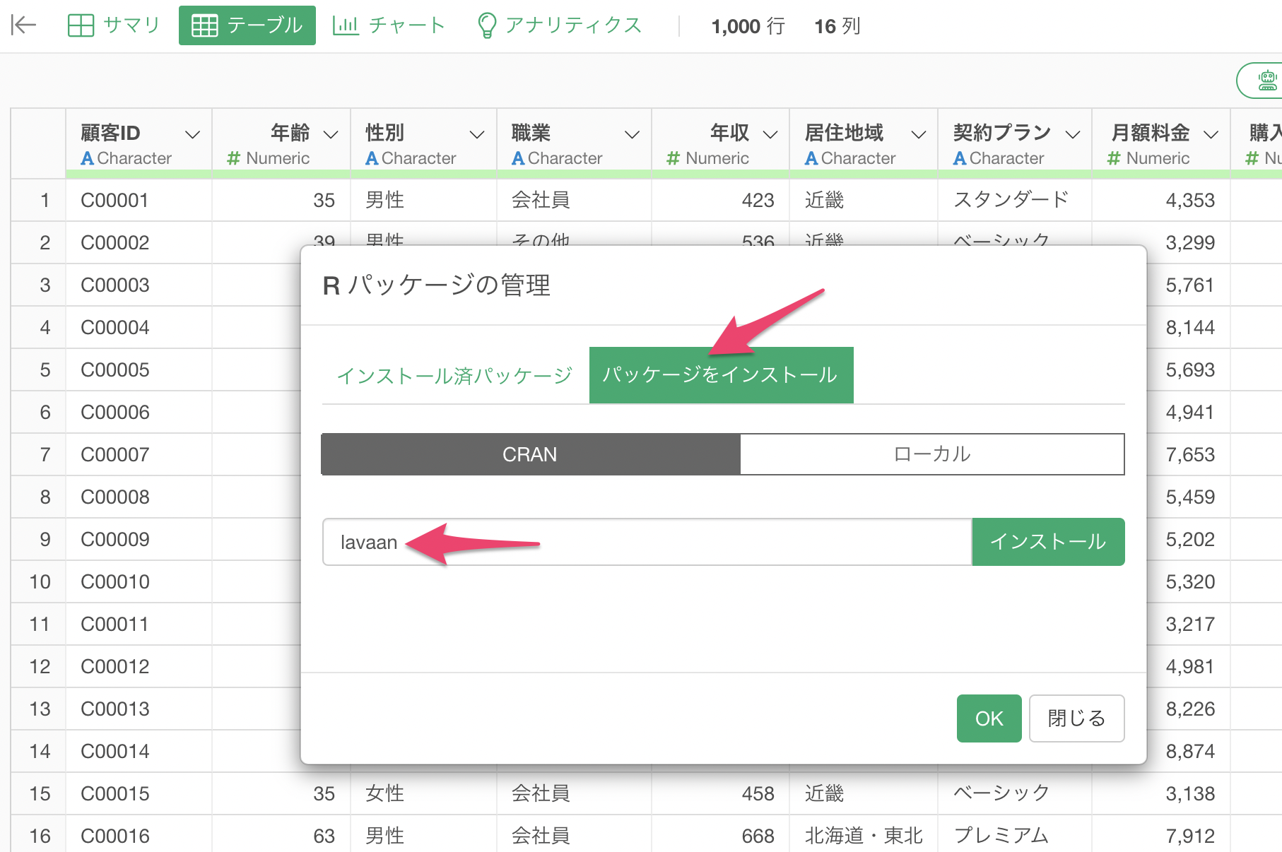 Rパッケージの管理のダイアログが表示されるため、パッケージをインストールをクリックしてから「lavaan」と「semPlot」パッケージをインストールしてください。