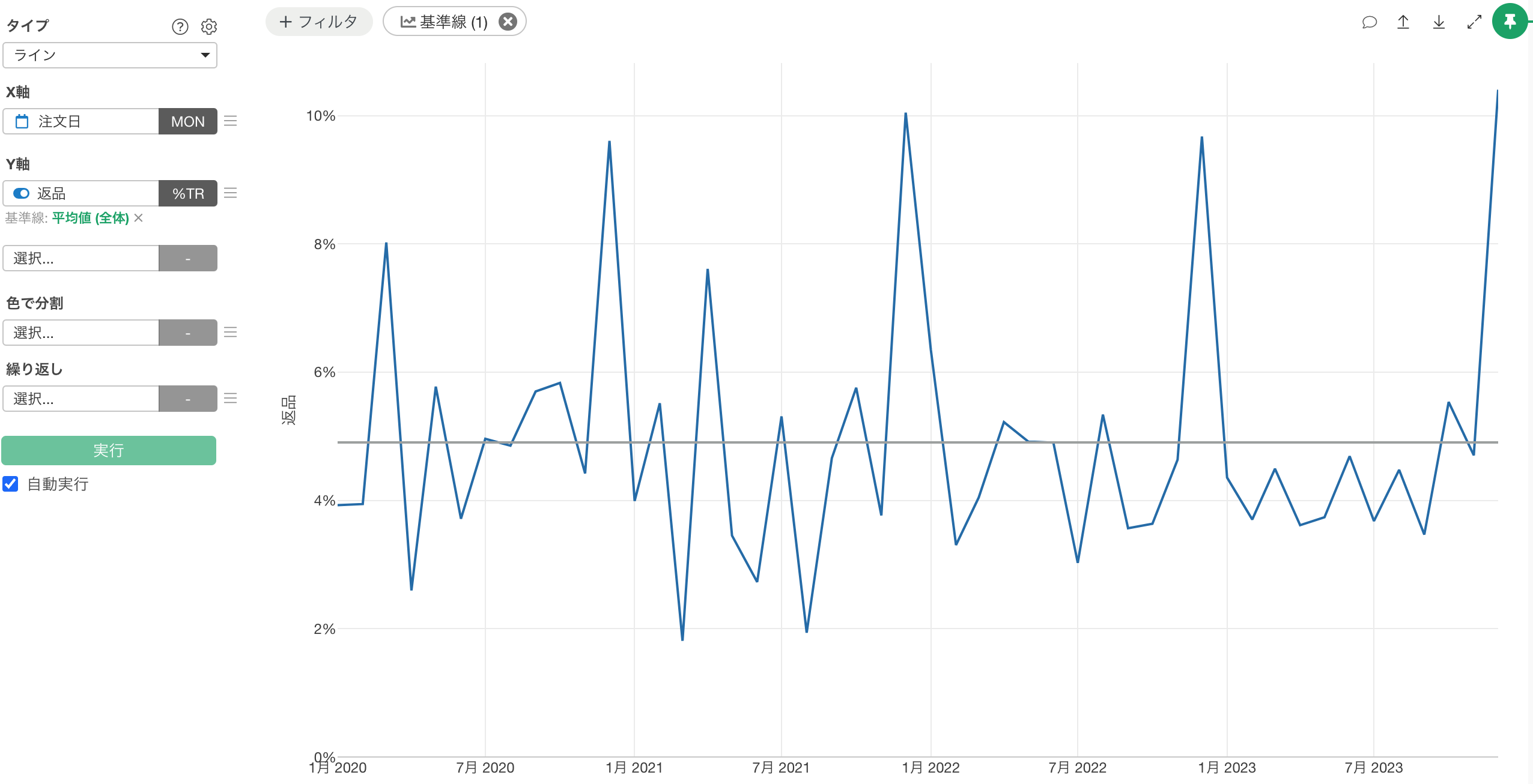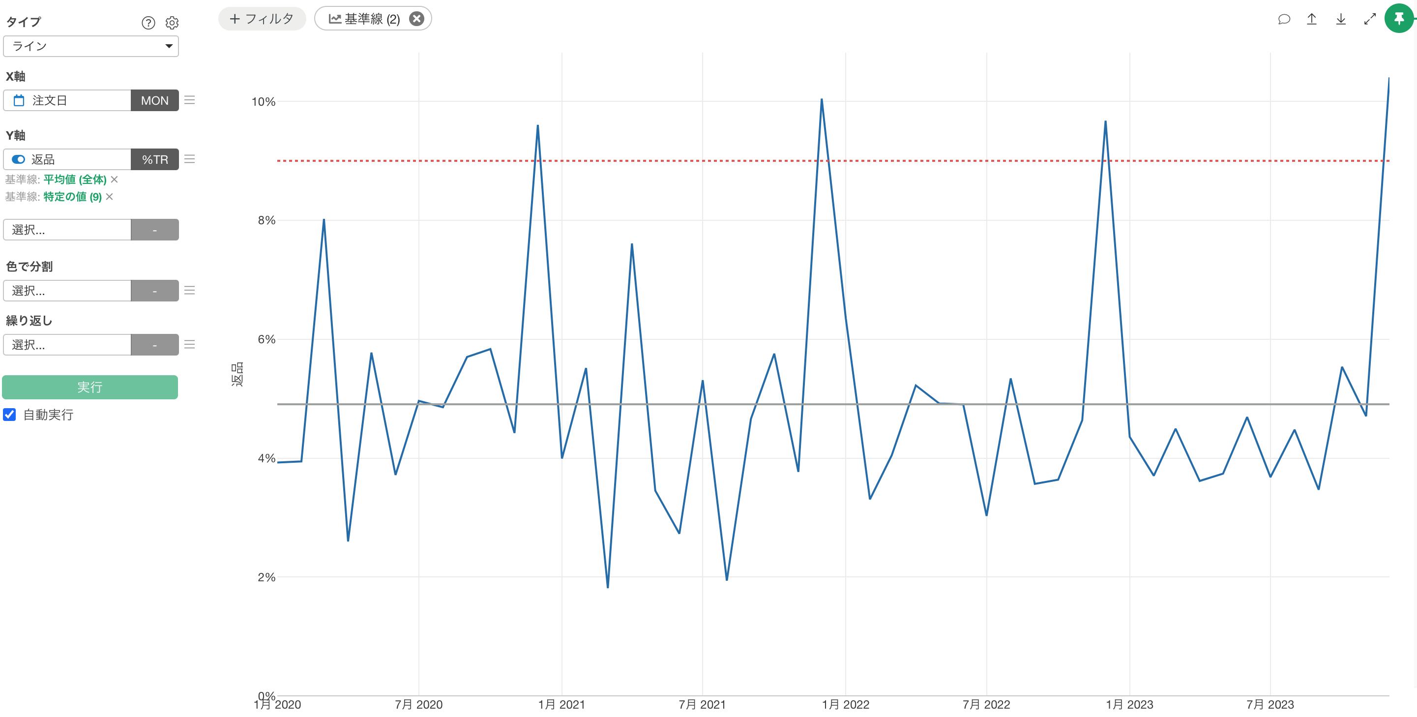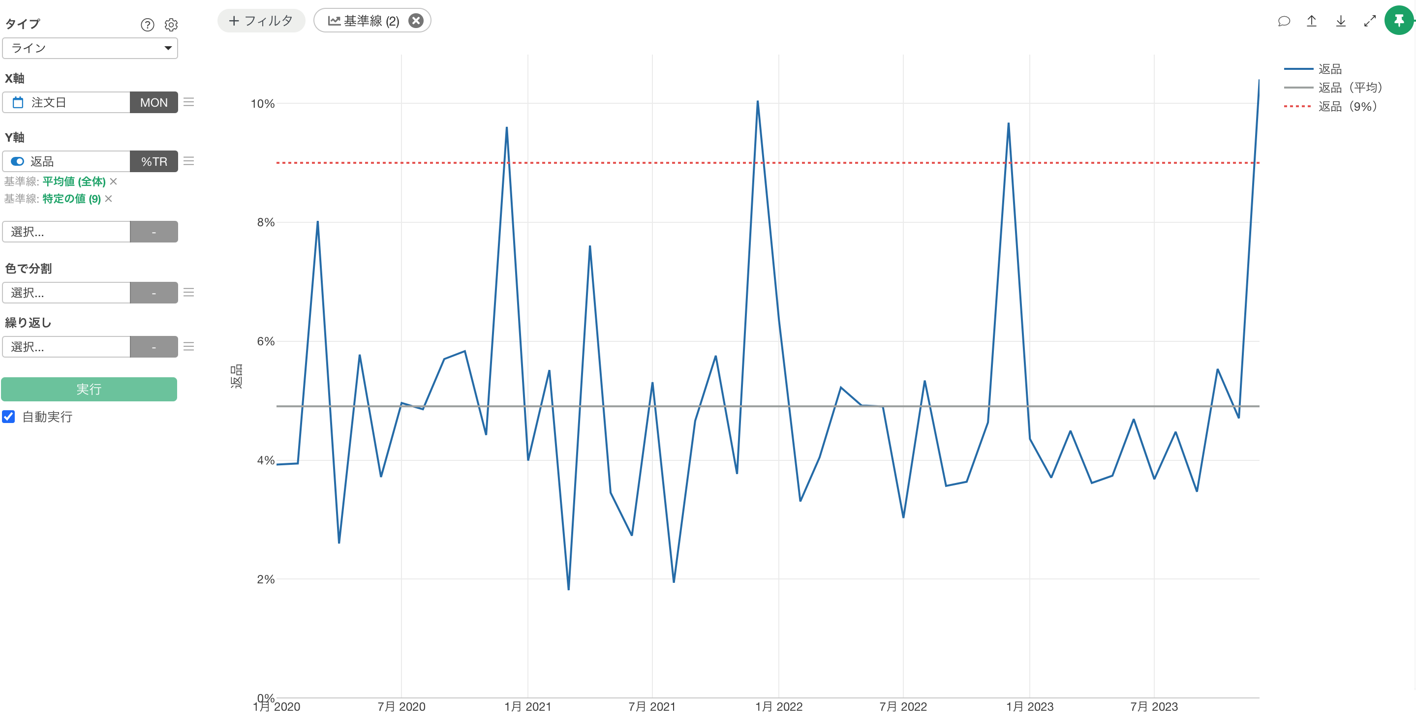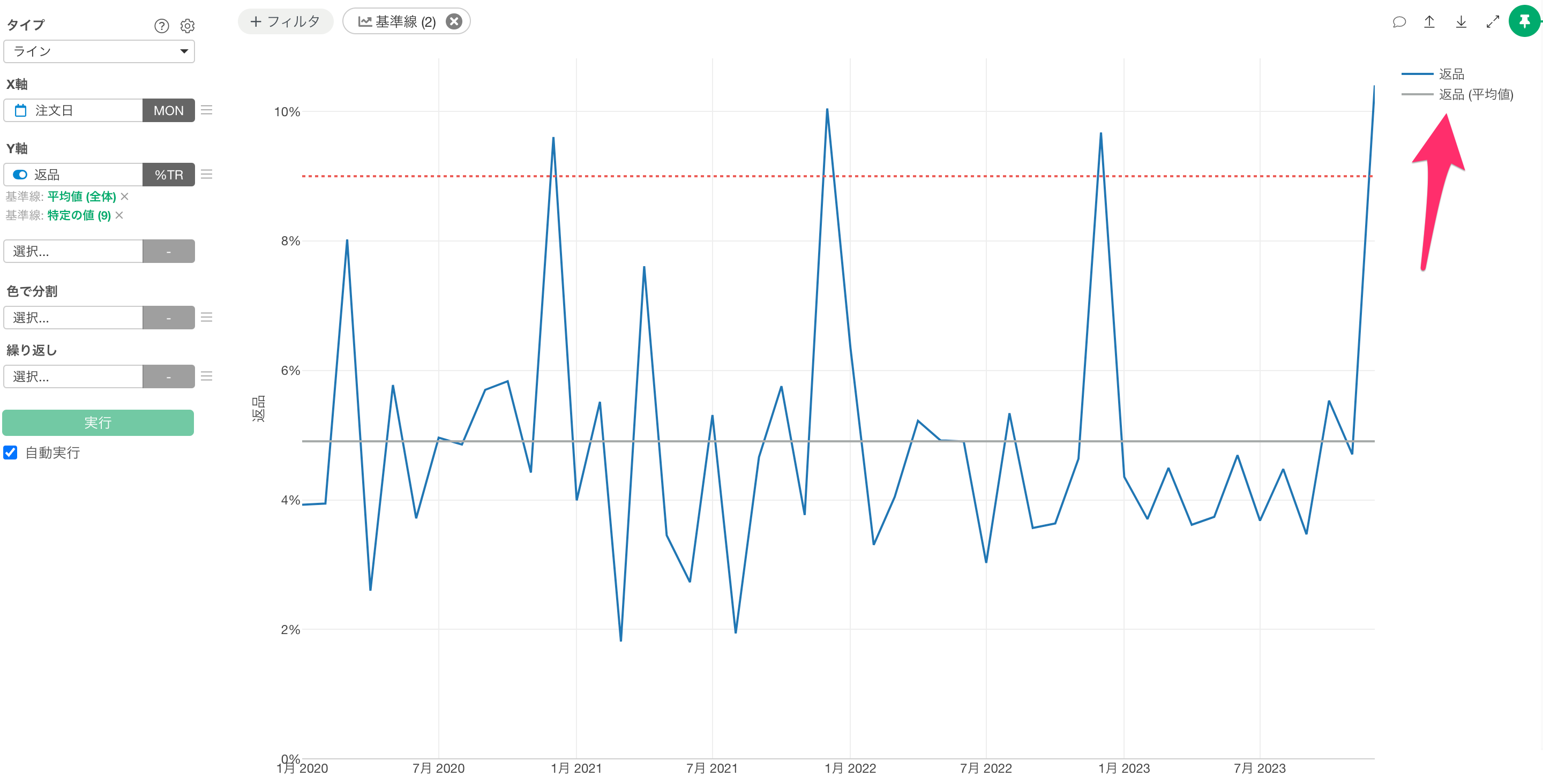 毎月の返品率などの指標をチャートでモニターする際、平均の基準線を引いて全体の傾向を把握することは一般的な可視化のアプローチです。
