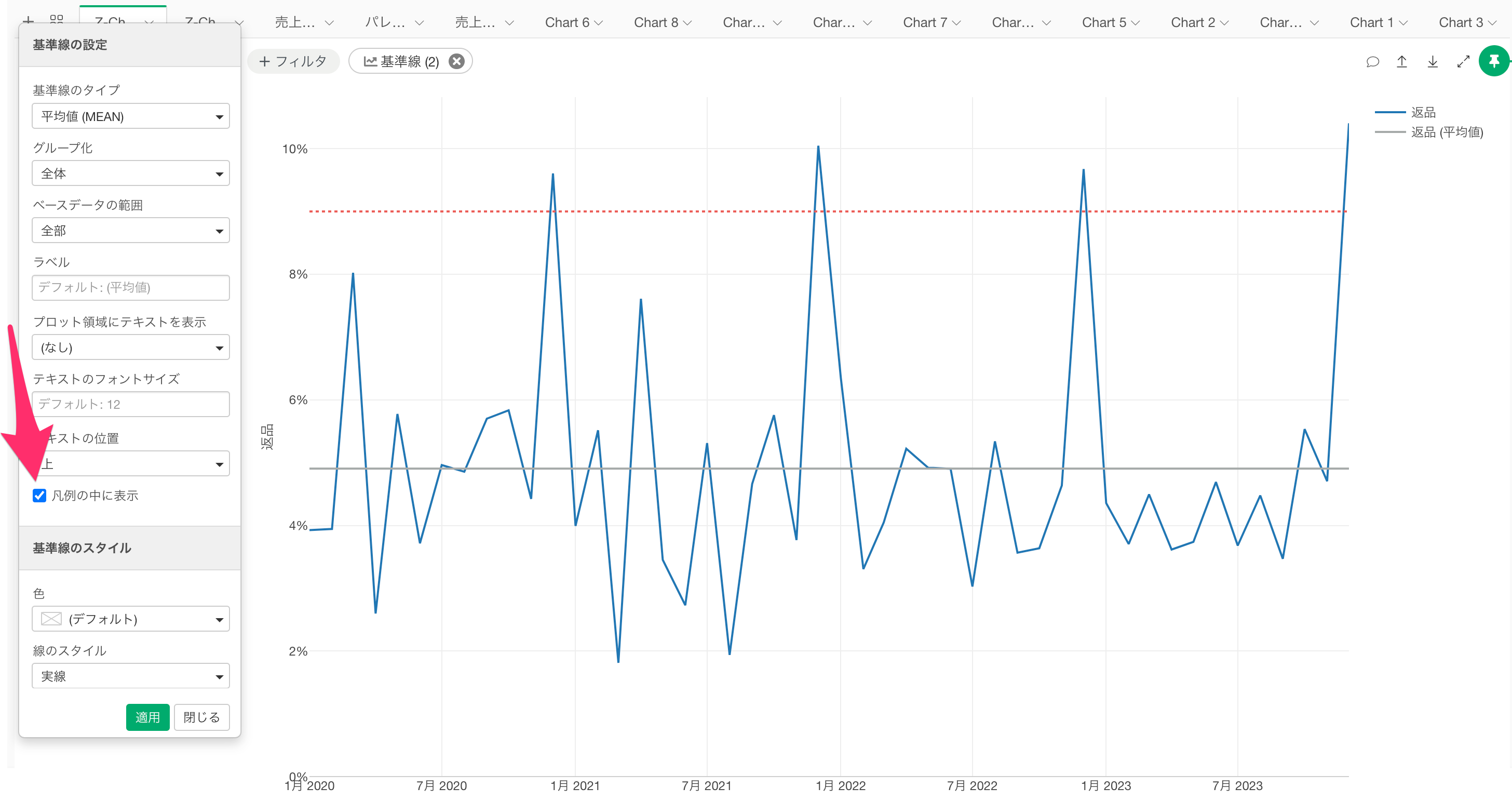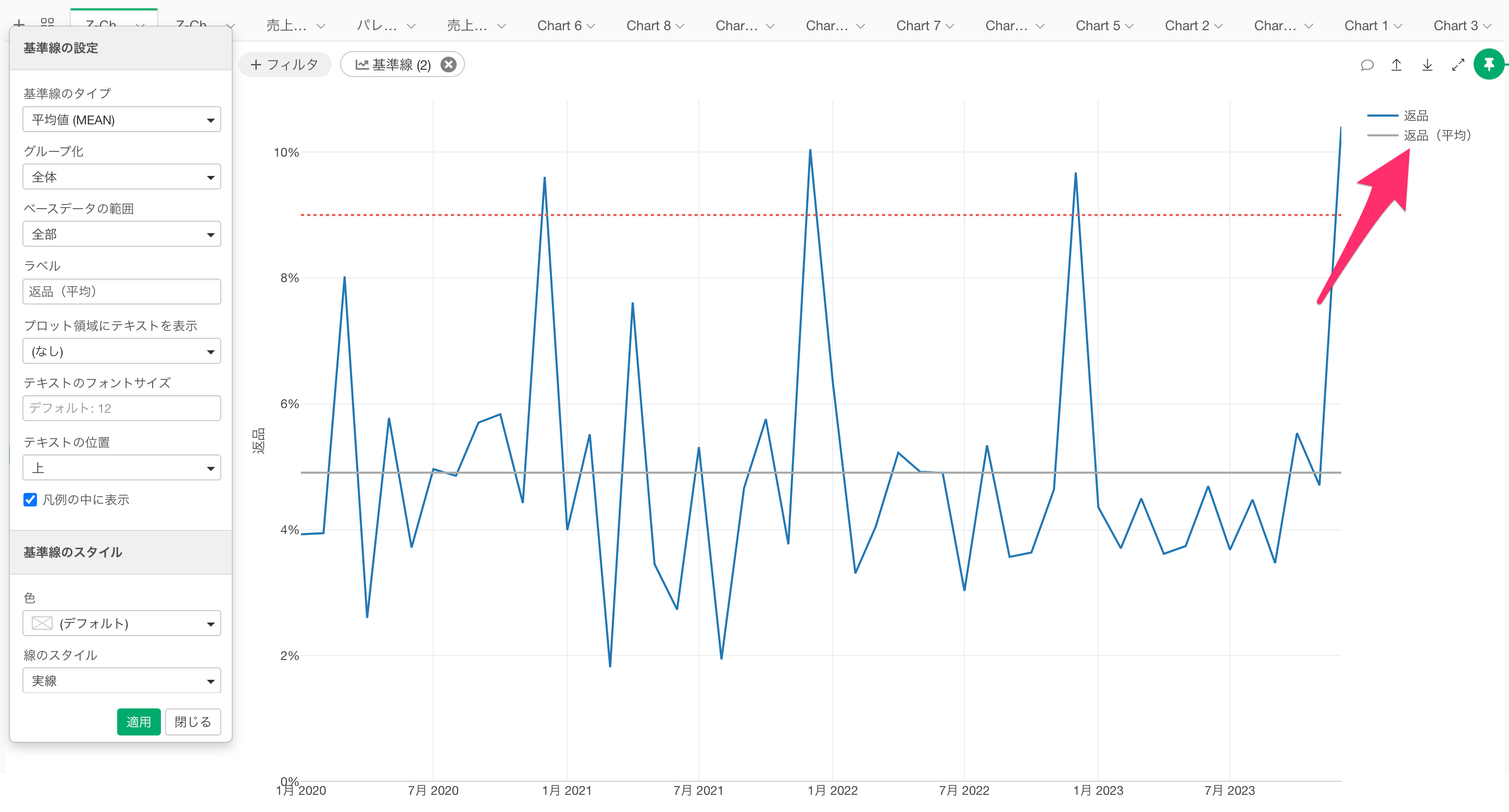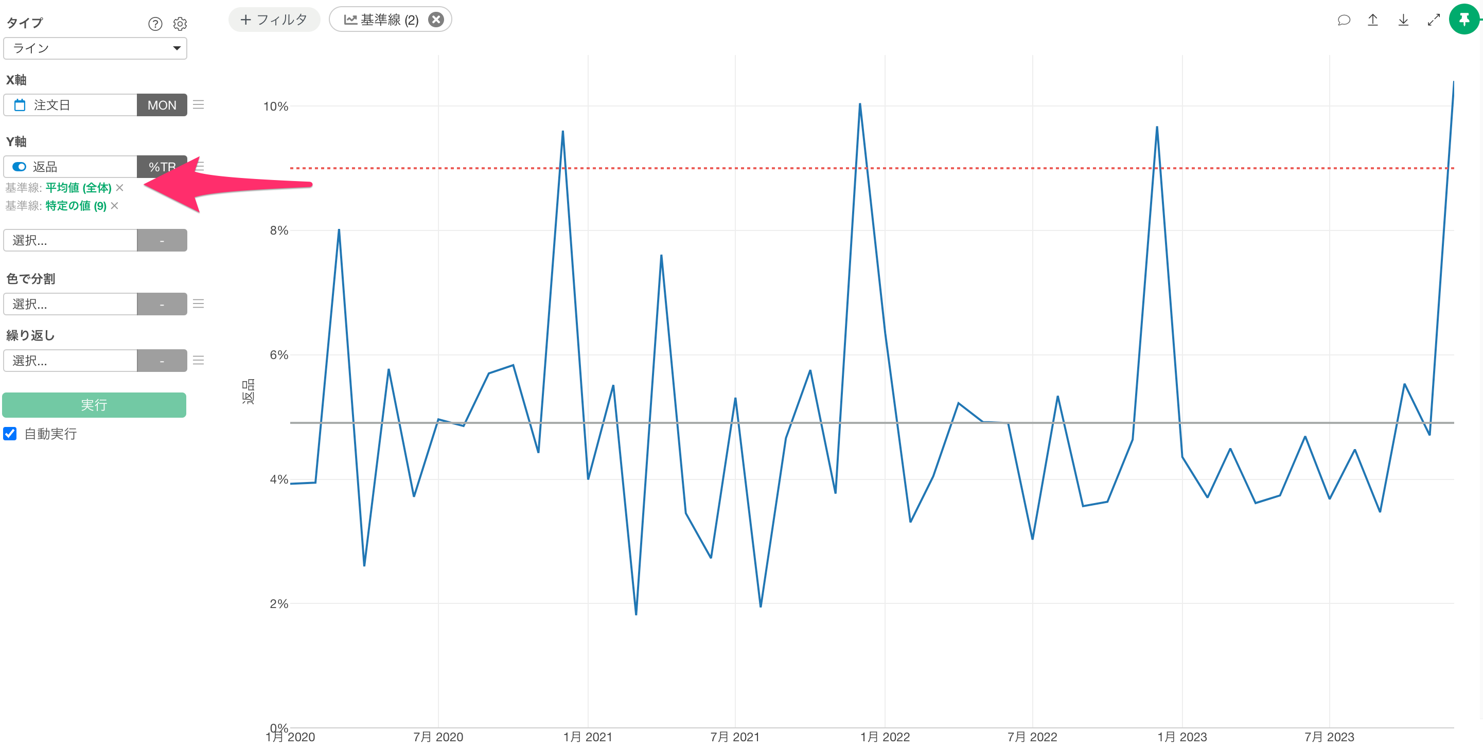 毎月の返品率などの指標をチャートでモニターする際、平均の基準線を引いて全体の傾向を把握することは一般的な可視化のアプローチです。