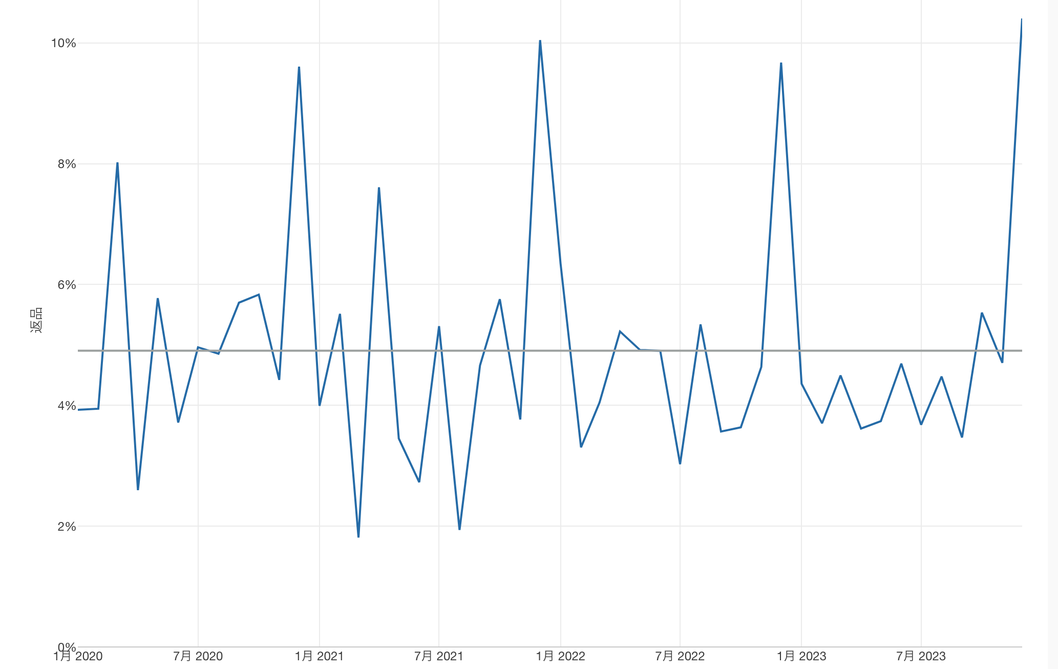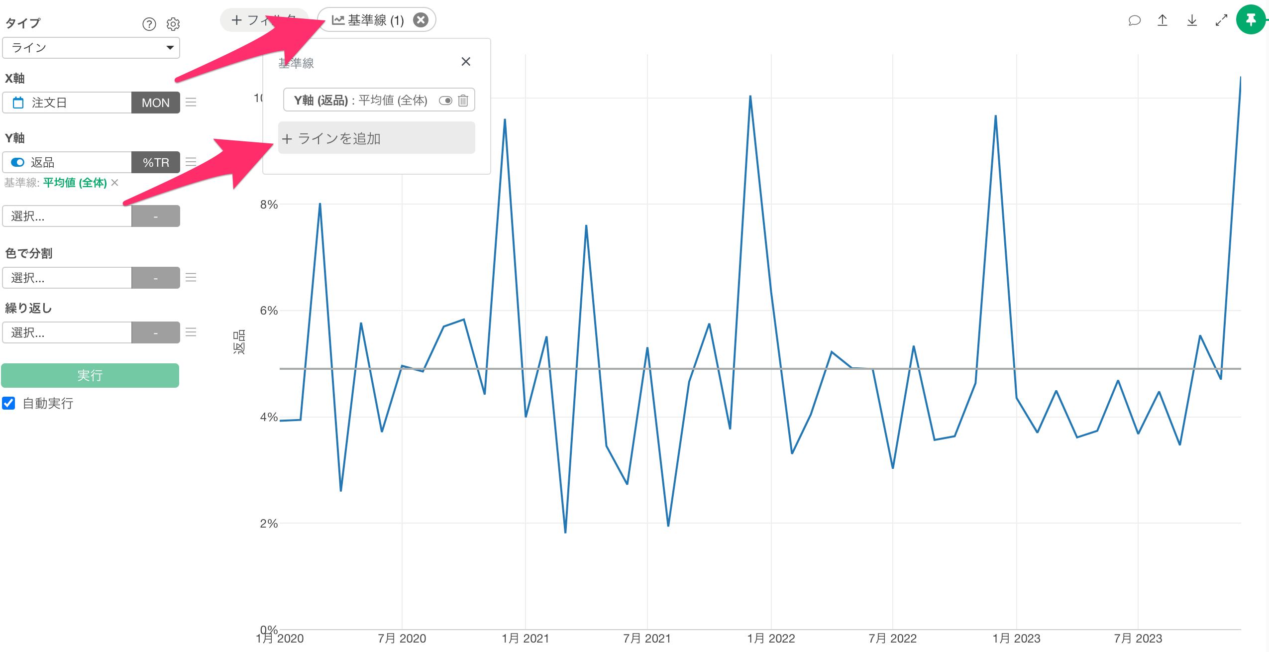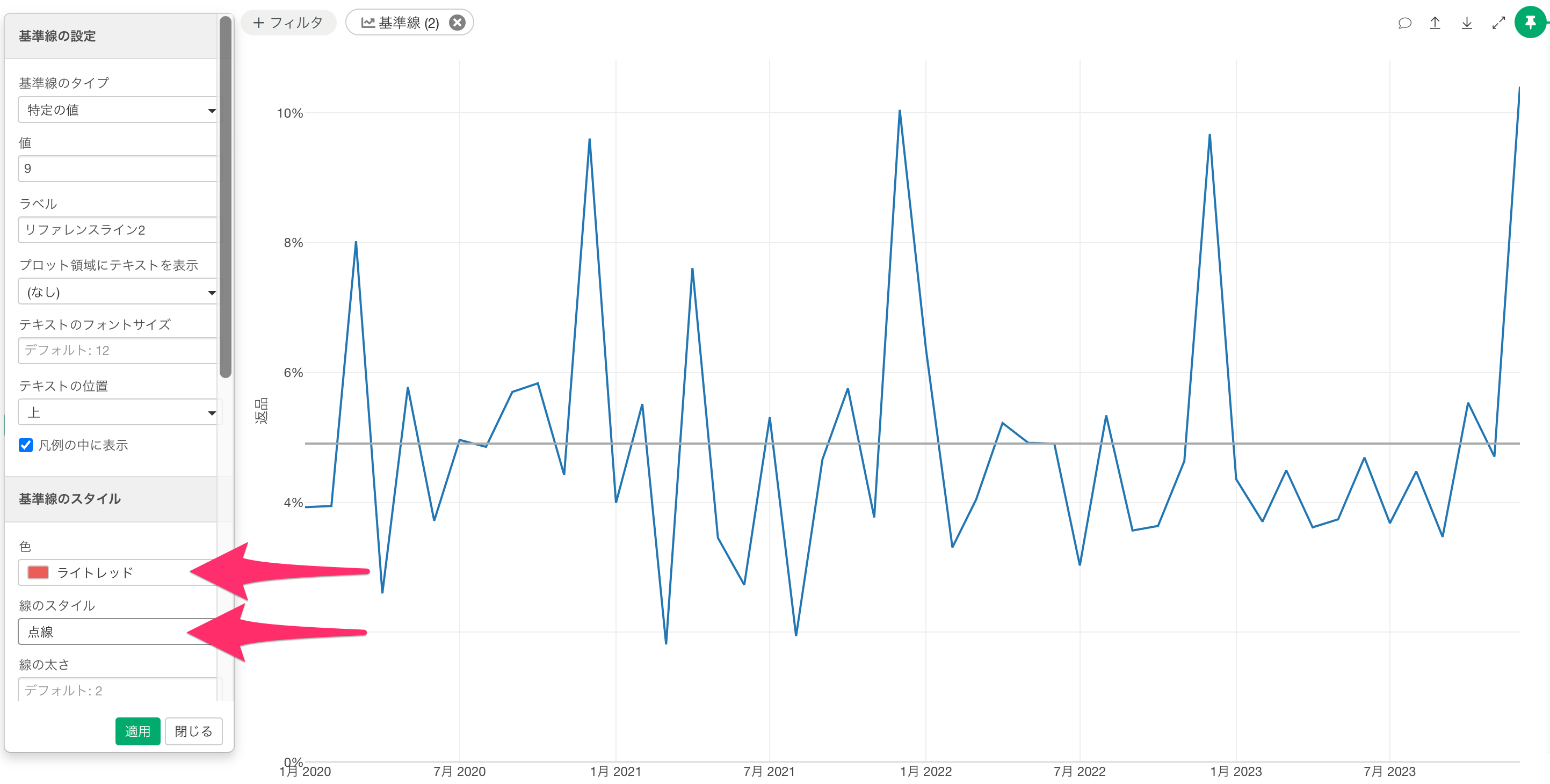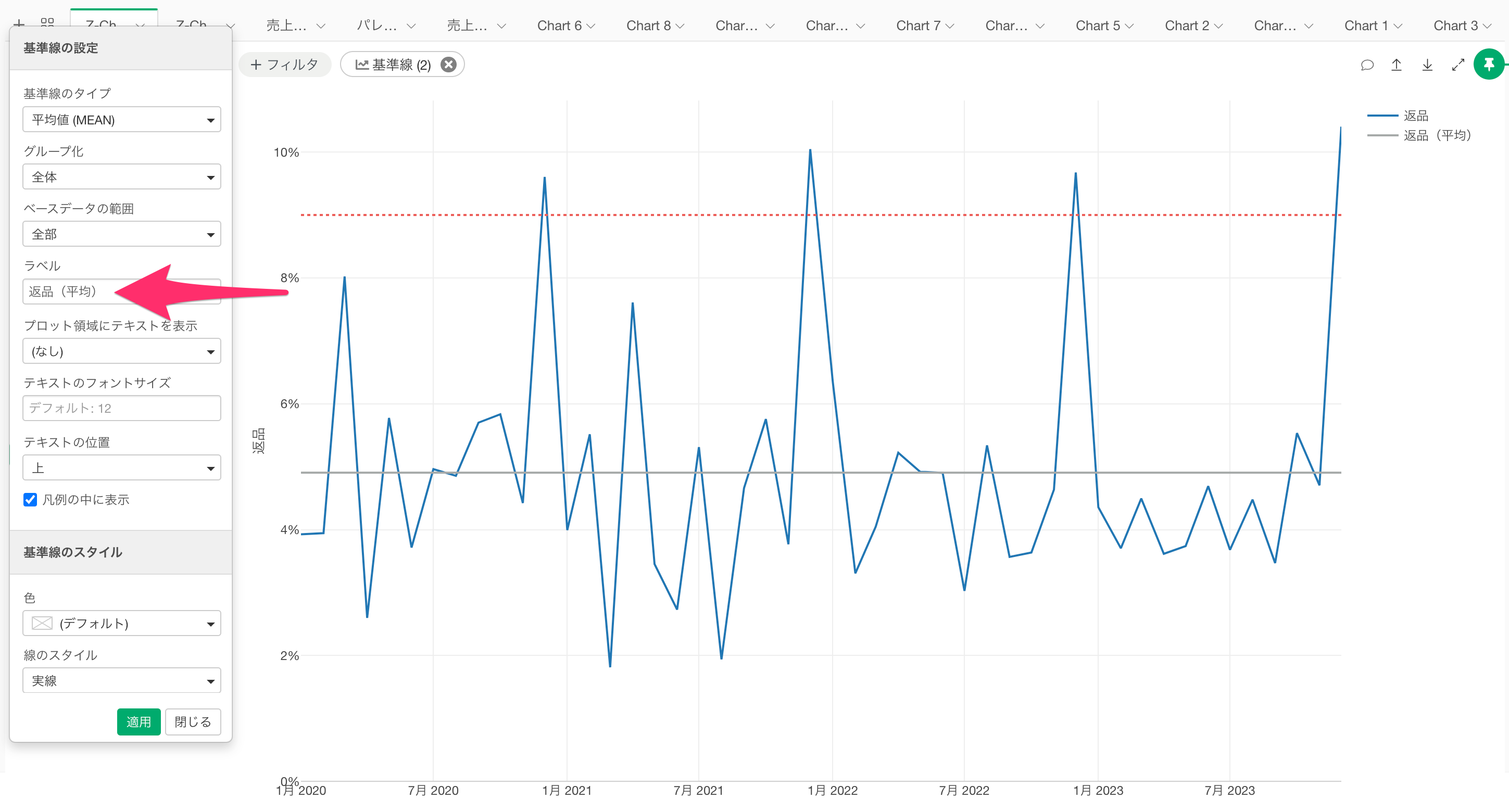 毎月の返品率などの指標をチャートでモニターする際、平均の基準線を引いて全体の傾向を把握することは一般的な可視化のアプローチです。