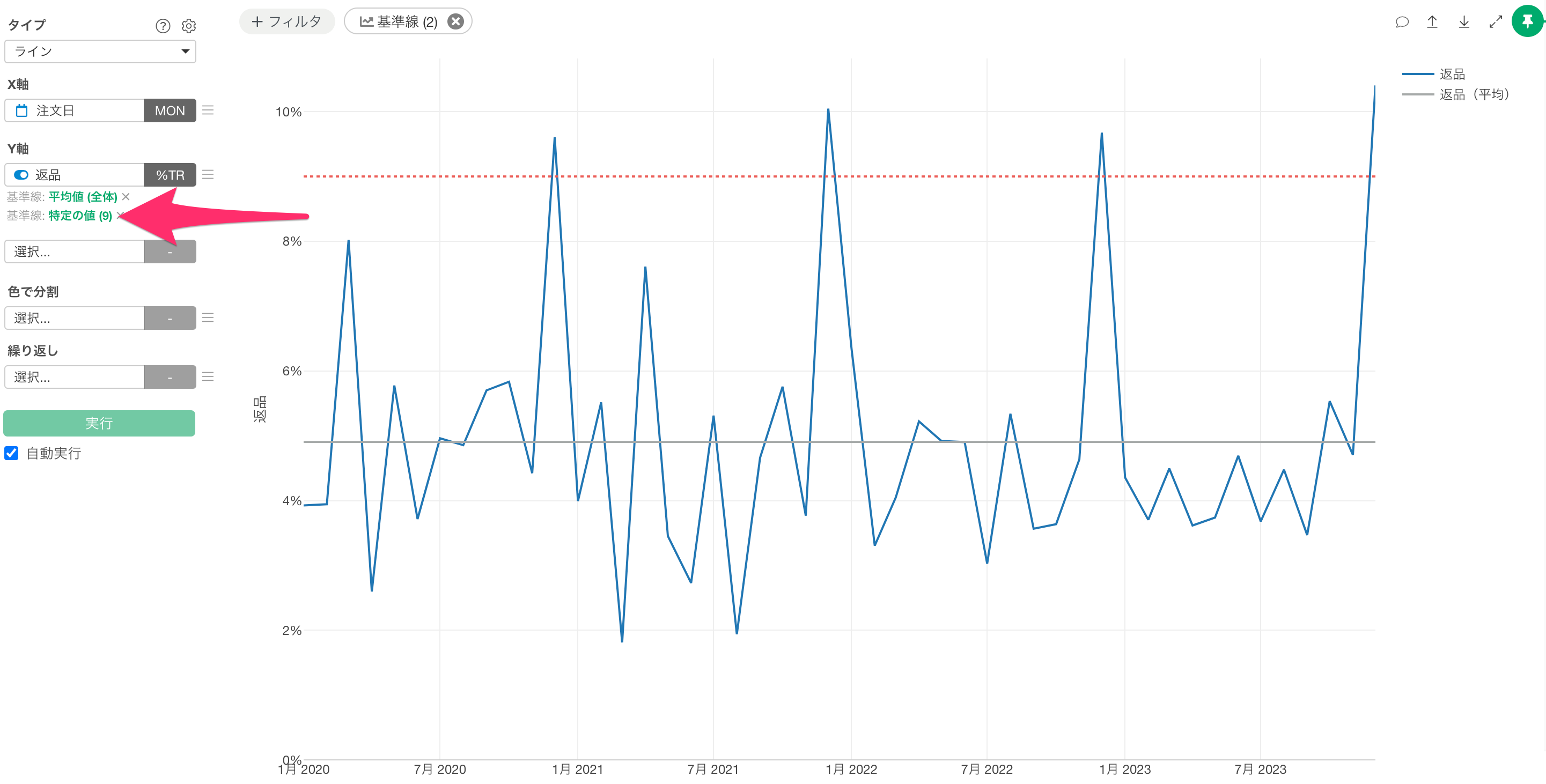 しかし、任意のしきい値(定数)を設定して、返品率や平均単価などの指標が期待する水準を満たしているかを一目で判断したい場合もあります。