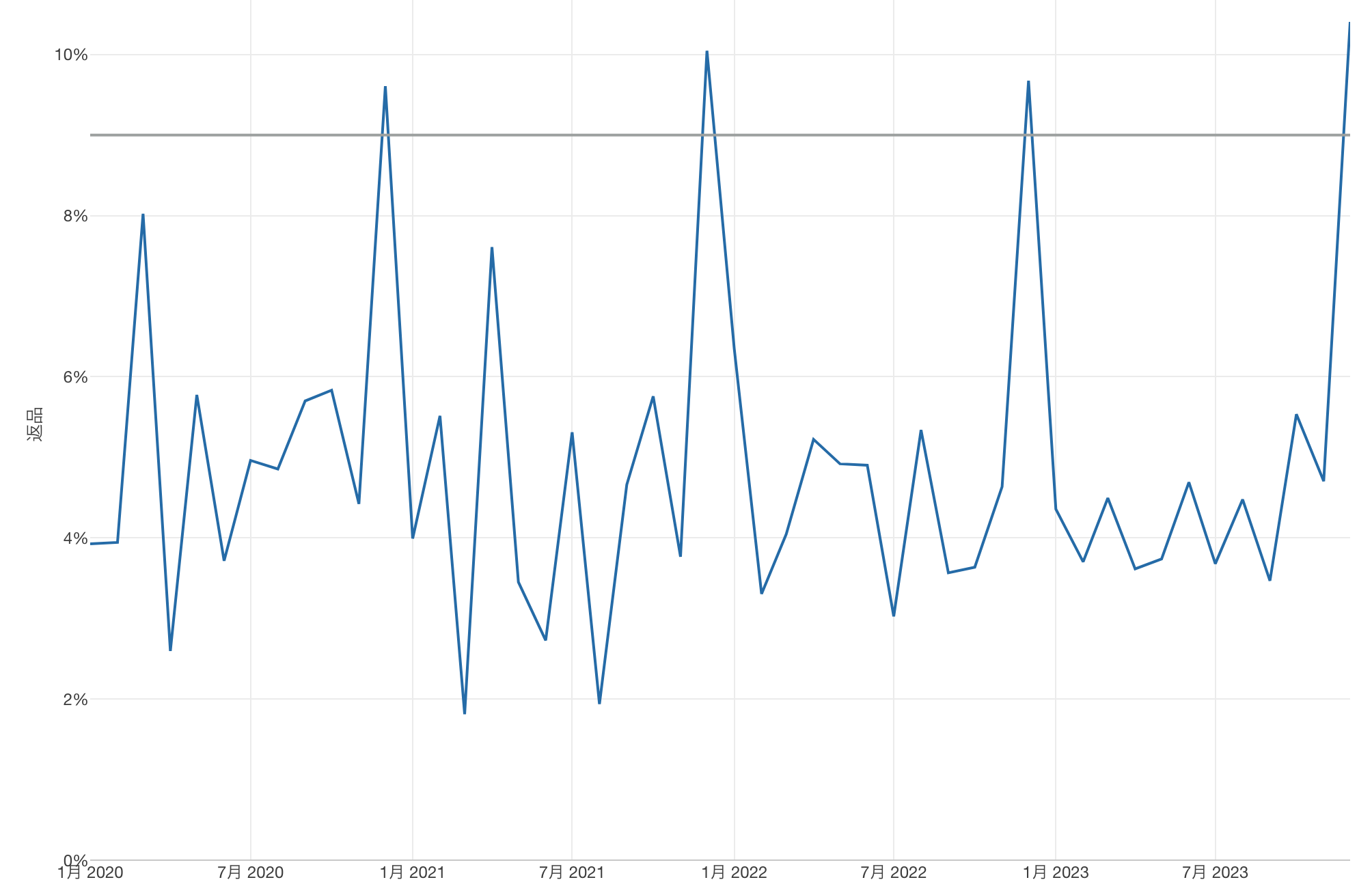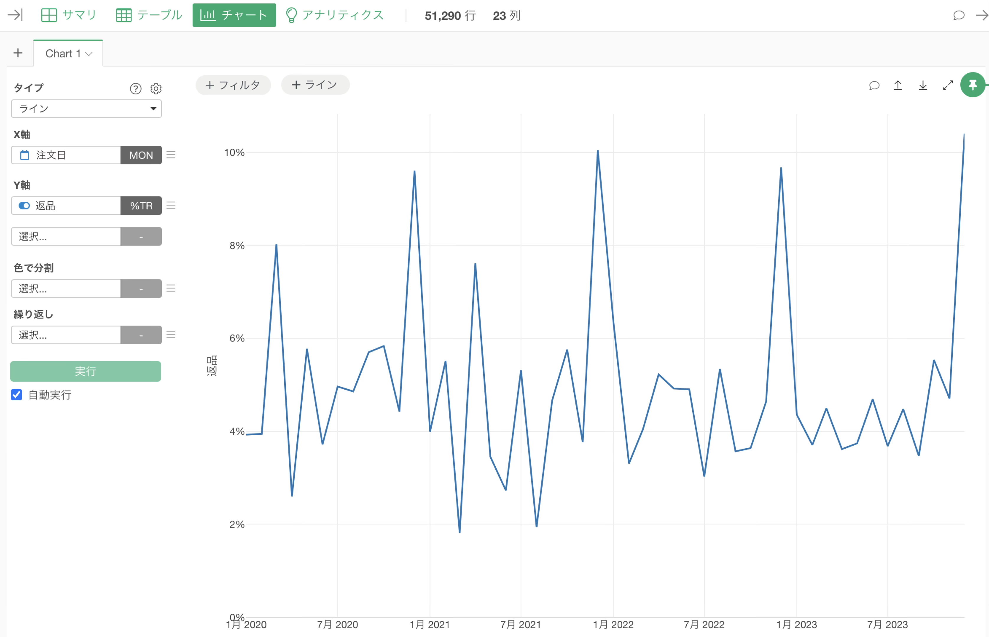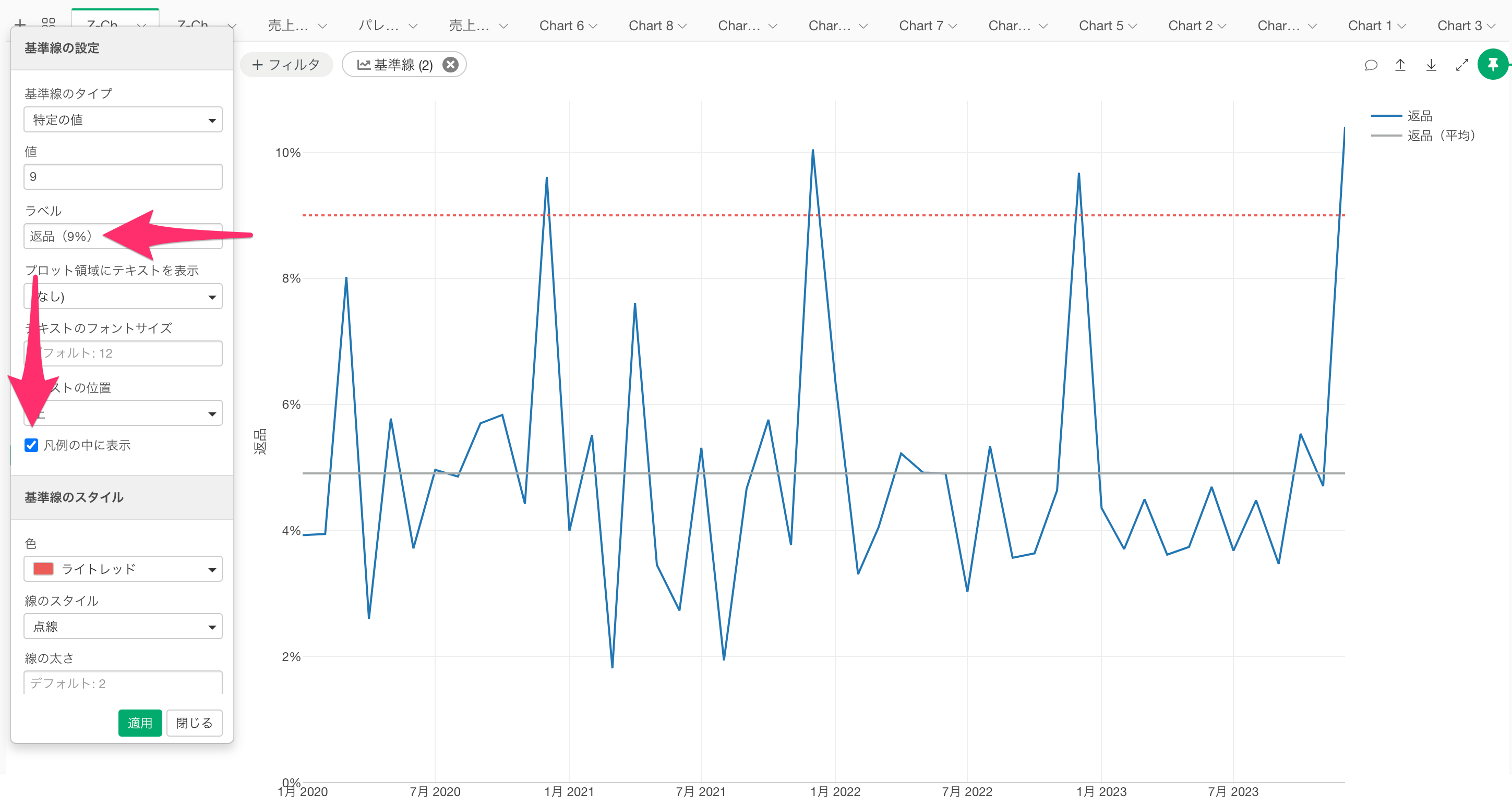 今回は下記のような毎月の返品率を可視化したチャートで、平均と特定の返品率(今回は9%)の基準線を同時に可視化していきます。