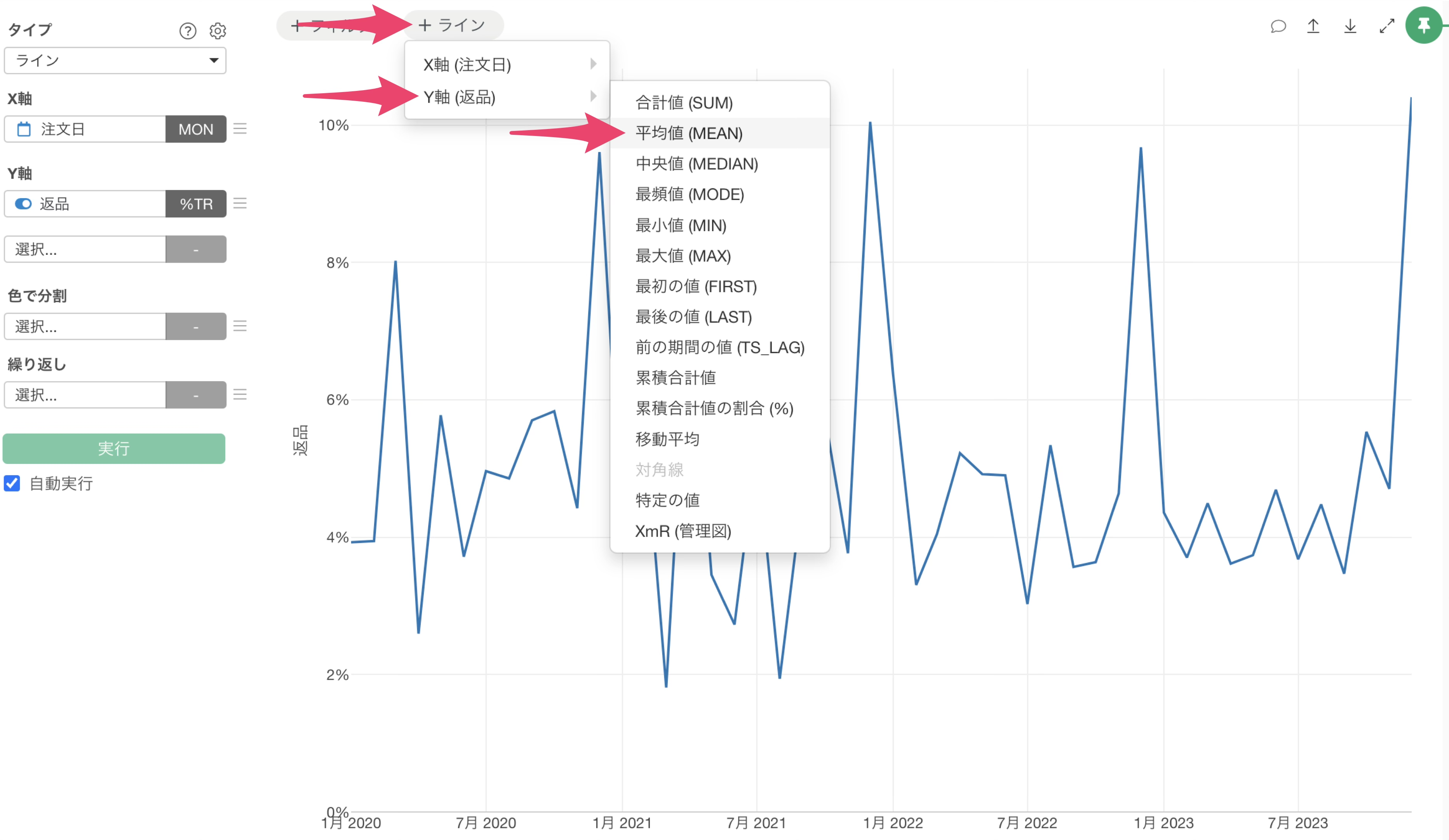 チャート上部にあるラインの追加ボタンを選択し、Y軸のメニューから「平均値 (MEAN)」を選択します。