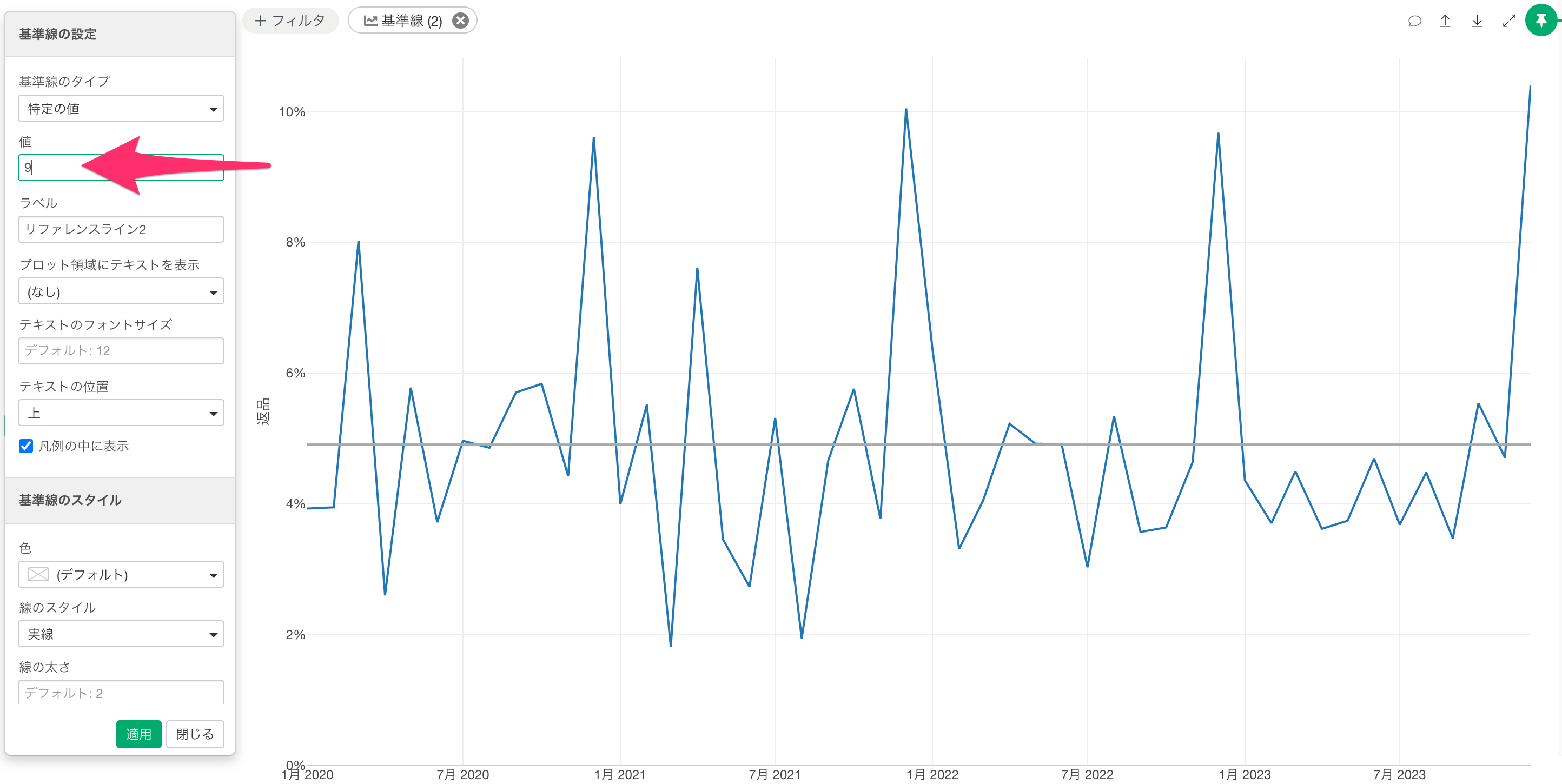 この時、Y軸のフォーマットに合わせて値を入力する必要があります。現在のチャートではY軸のフォーマットがパーセント表記になっているため、9%の場合は「9」と入力します。