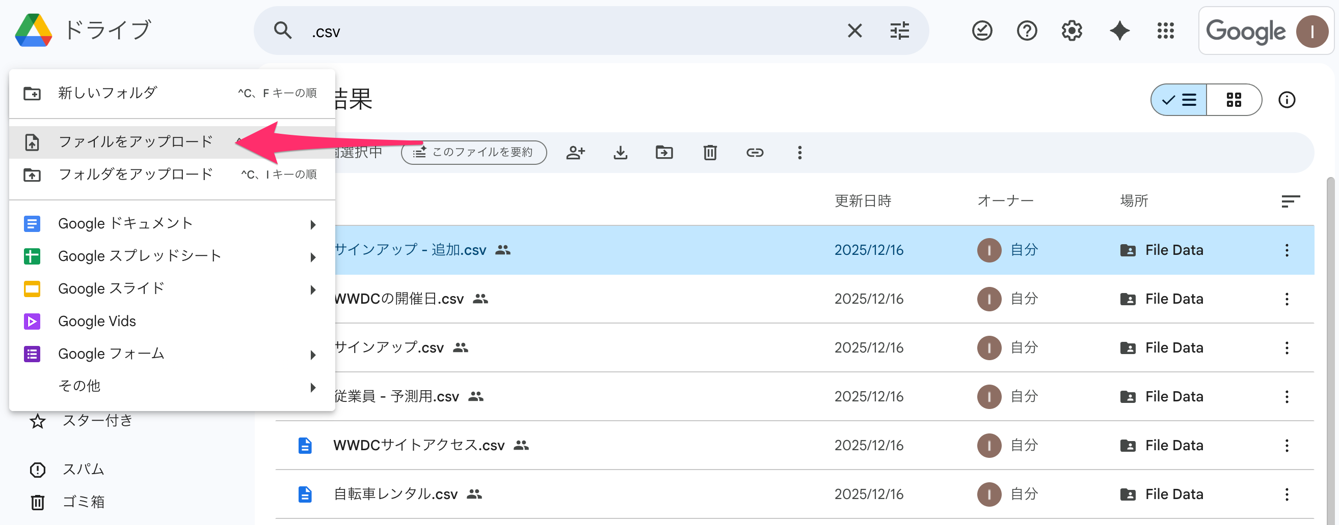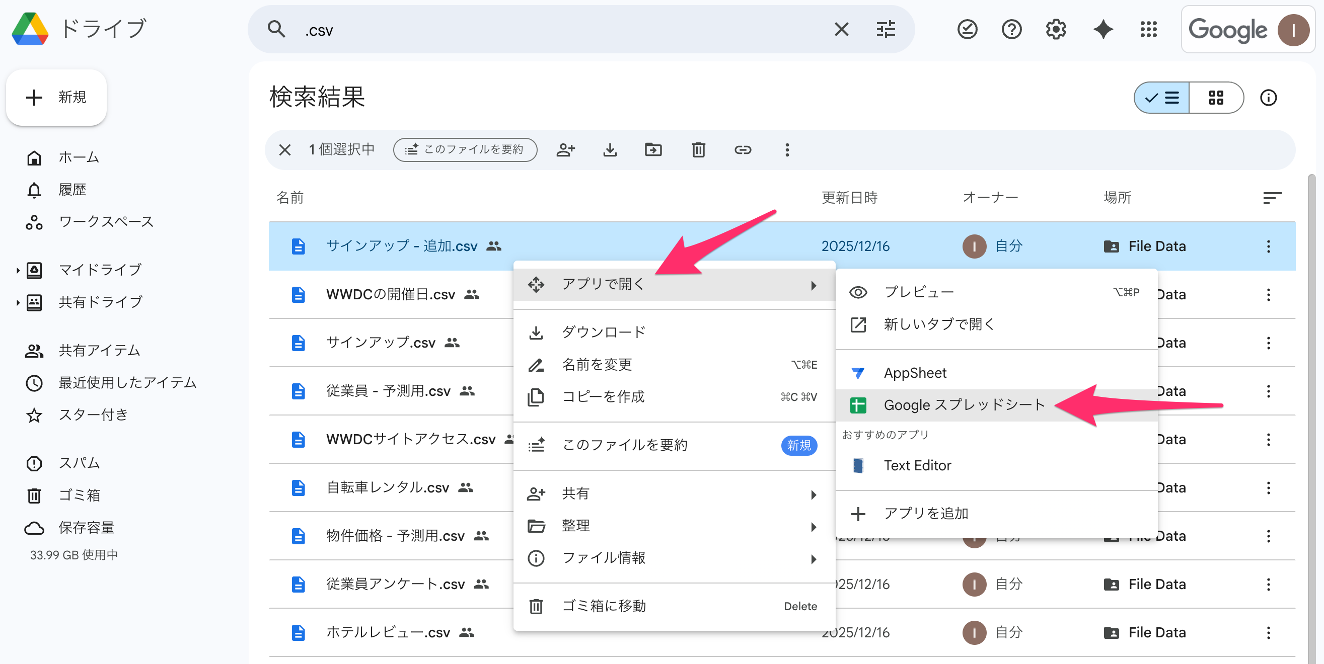 Google DriveにアップロードしたCSVファイルを右クリックすると、Googleスプレッドシートとして開くメニューが表示されます。