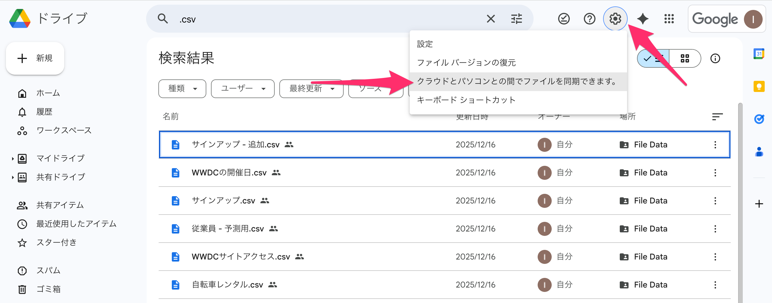 GoogleドライブのPCアプリをインストールすると、Google DriveがローカルPCのフォルダとして表示されます。このフォルダ内のCSVファイルをExcelファイルを直接開いて編集・上書き保存すると、自動的にGoogle Driveサーバーと同期されます。