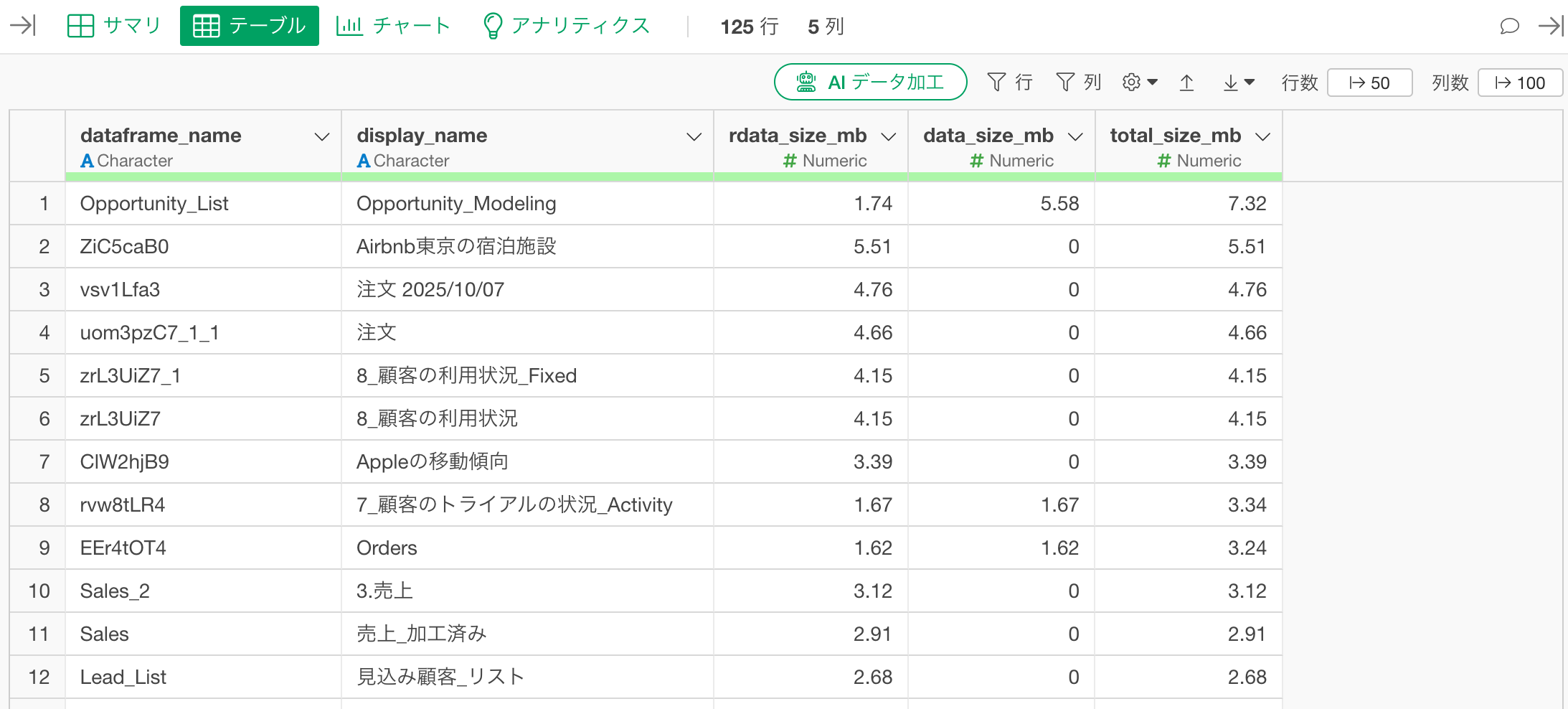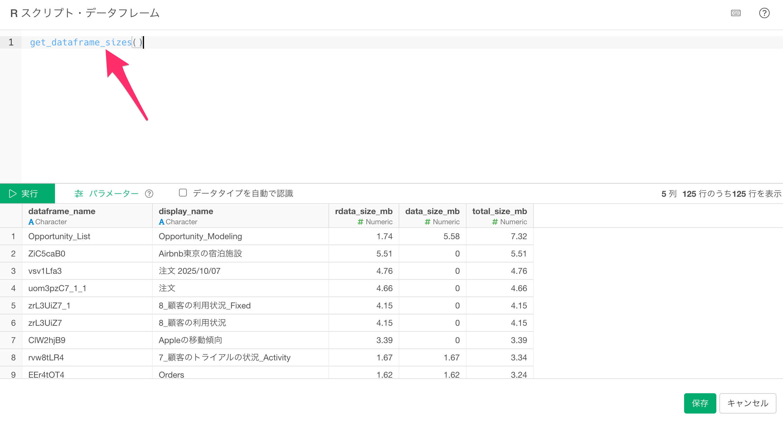 実行ボタンをクリックすることで、プロジェクト内の全てのデータフレーム情報をデータフレームで確認できます。