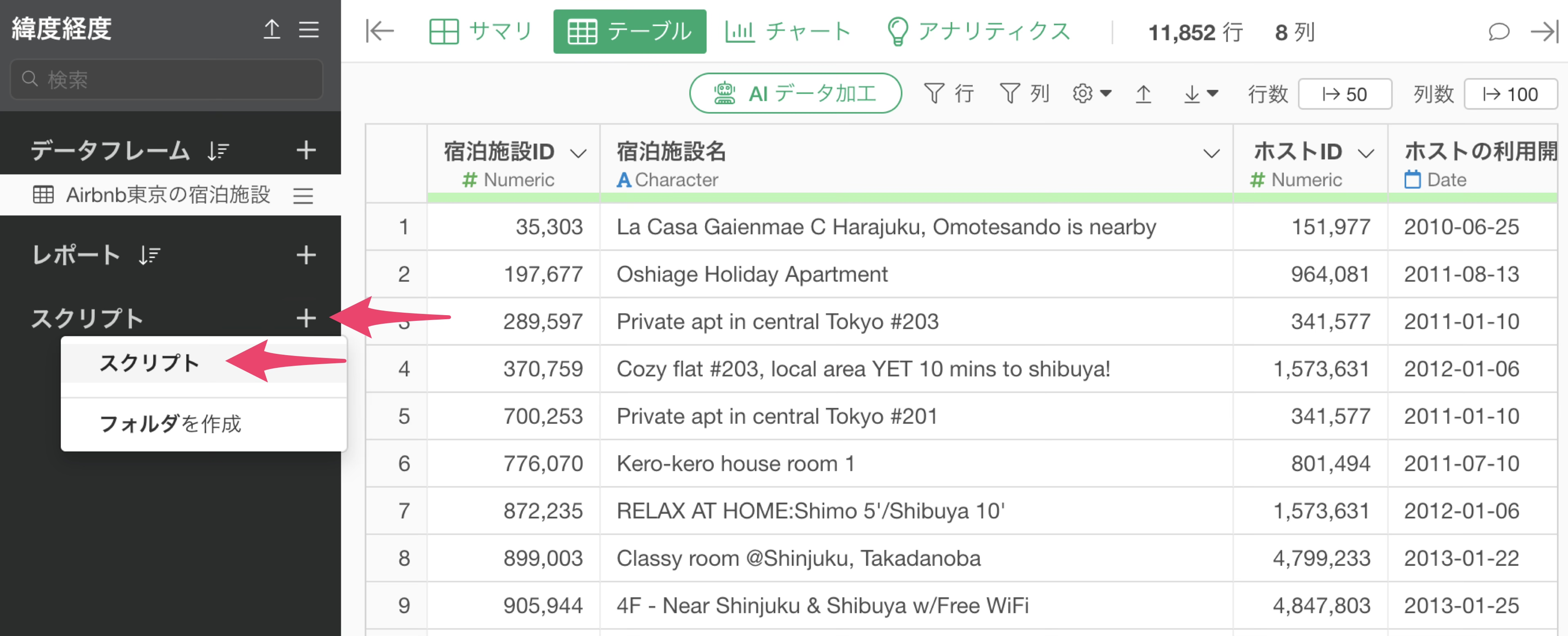 データフレームを追加ボタンをクリックして、データソースとして「Rスクリプト」を選択してください。