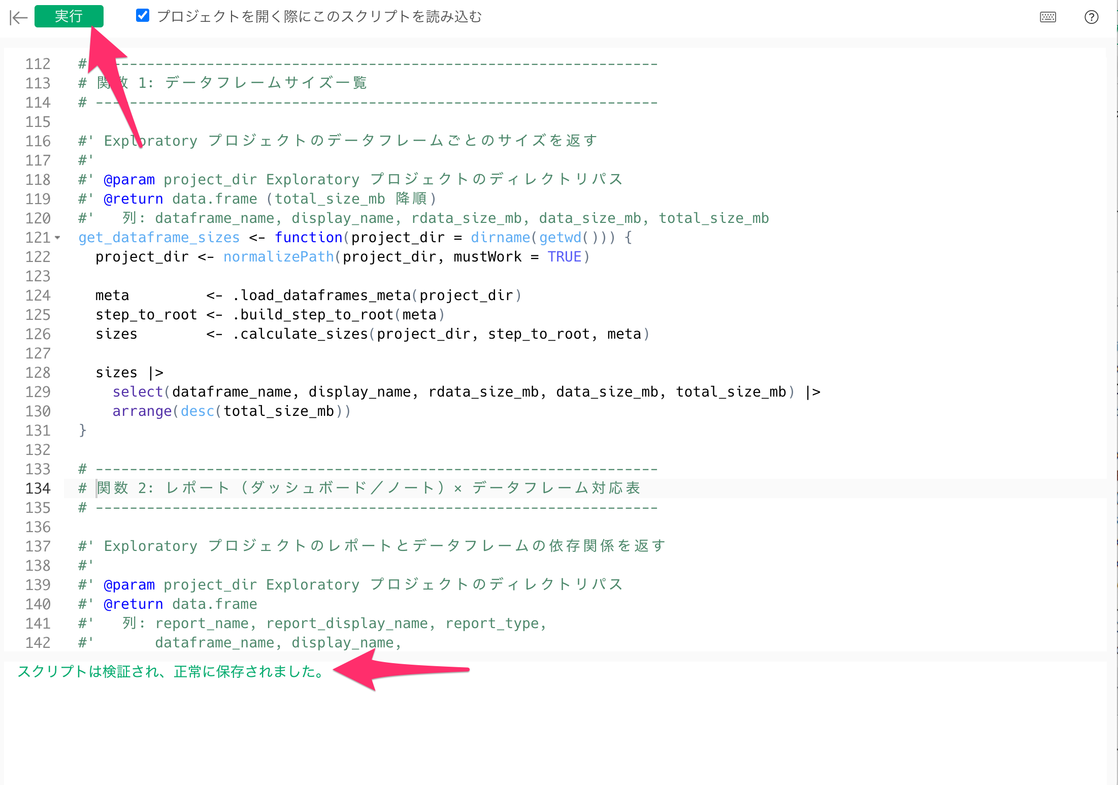 Rスクリプトのエディタが開いたら、以下のように記述して先ほど登録したスクリプトを実行します。