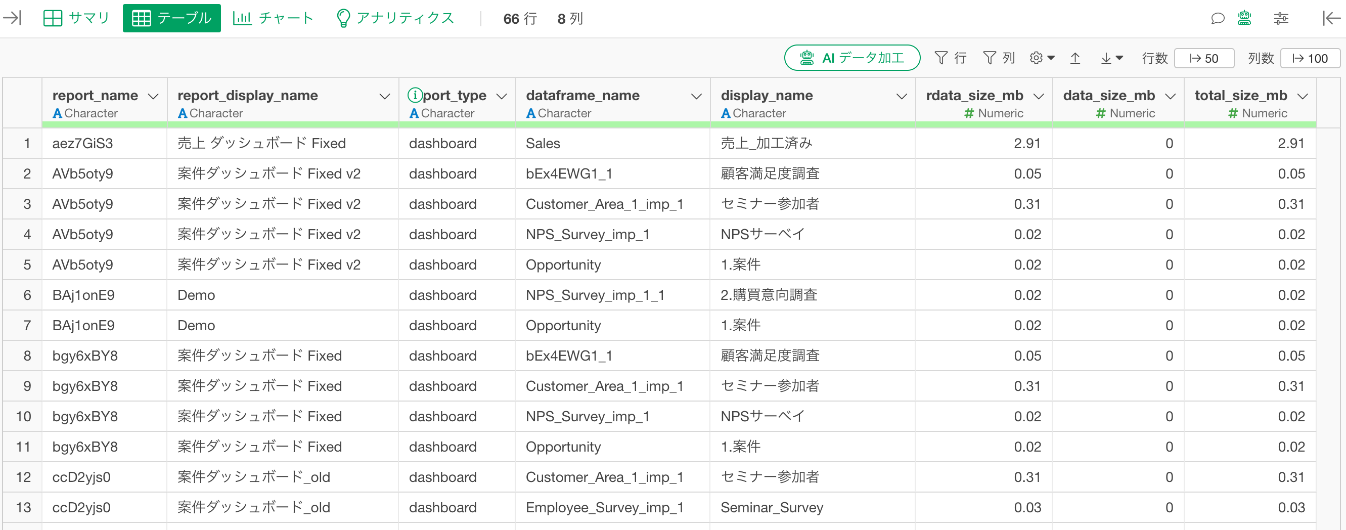 は、プロジェクト内のダッシュボードおよびノートが、どのデータフレームを参照しているかを一覧で返す関数です。レポートの種類と紐付いたデータフレームのサイズ情報をあわせて確認することができます。