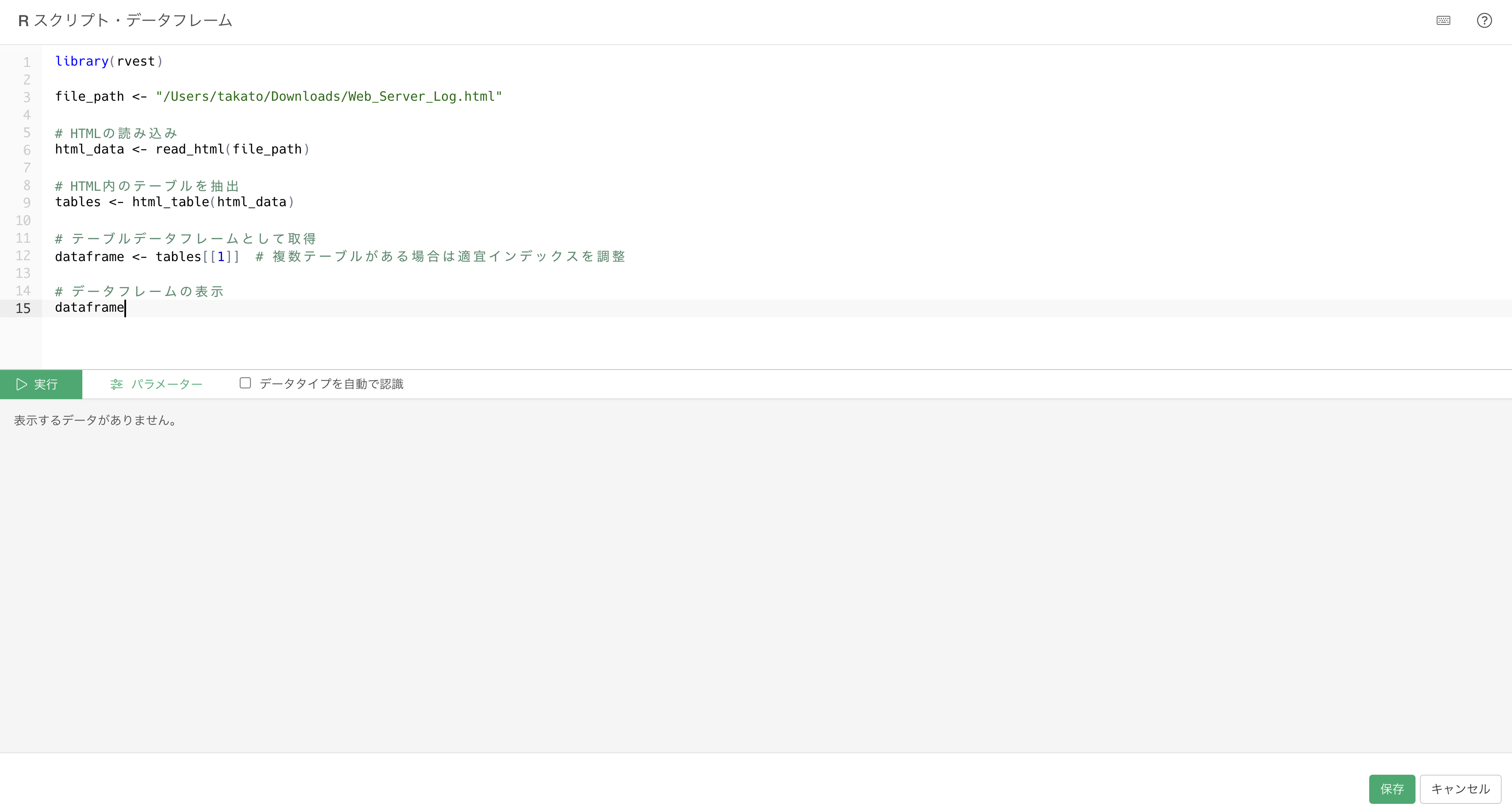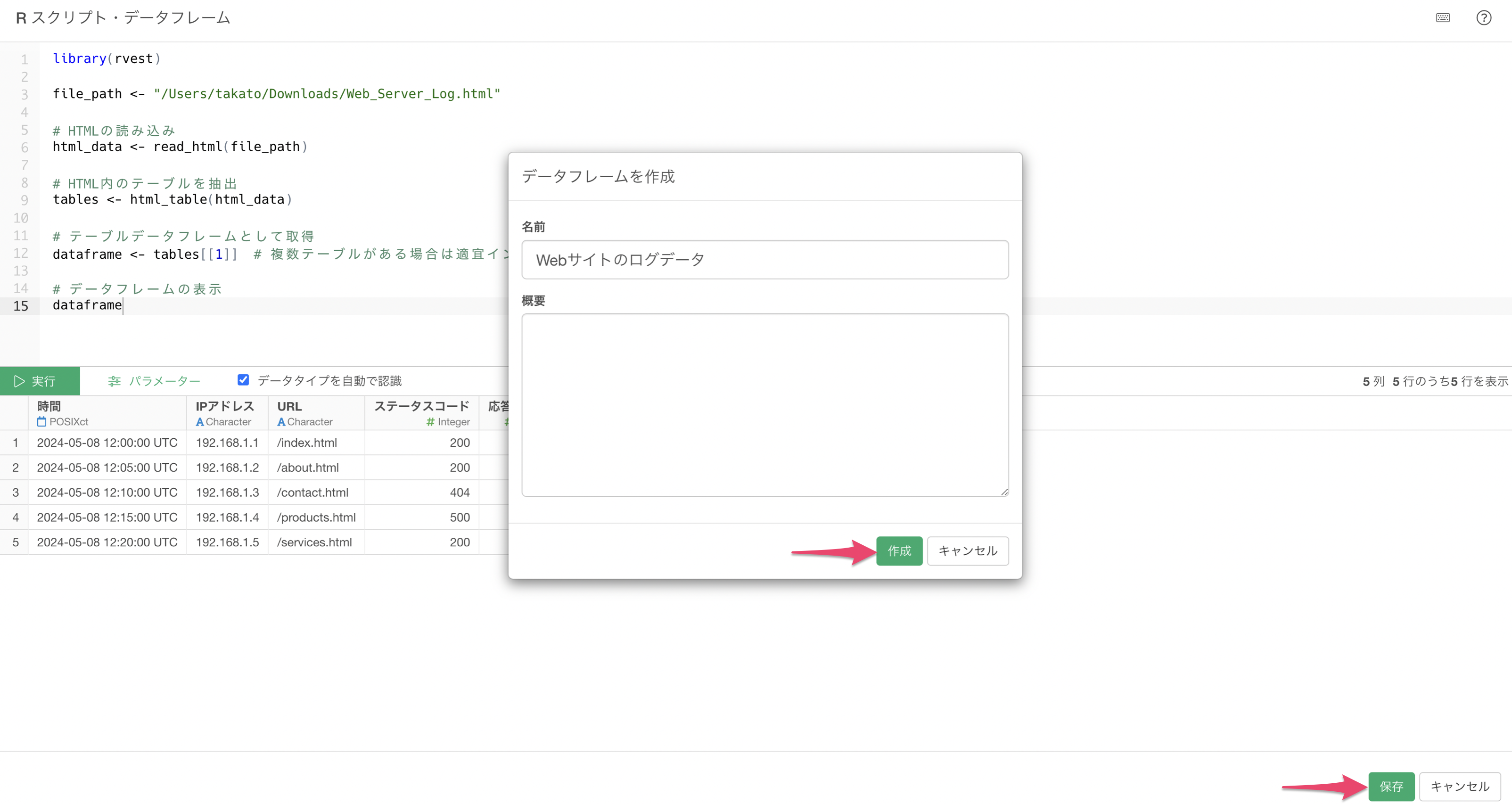 「保存」ボタンをクリックしてデータフレーム名を指定して作成します。