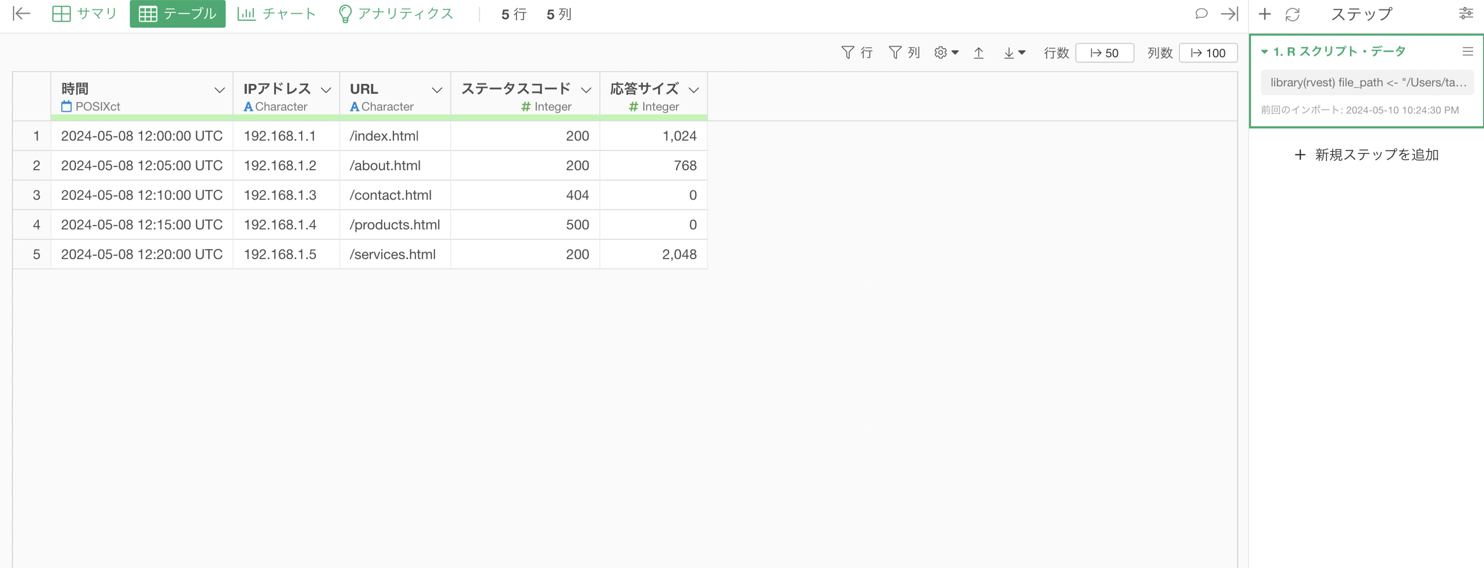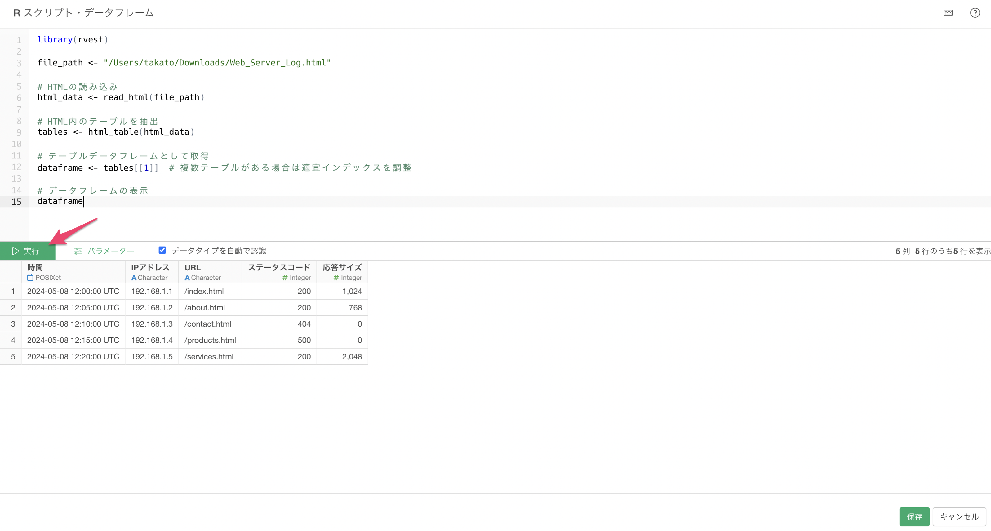実行ボタンをクリックすることで、データを正しく読み込めていることが確認できます。
