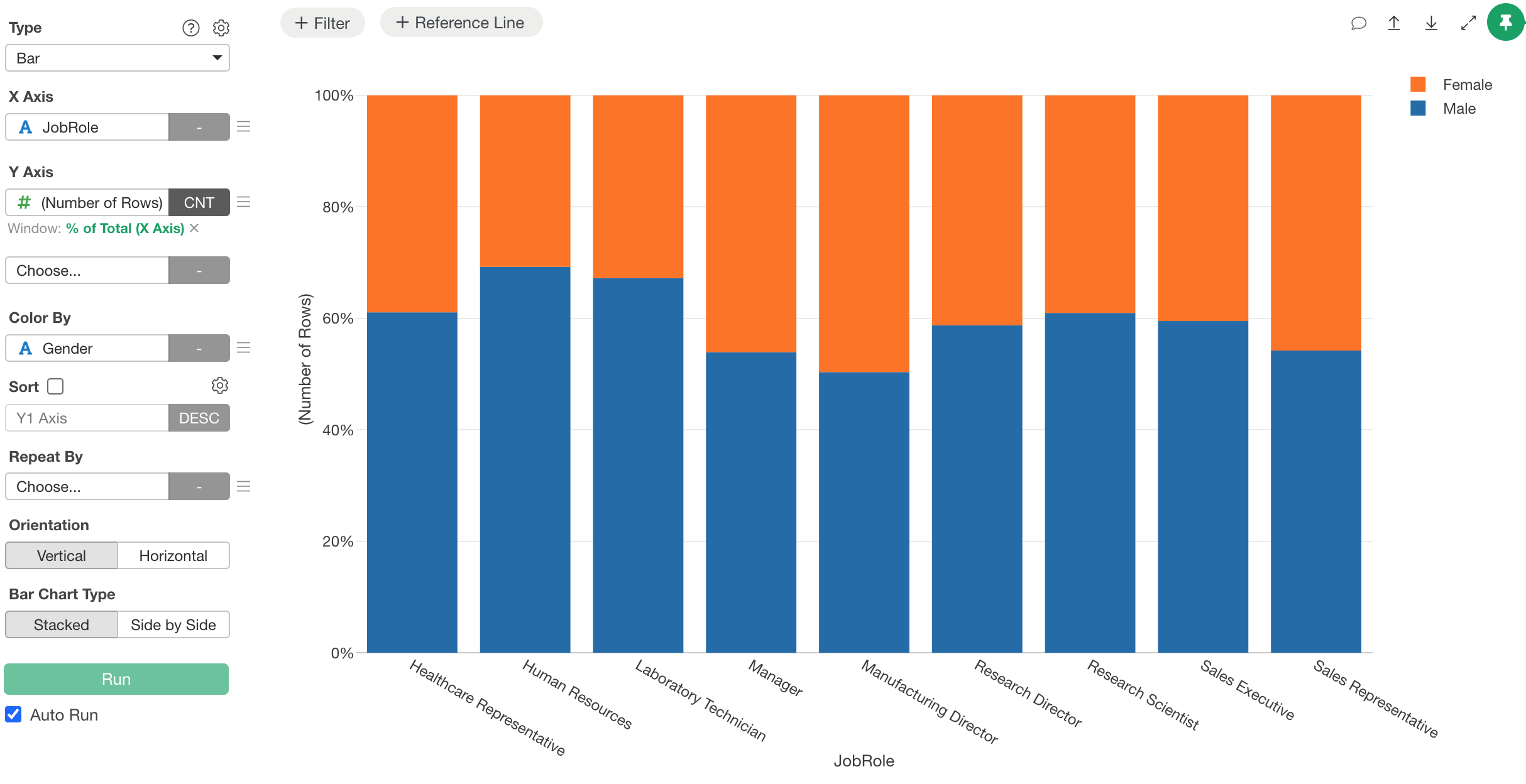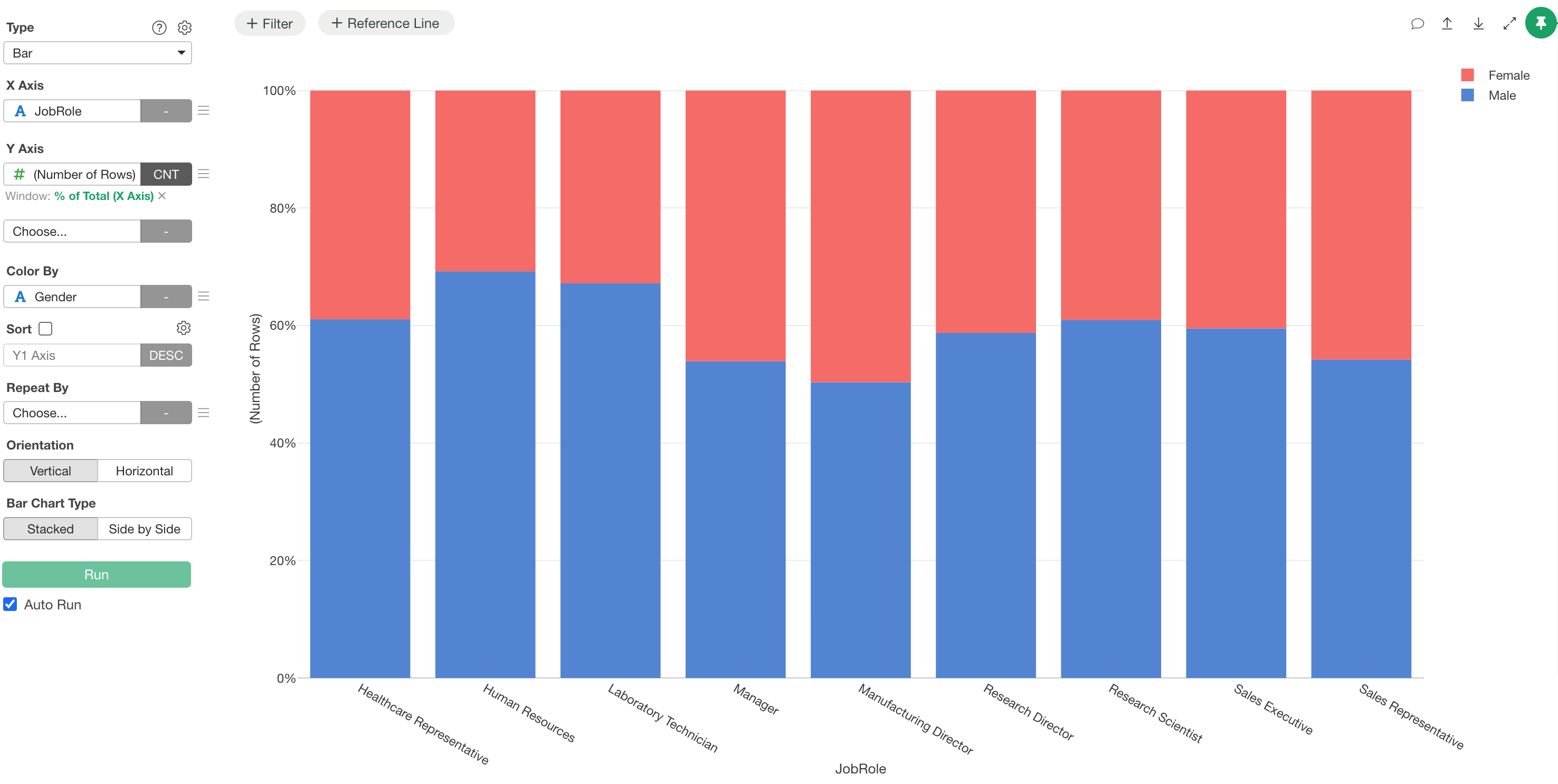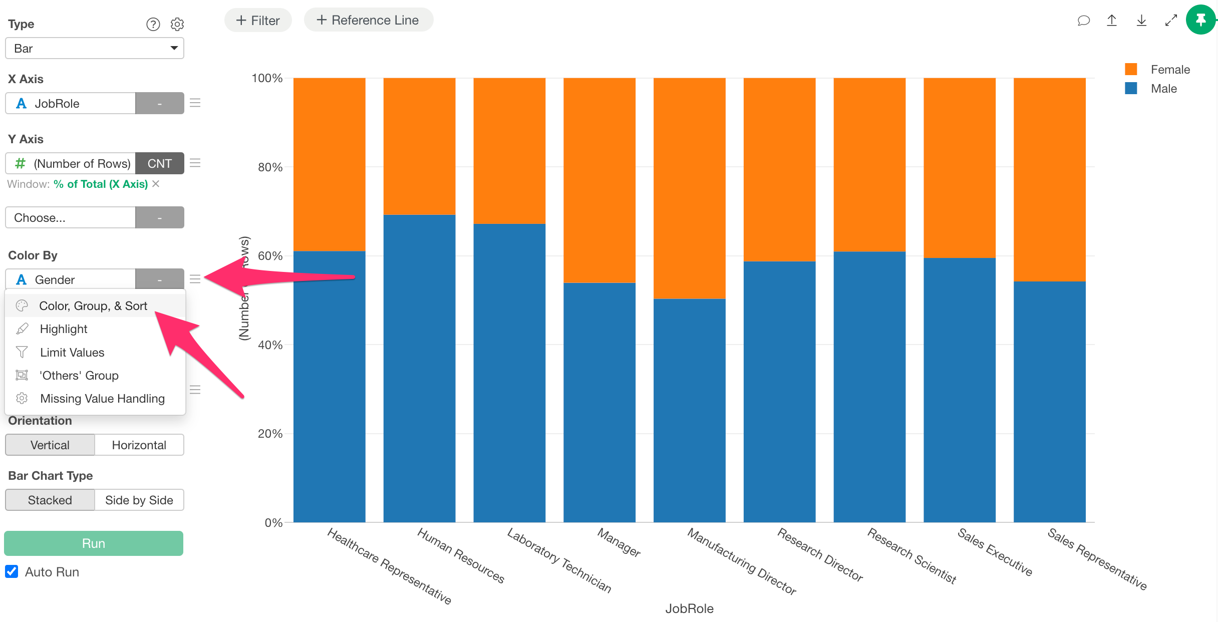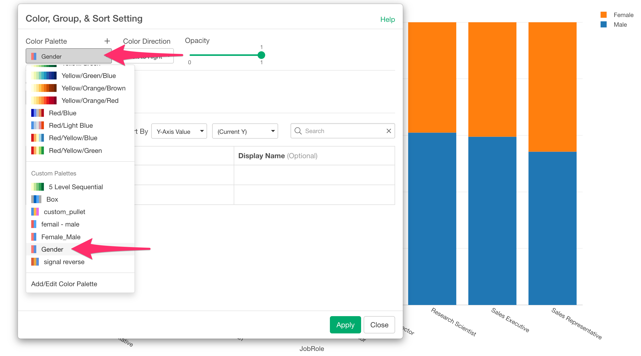 For example, suppose you have a chart like this and you want to display “Female” in pink and “Male” in blue.