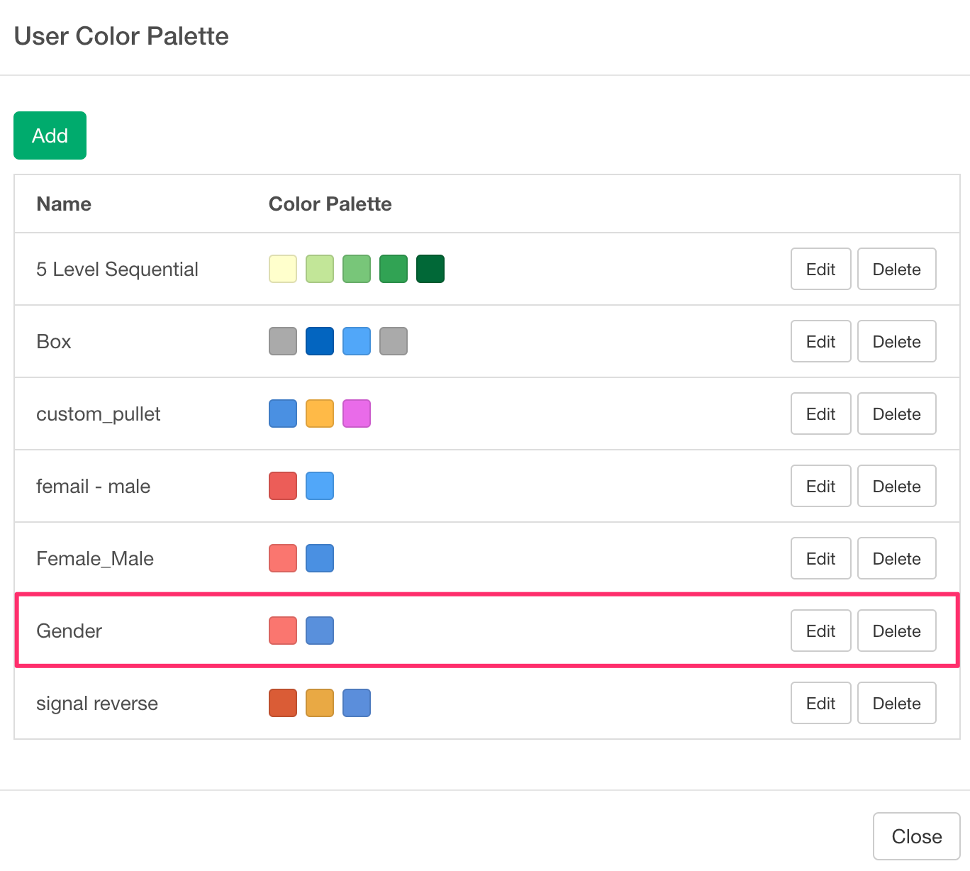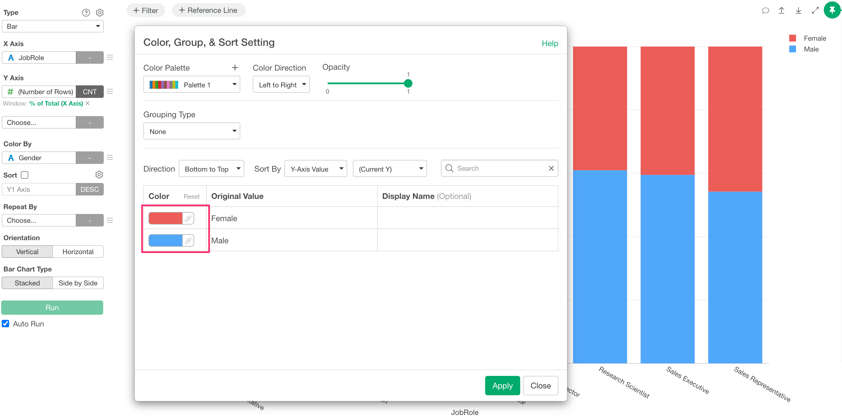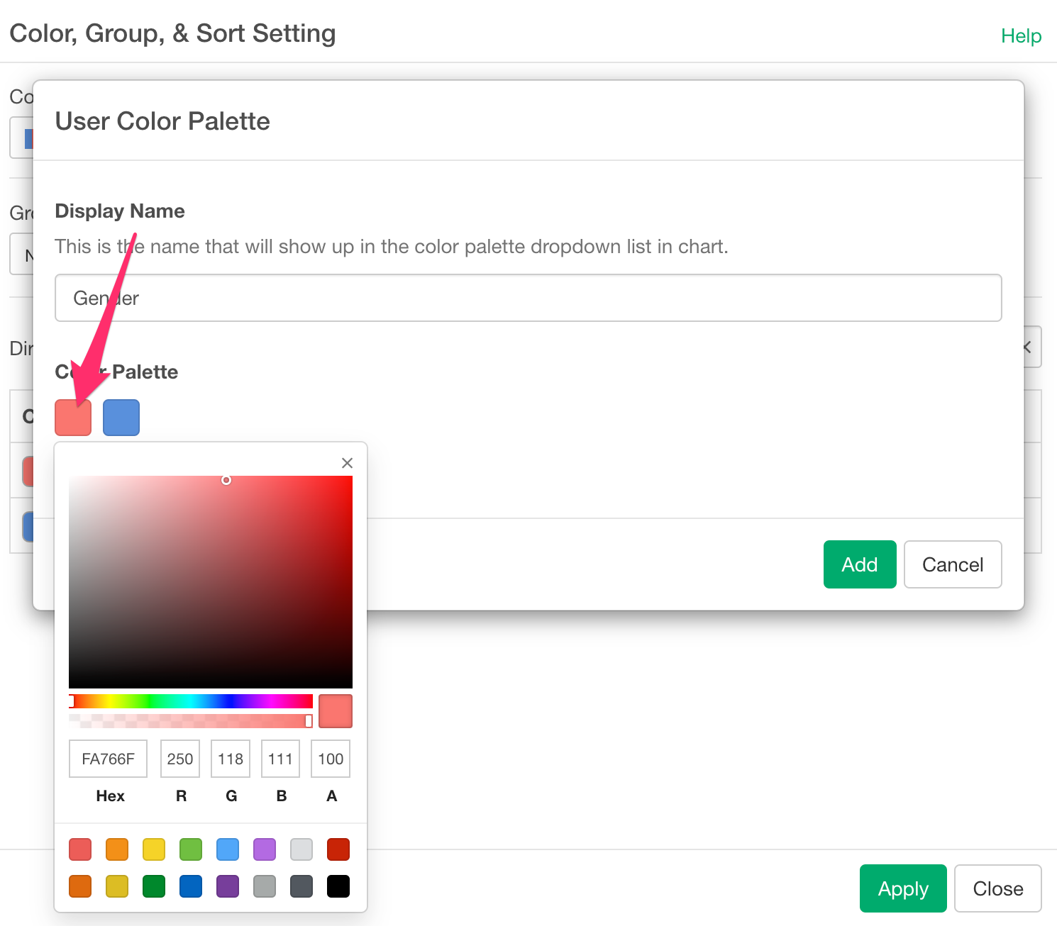 Here, you can freely specify any color you like. In this case, we will assign “Pink (Hex: FA766F)” to Female and “Blue (Hex: 4A90E2)” to Male.