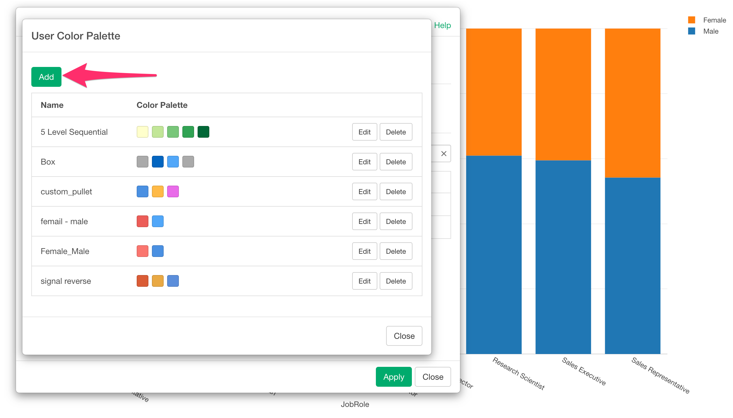 Exploratory provides a wide variety of default color palettes to represent charts beautifully. However, if you want to create a color palette that matches your company’s corporate colors or colors that align with the meaning of your data, you can use the User Color Palette feature to create your own custom-defined color palettes.