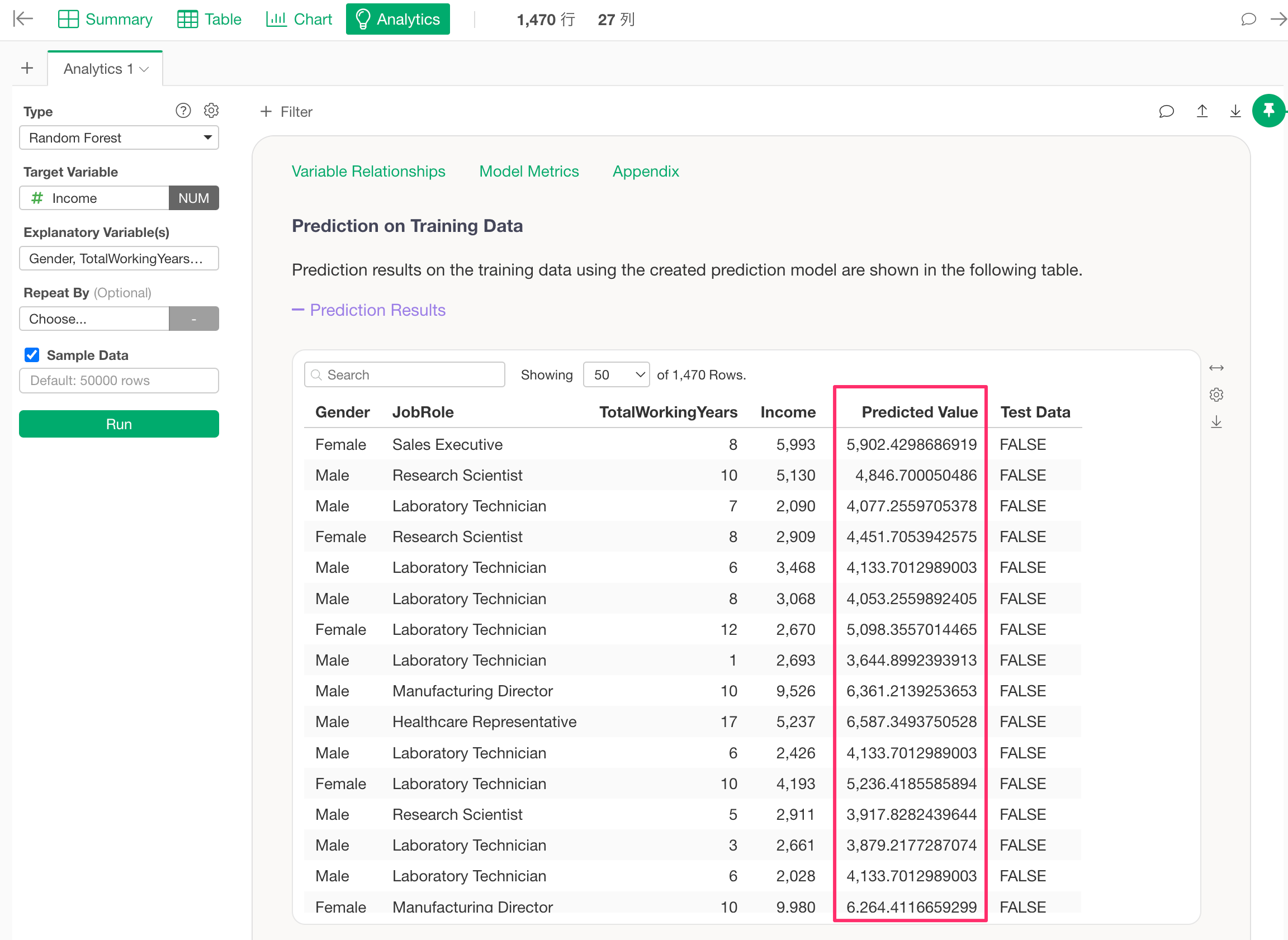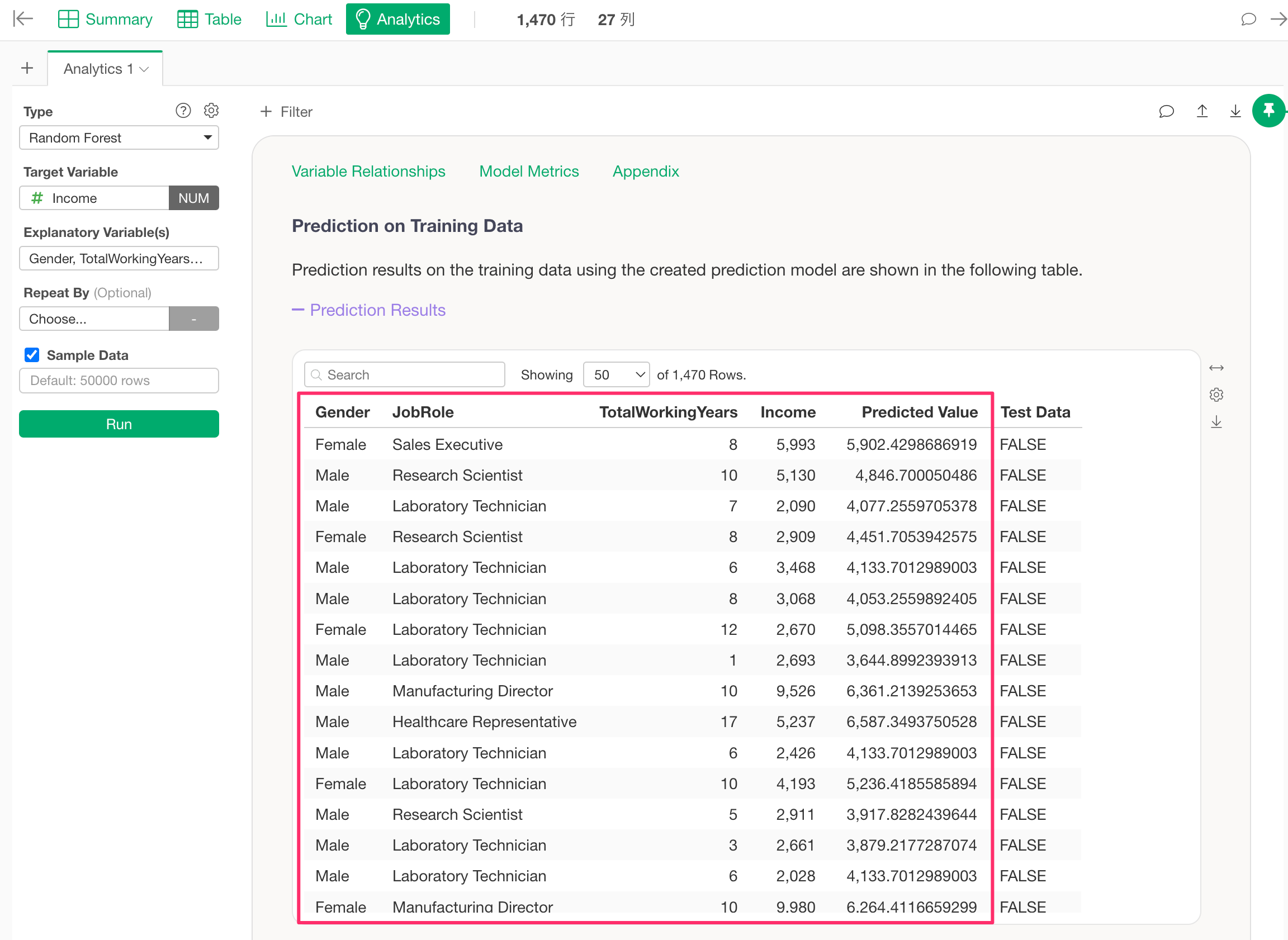 When you move to the “Prediction on Training Data” section and display the prediction results, you can see that the prediction results are shown alongside the columns used for the target and explanatory variables.
