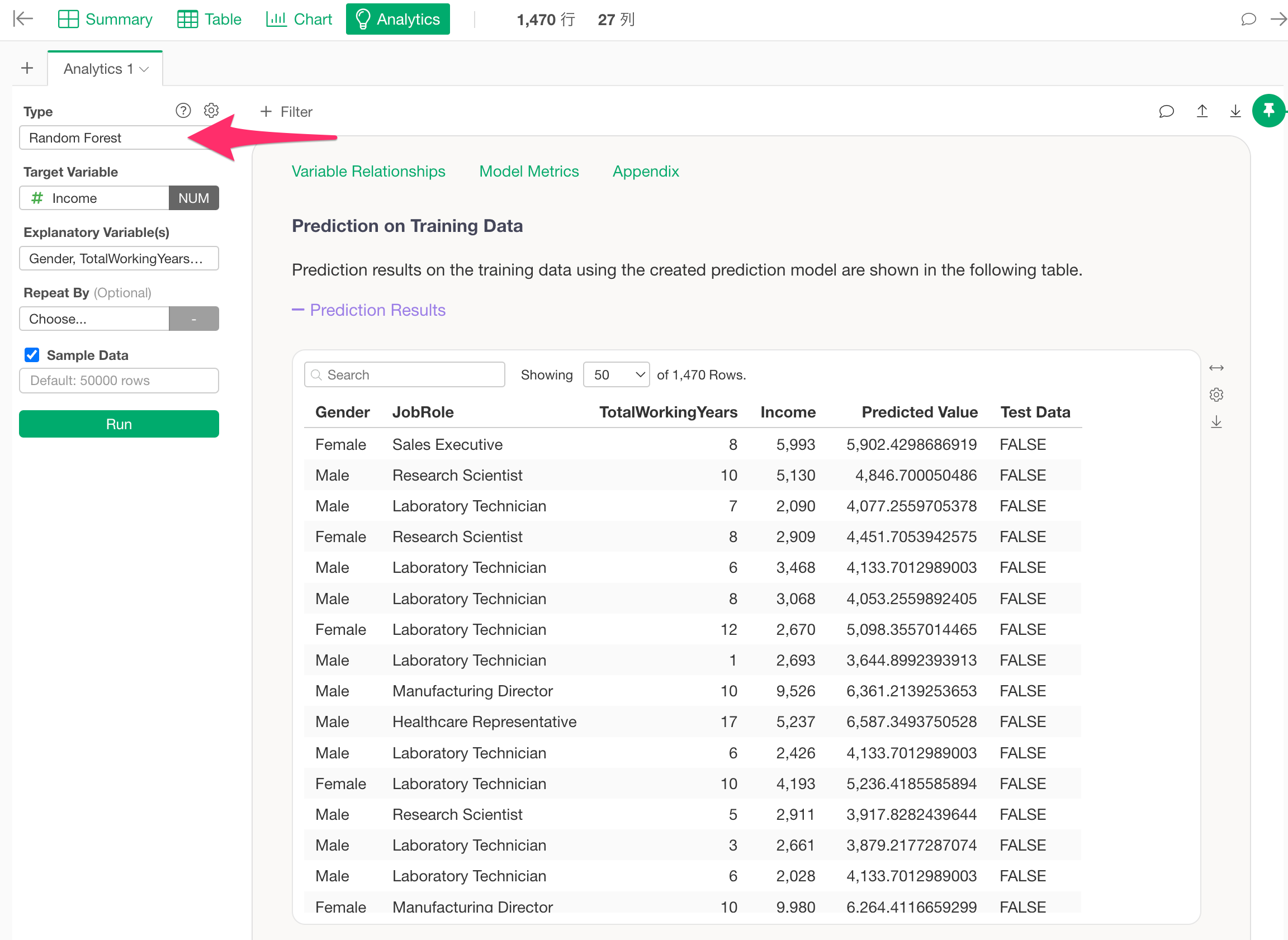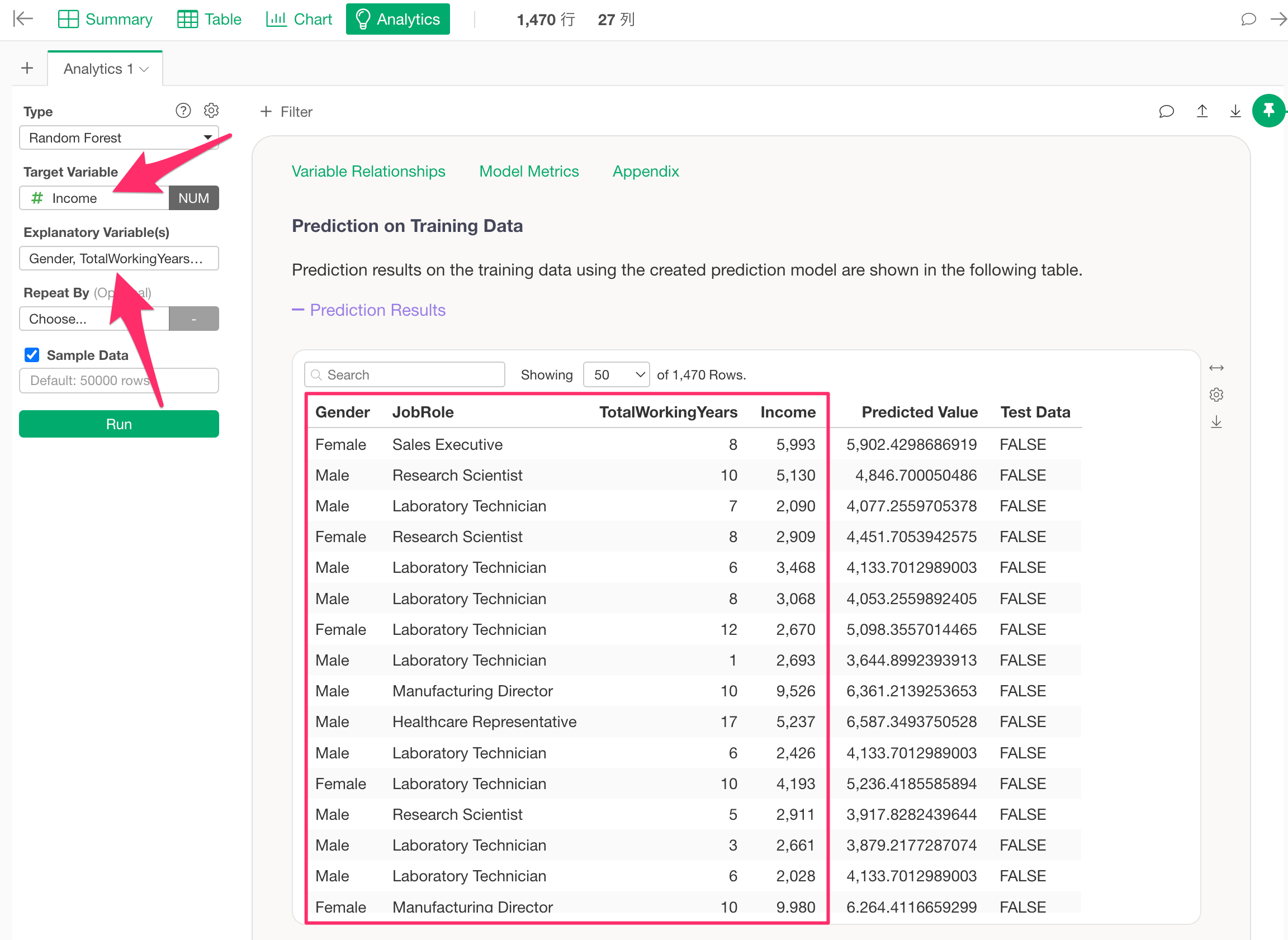 For instance, suppose you have previously built a Random Forest model using this data with “Income” as the target variable and “Gender,” “Total Working Years,” and “Job Role” as explanatory variables.