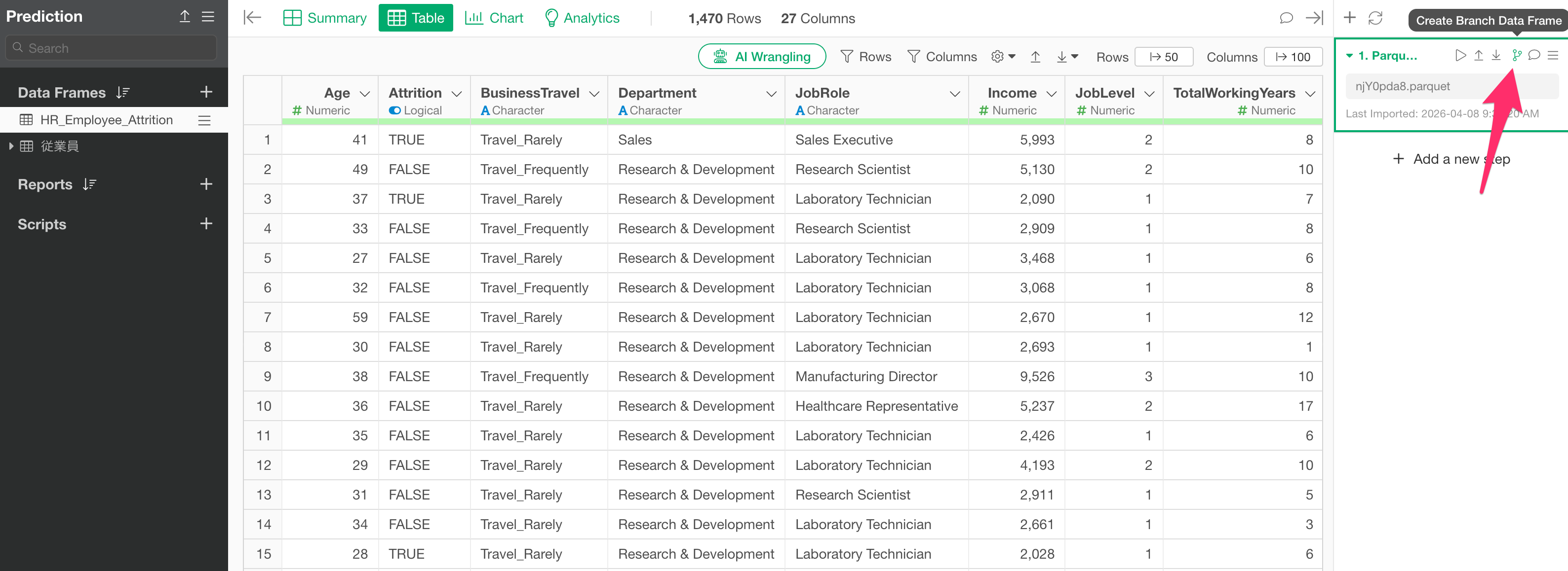 For this example, we will use data where each row represents one employee, and the columns contain attribute information such as age, gender, salary, job role, years of service, number of companies worked for, overtime status, and travel frequency.