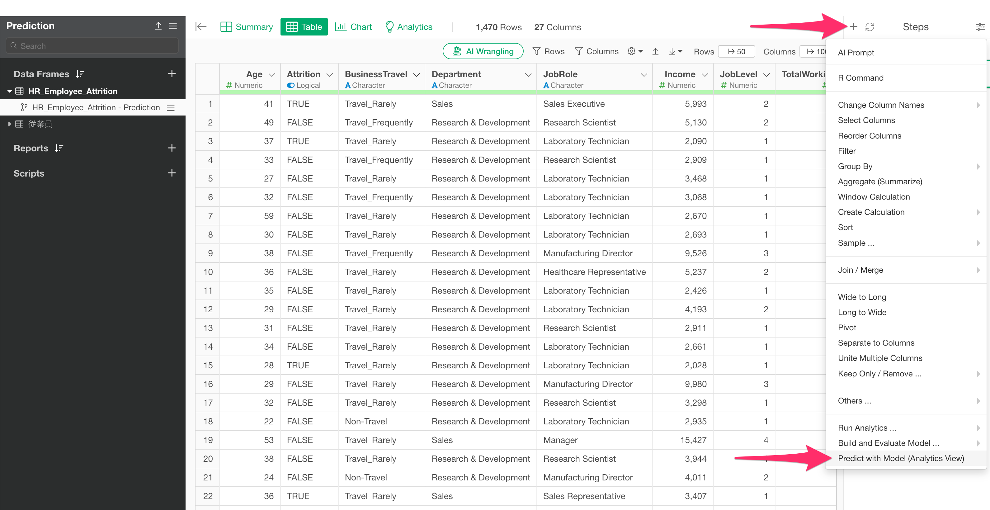 Therefore, to add prediction results to data that includes columns contained in the original data but not used as explanatory variables, you need to process the data.