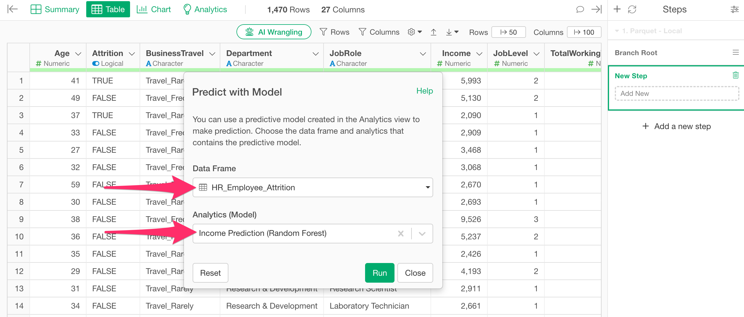 When the prediction dialog opens, select the “Data Frame” and the “Analytics (Model)” where the prediction model was built, then click the Run button.