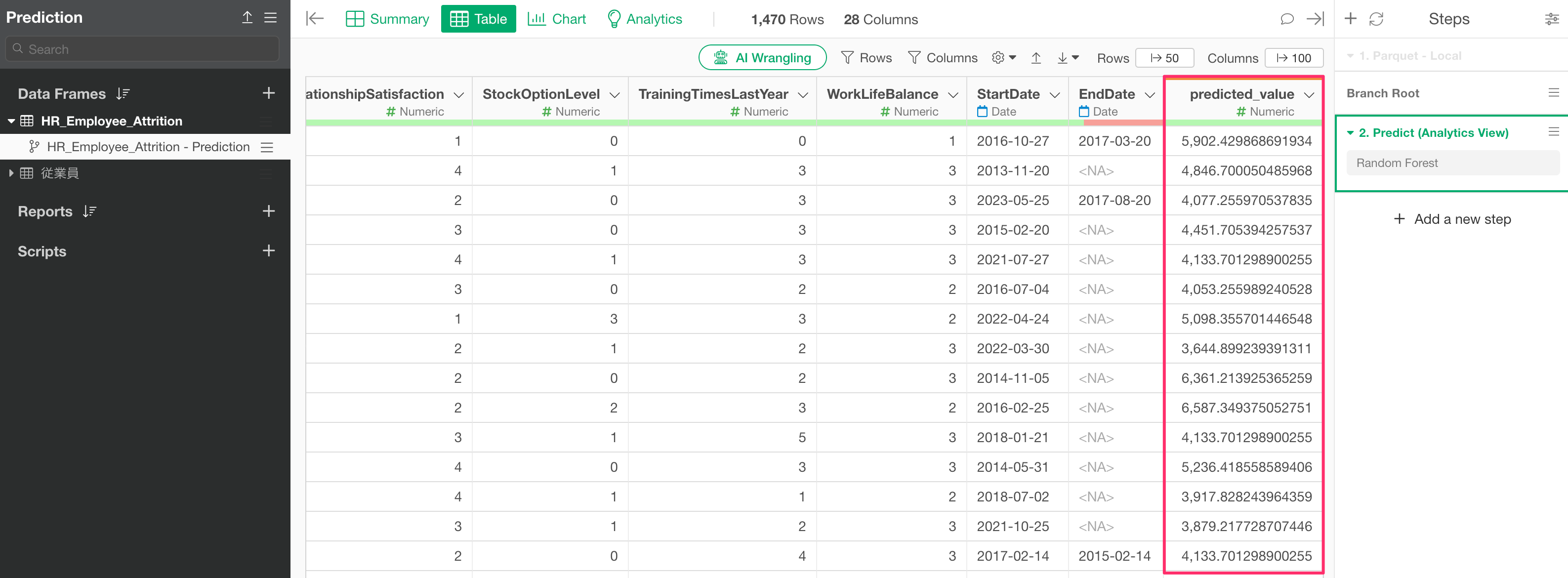 However, in this view, information from columns not used as explanatory variables, such as “Age” or “Number of Companies Worked For,” is not included.