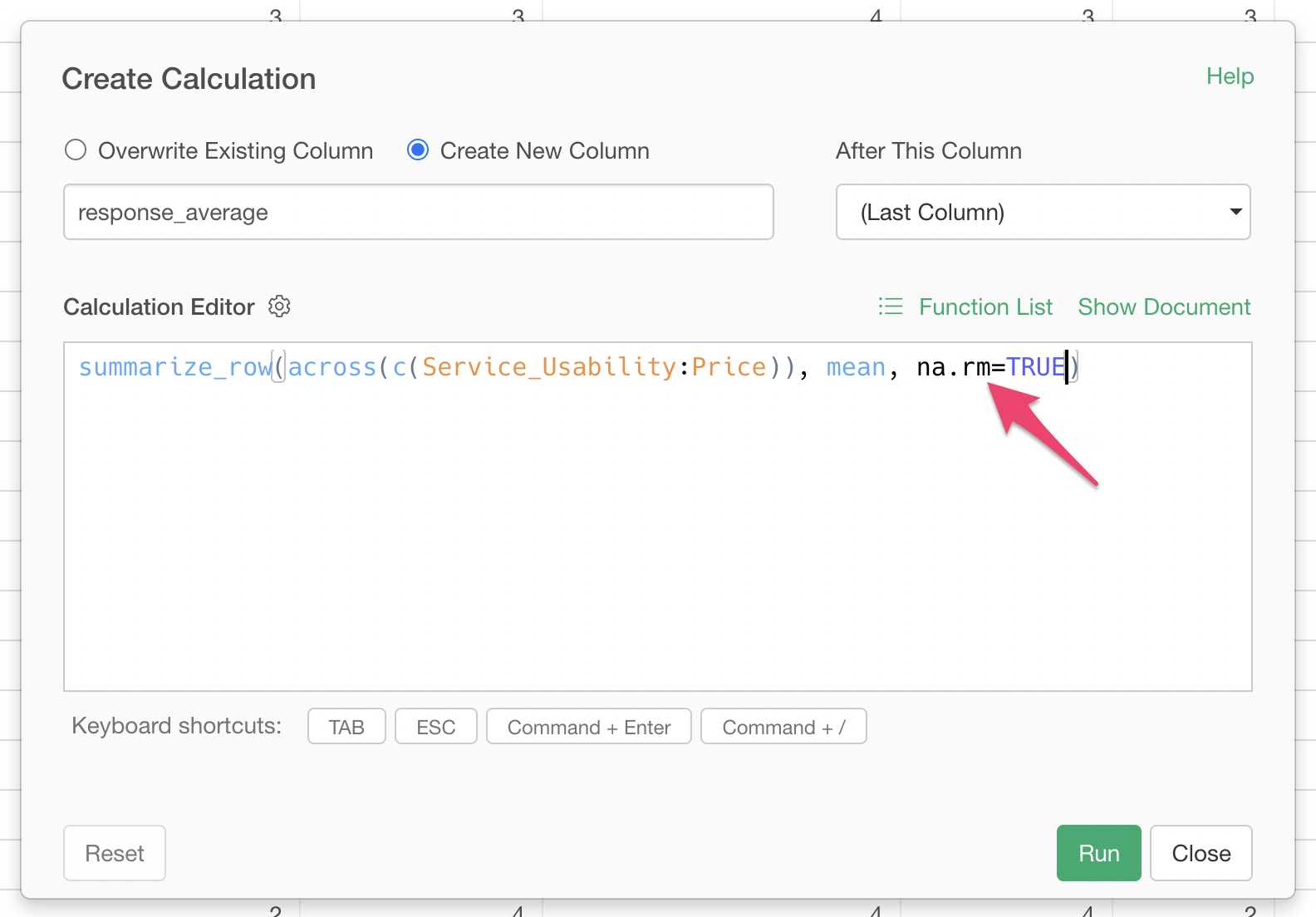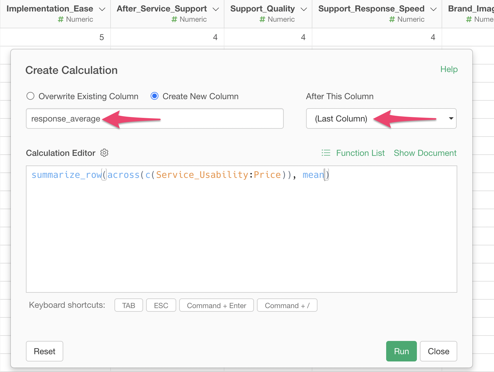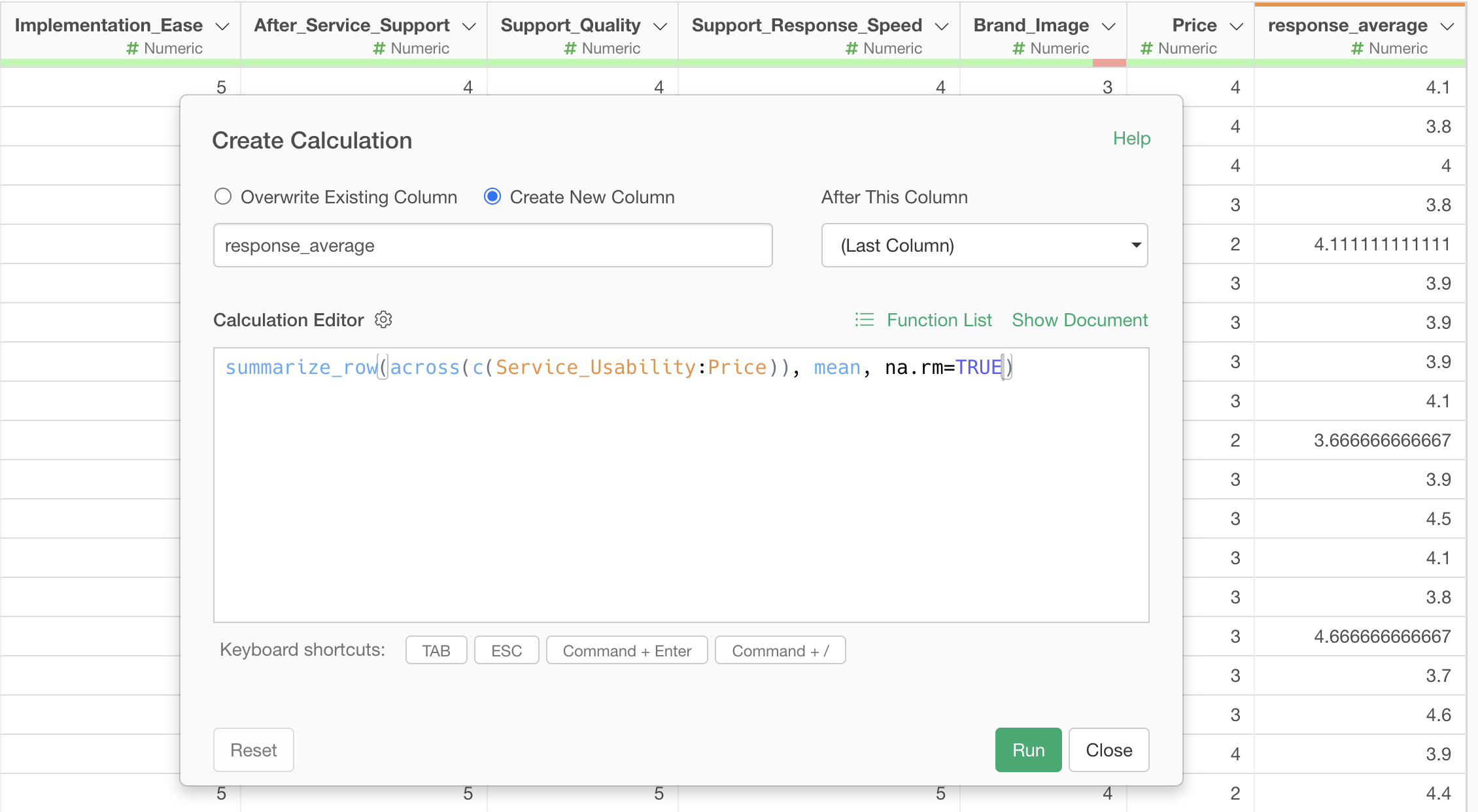 Check “Create New Column”, set the column name to “Average Response”, and select “Last Column” for where to create this column, then execute.