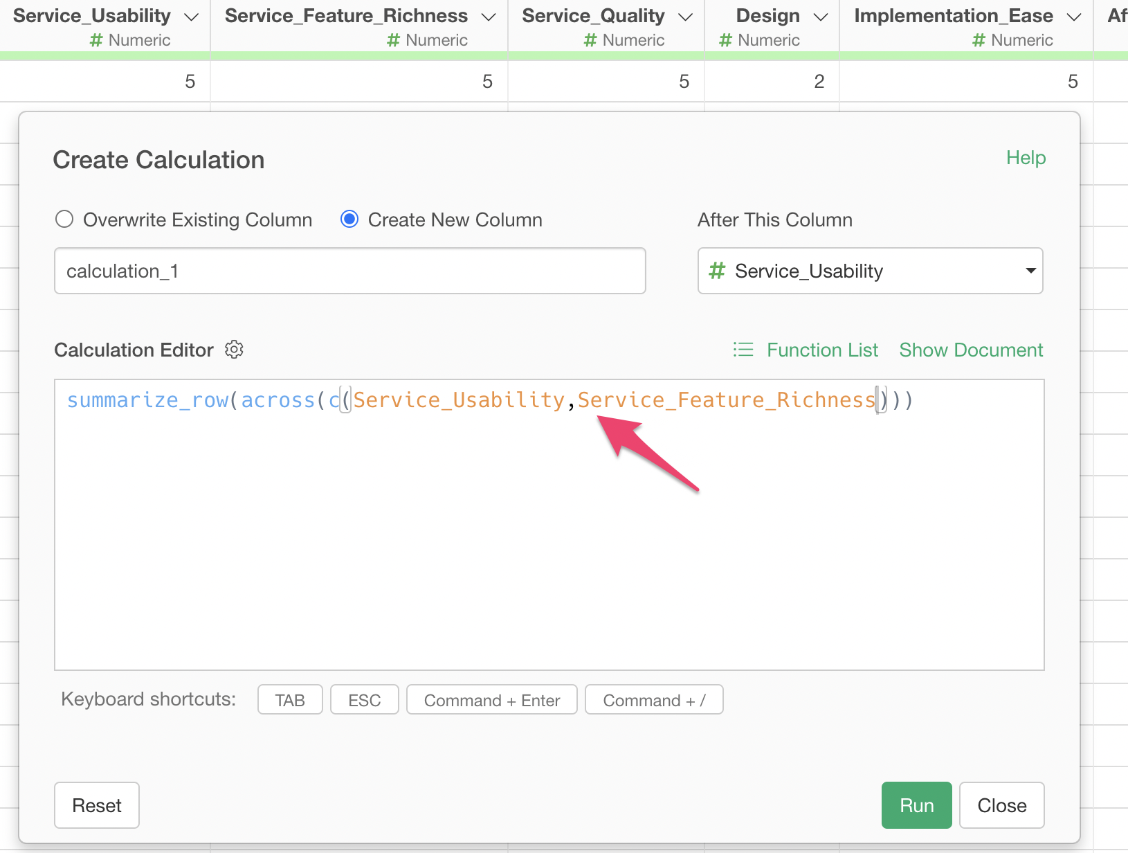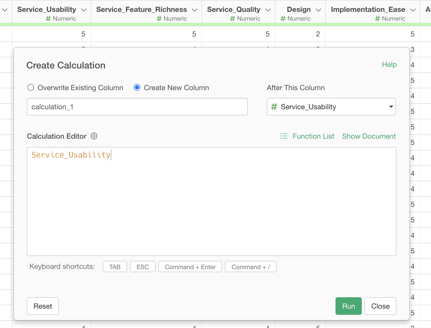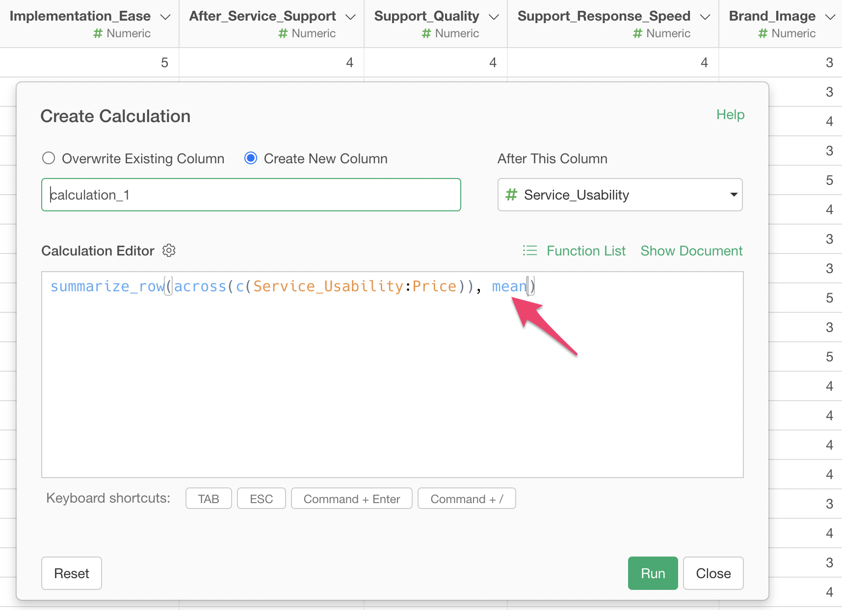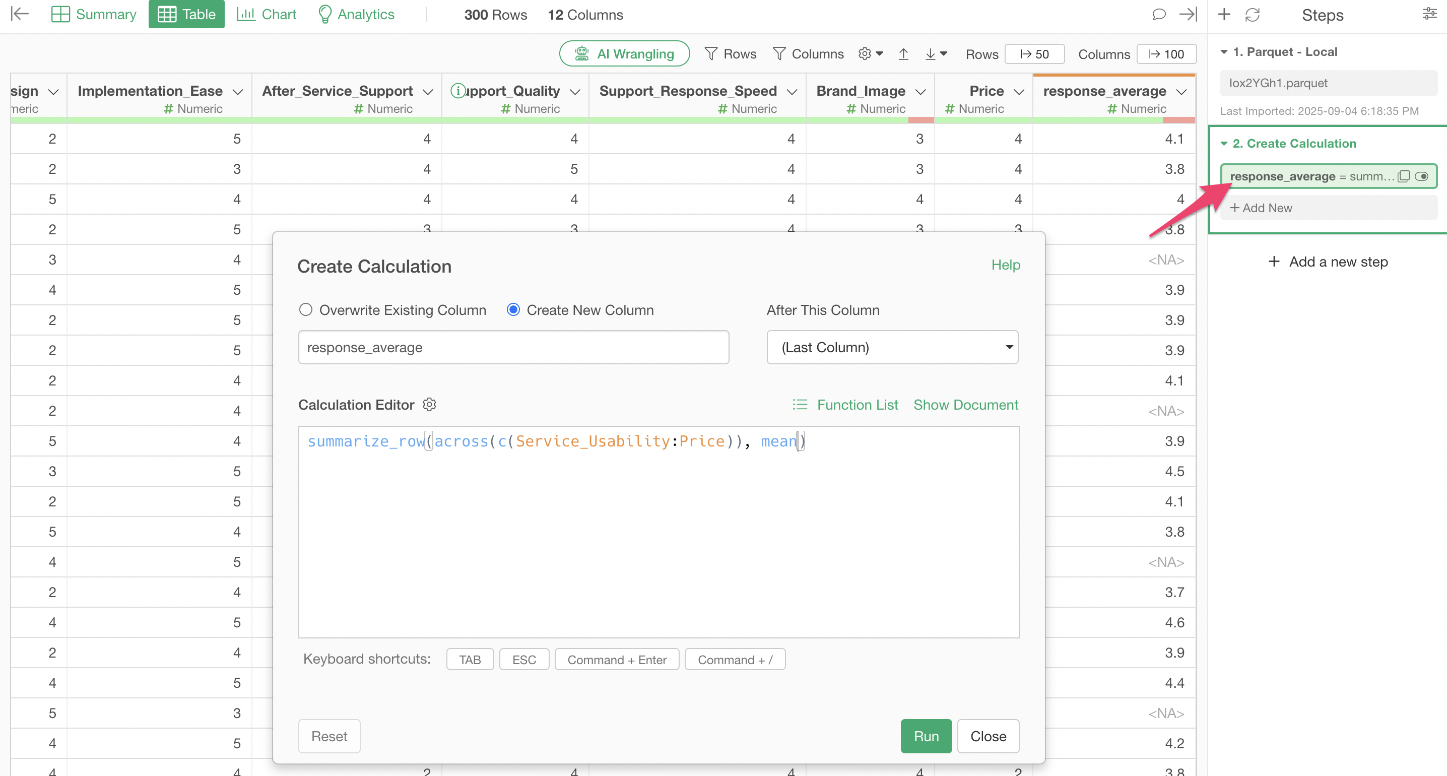 Check “Create New Column”, set the column name to “Average Response”, and select “Last Column” for where to create this column, then execute.