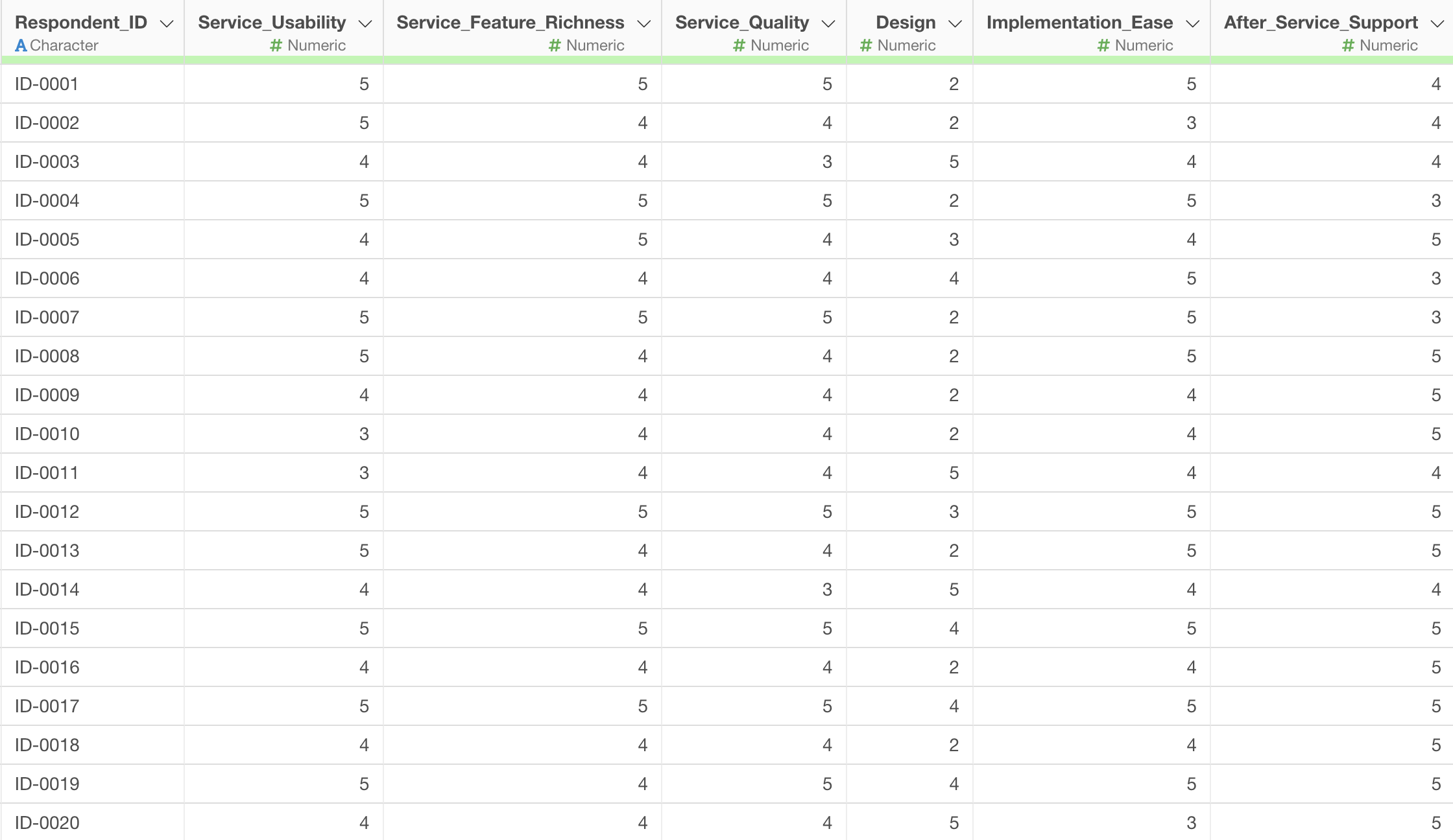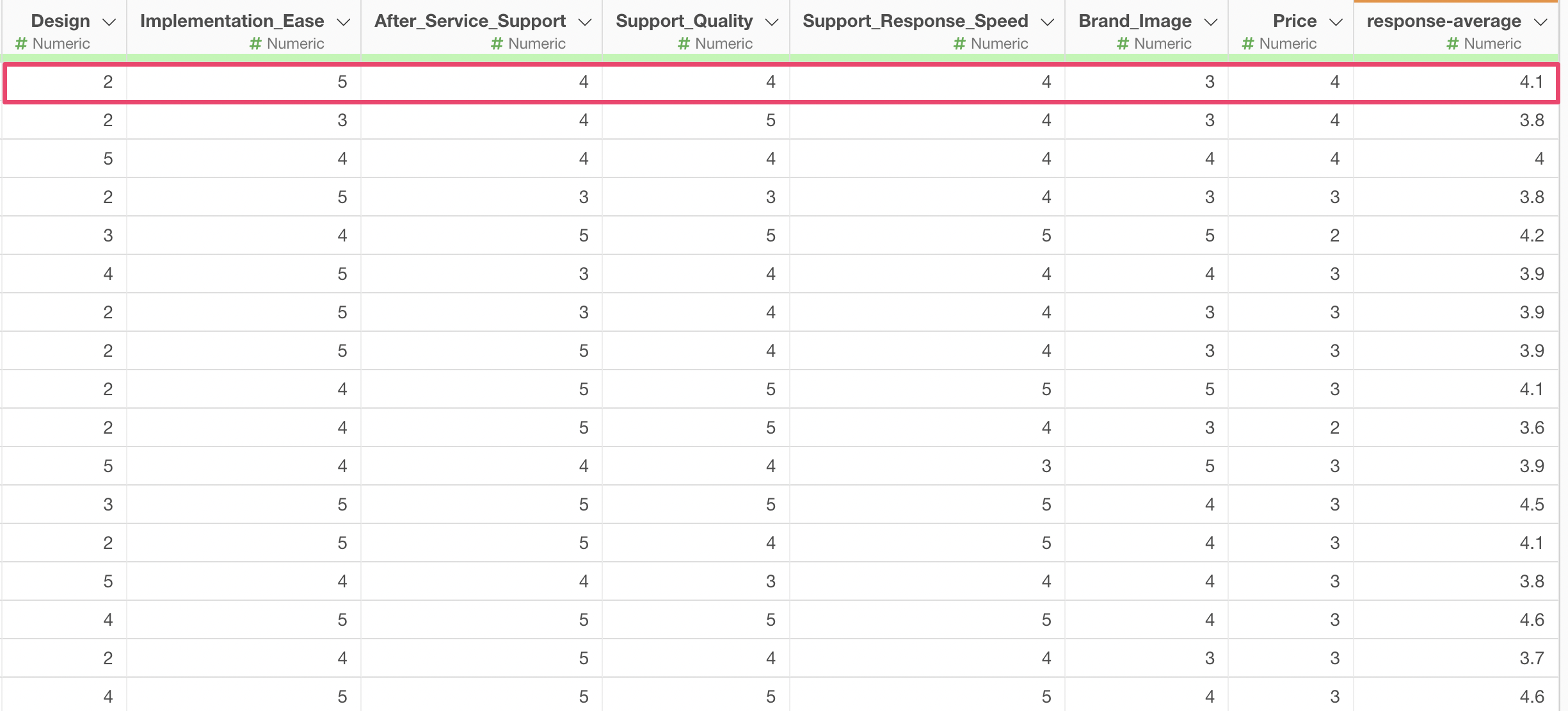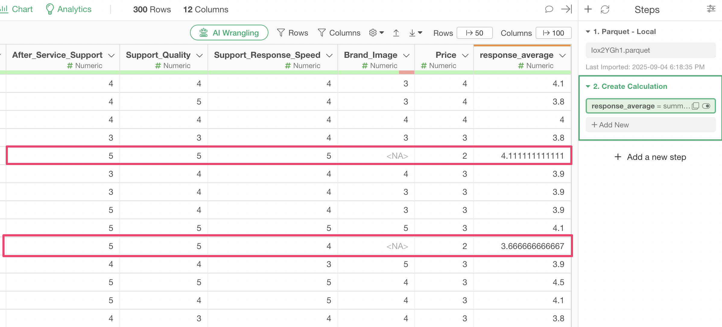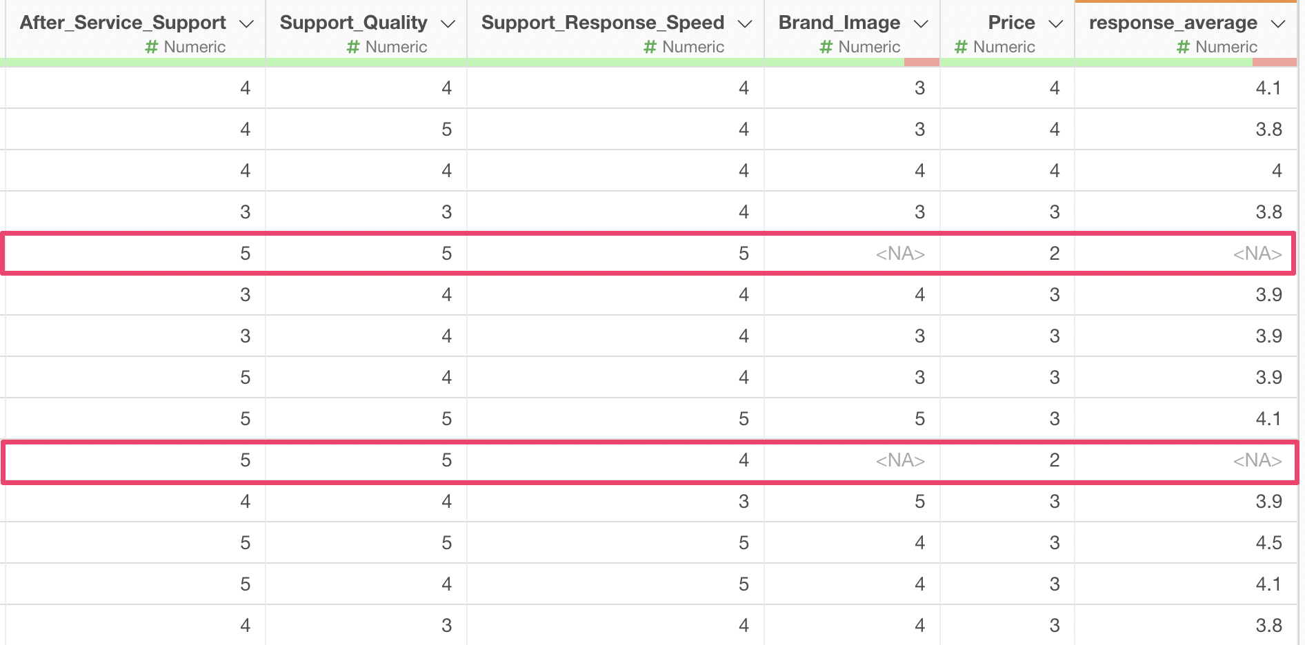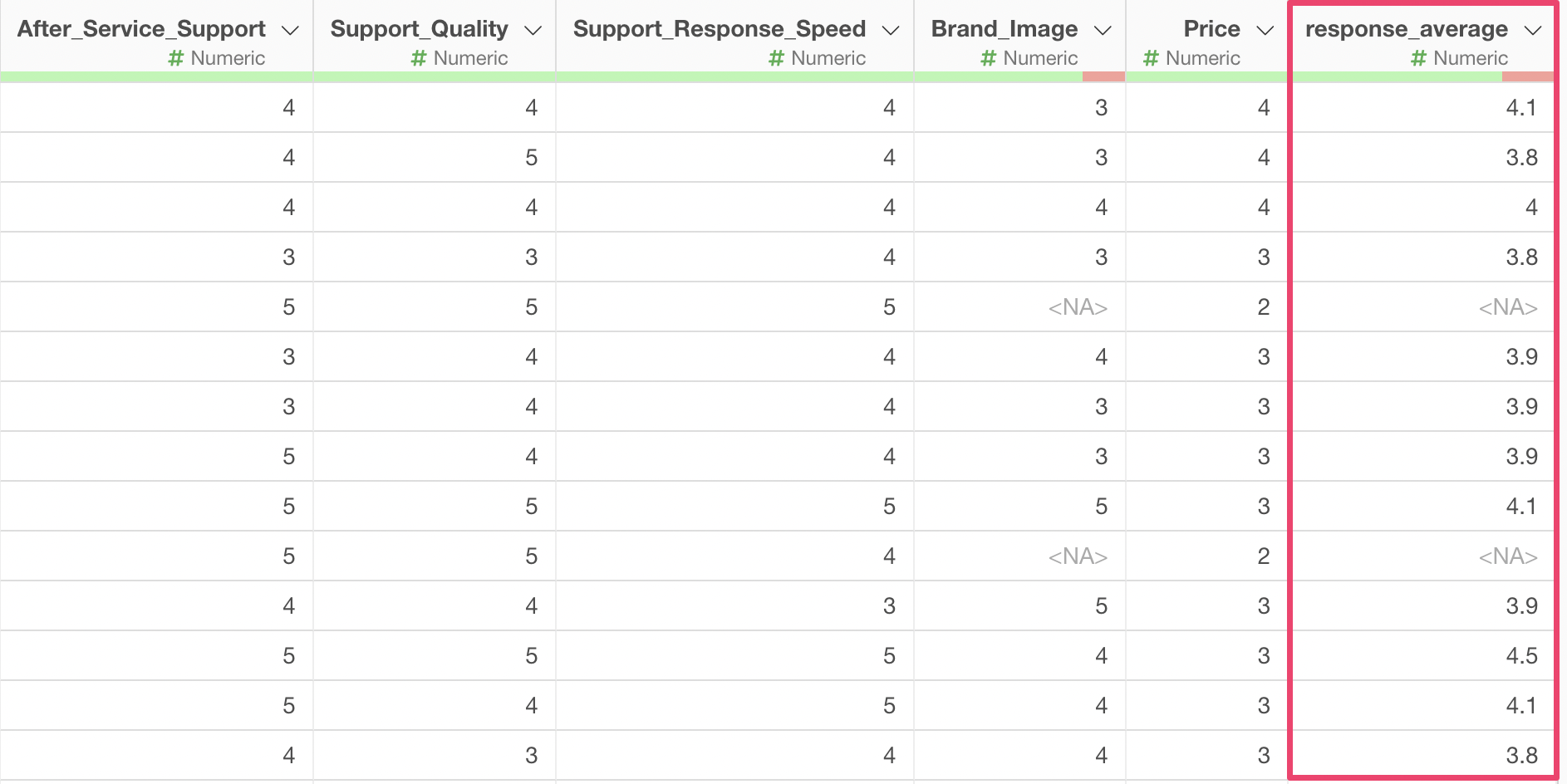 However, some values are missing (NA). The reason for this is that if even one missing value exists in the columns from “Service Usability” to “Support Response Speed” that are being calculated, the calculation result will also be returned as a missing value.
