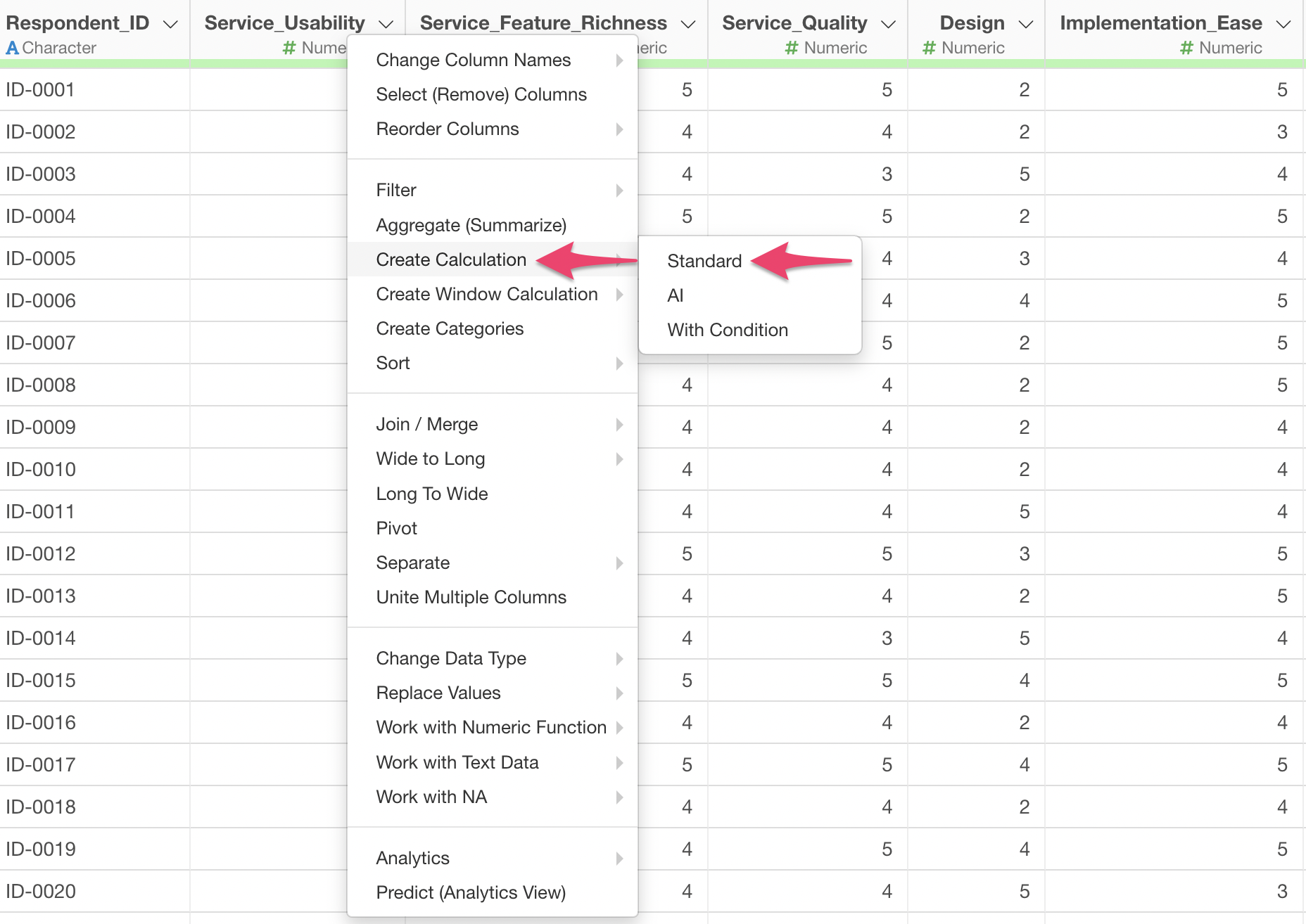 From the column header menu, select “Standard” under “Create Calculation”.