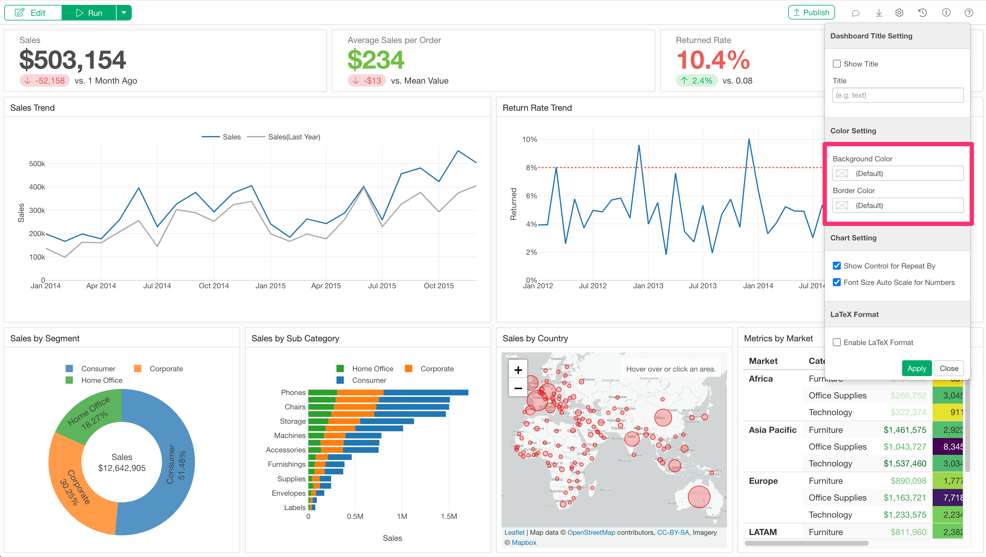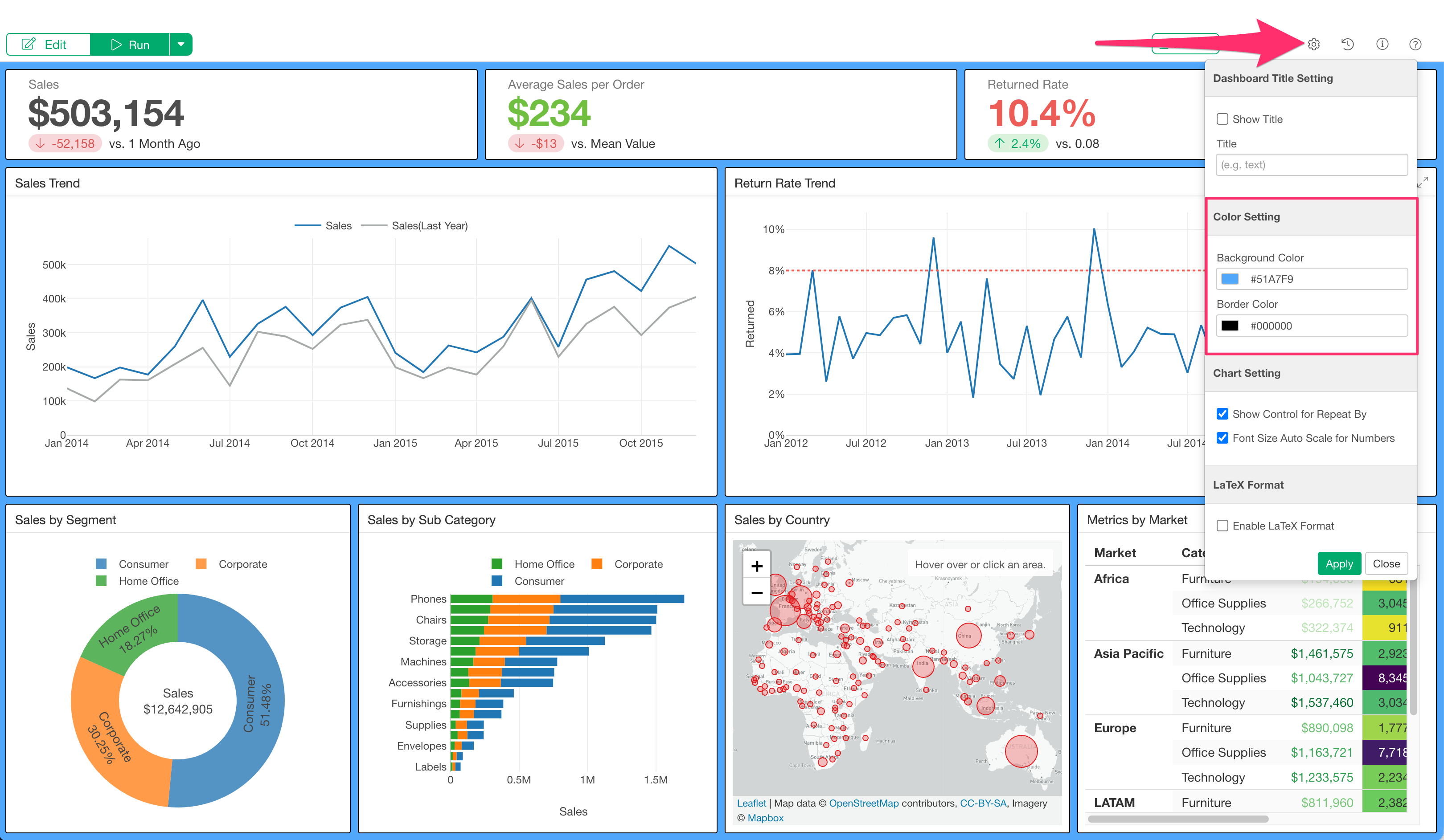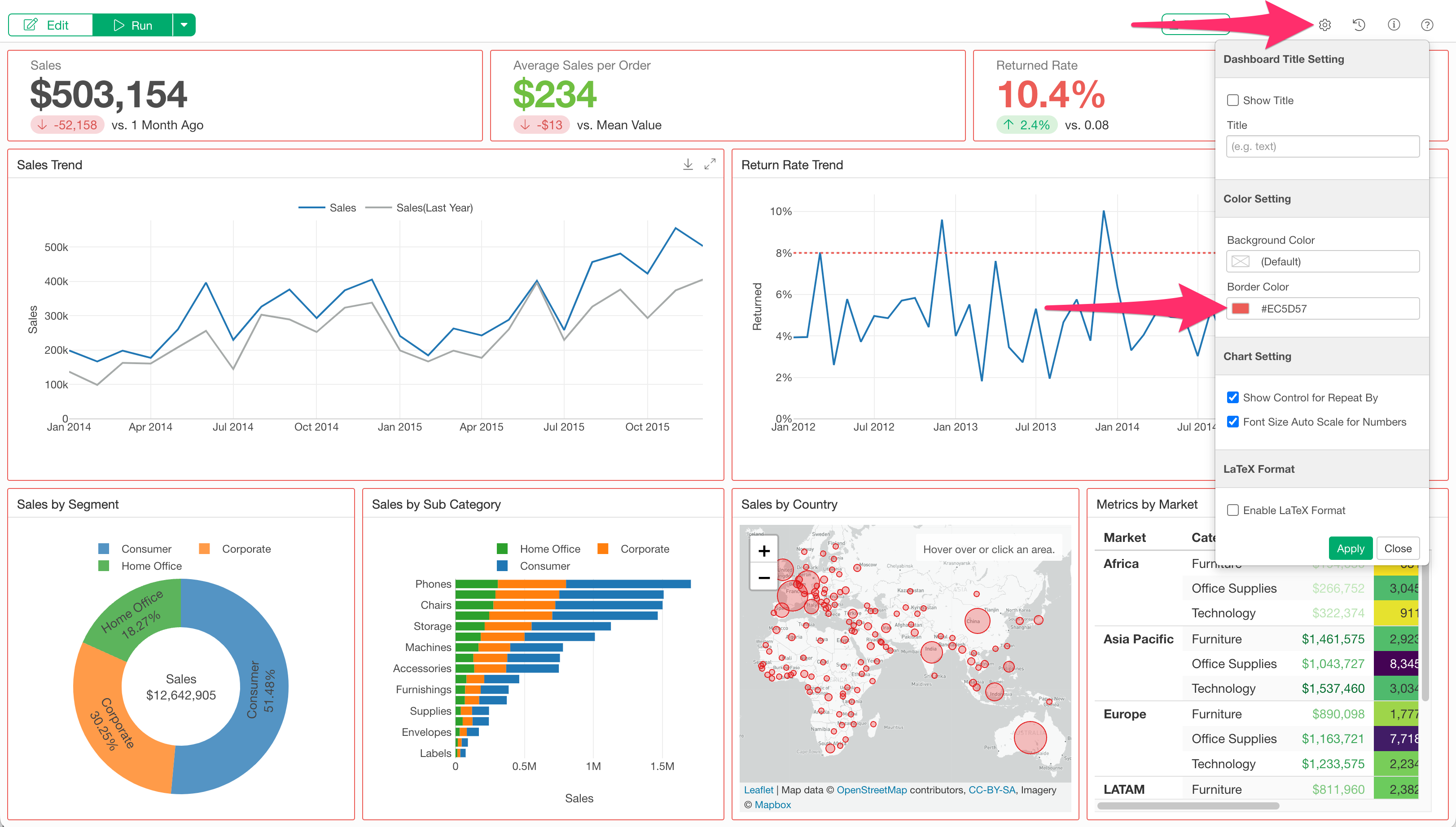 Starting from Exploratory Desktop v14.5, you can now change the background color and content border color directly from the Dashboard settings dialog.