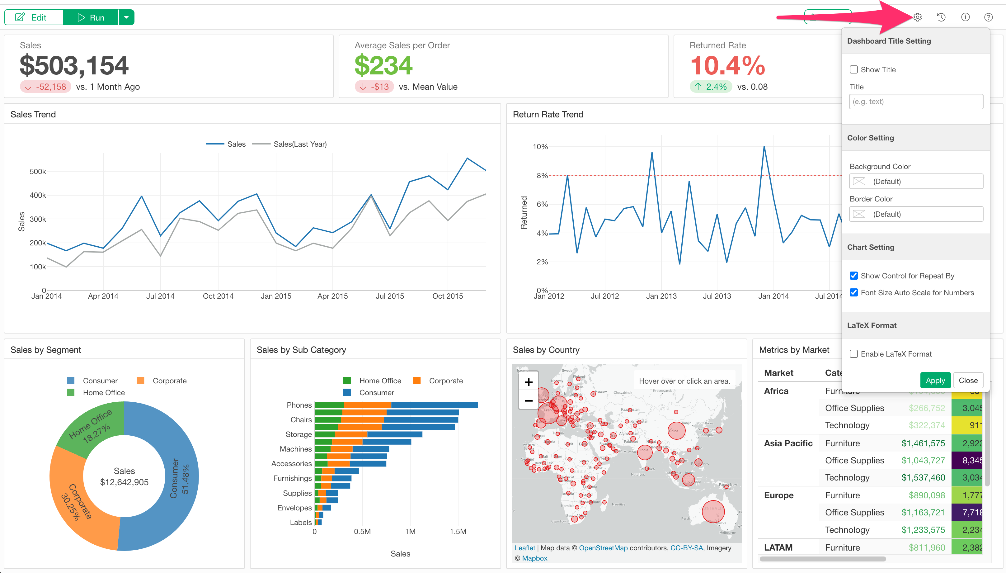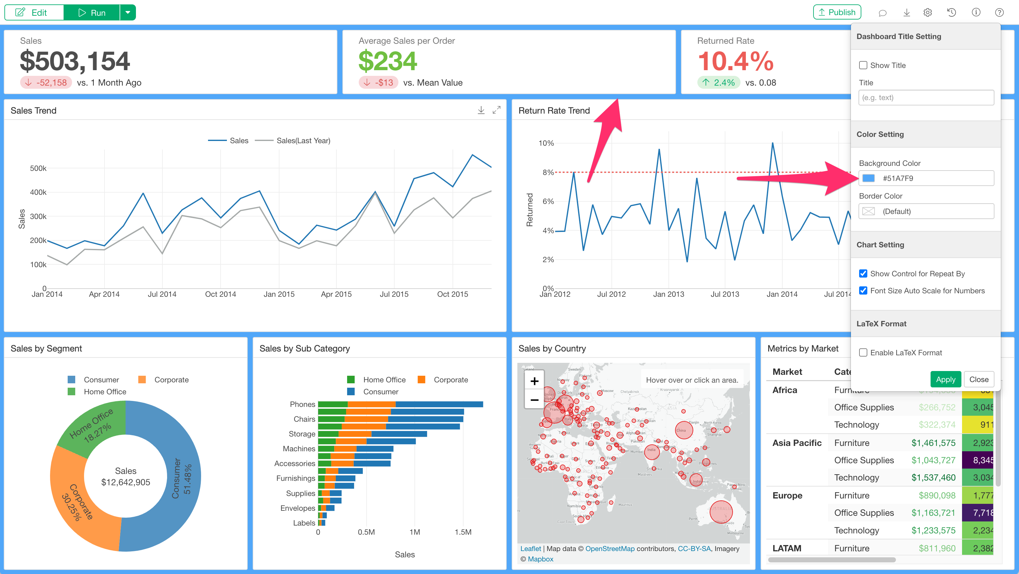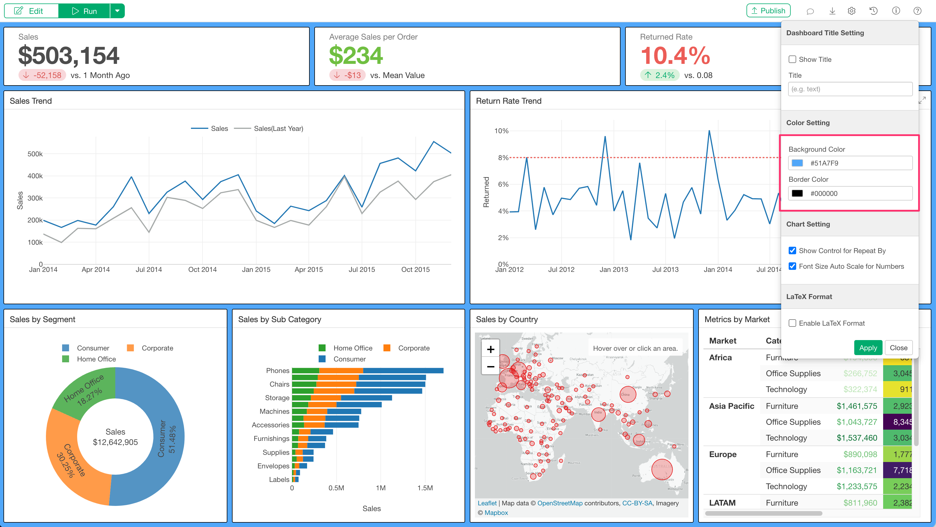 Starting from Exploratory Desktop v14.5, you can now change the background color and content border color directly from the Dashboard settings dialog.