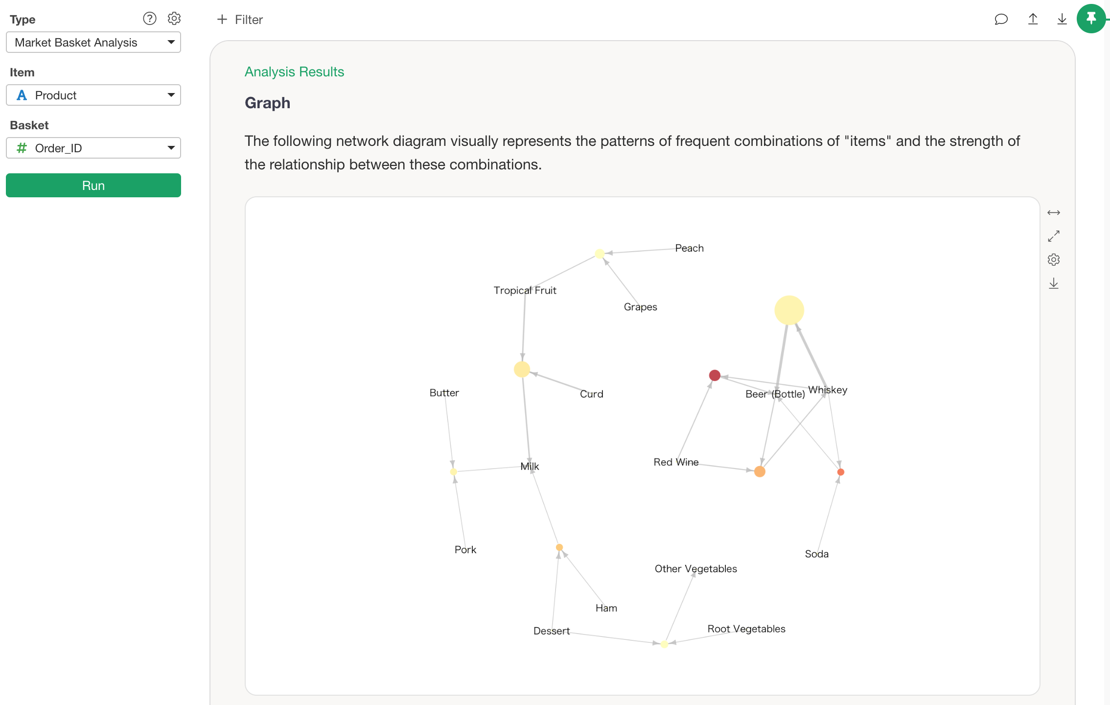 To perform Market Basket Analysis in Exploratory, you need data in a format where “one row represents one item within one order (basket).”