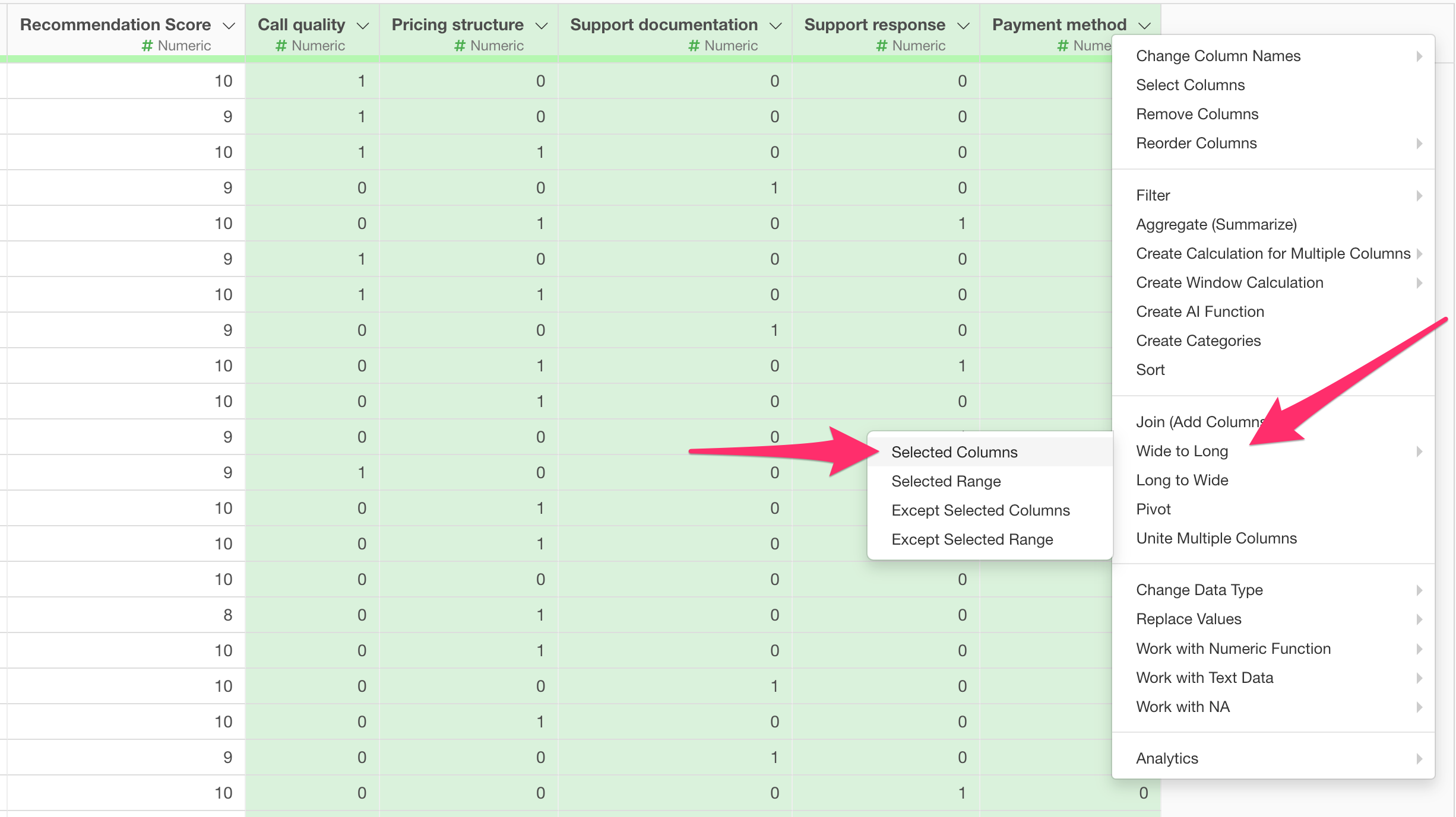 If you have data like this, select the target response columns and choose “Wide to Long” and then “Selected Columns” from any of the column header menus.