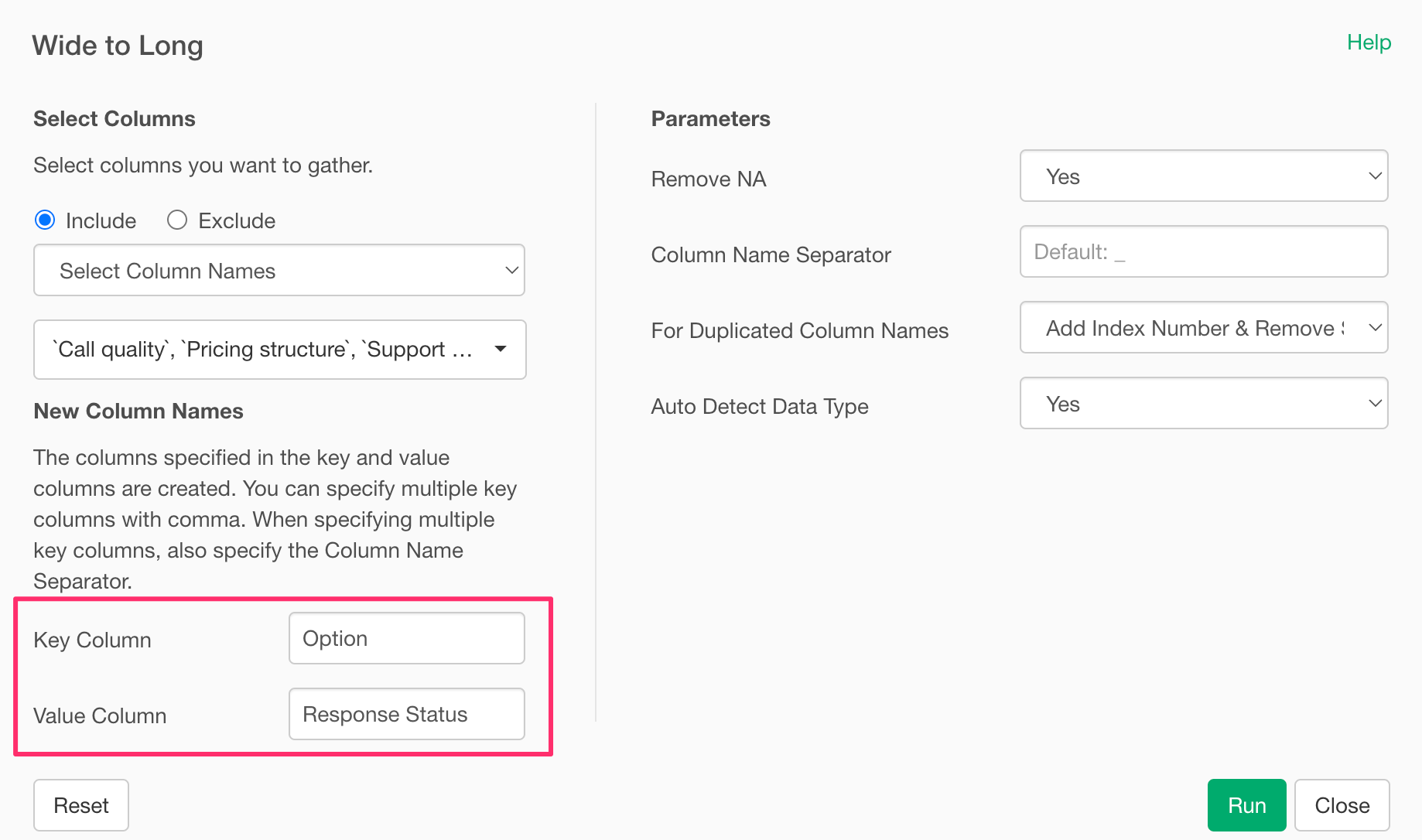 When the “Wide to Long” dialog opens, enter “Option” for the Key column and “Response Status” for the Value column, then click Run.