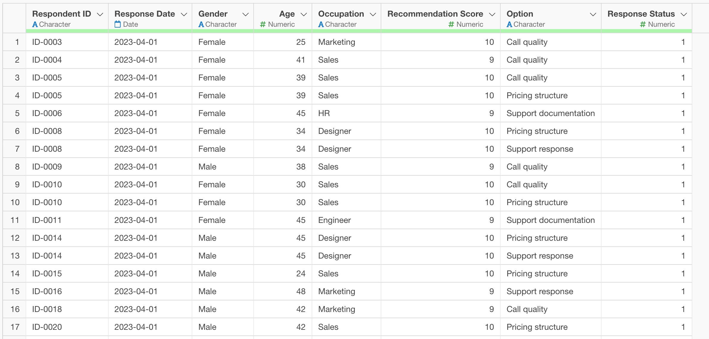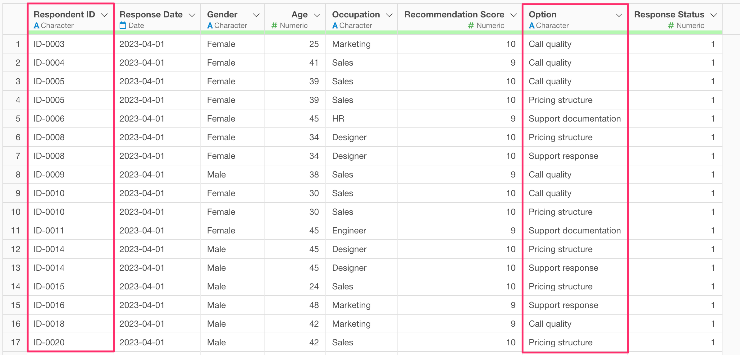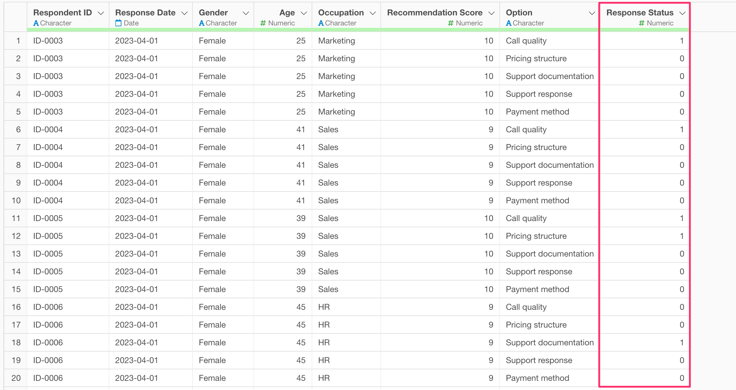 Now the data has been converted so that one row represents the response status for a single option.