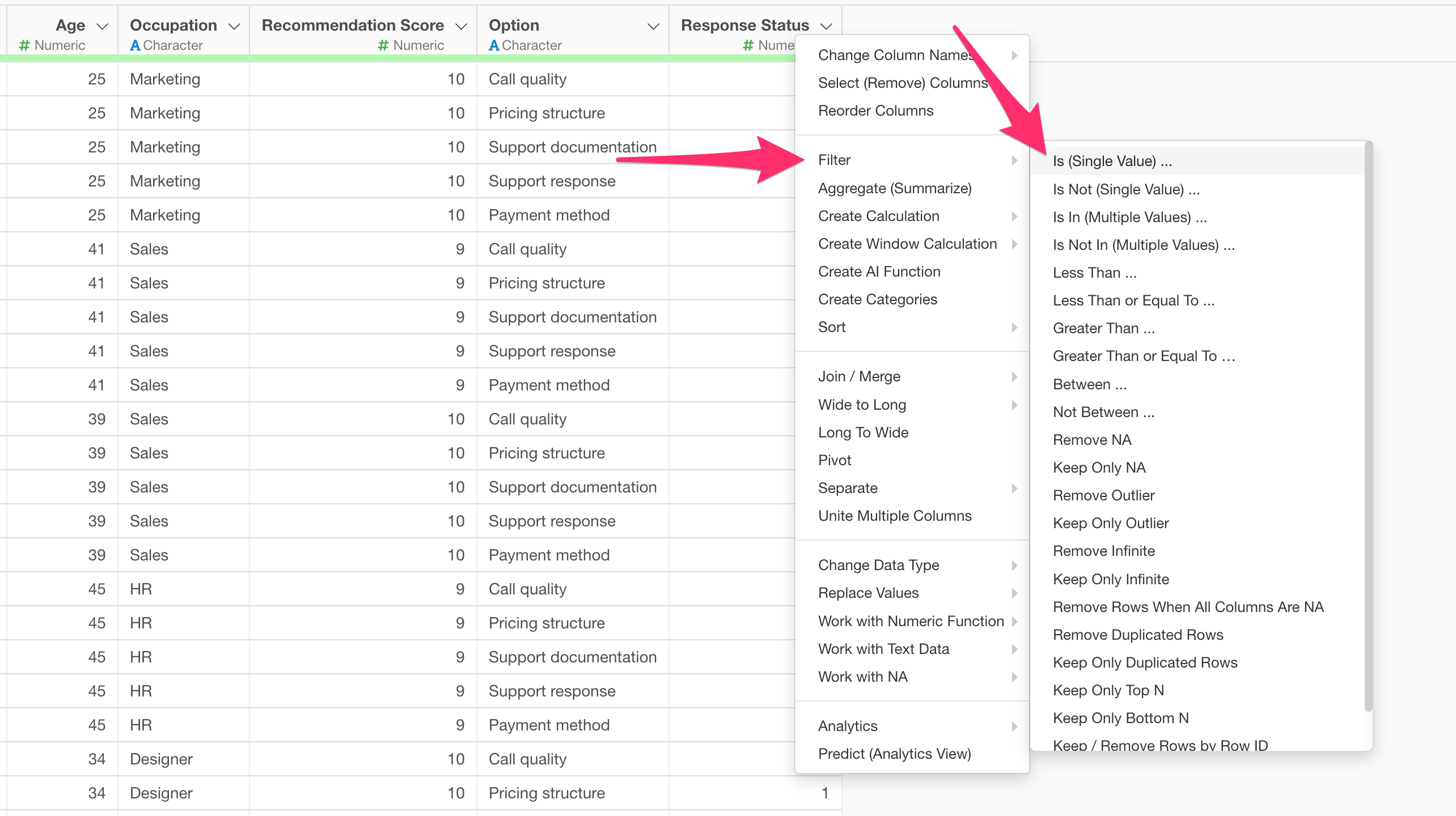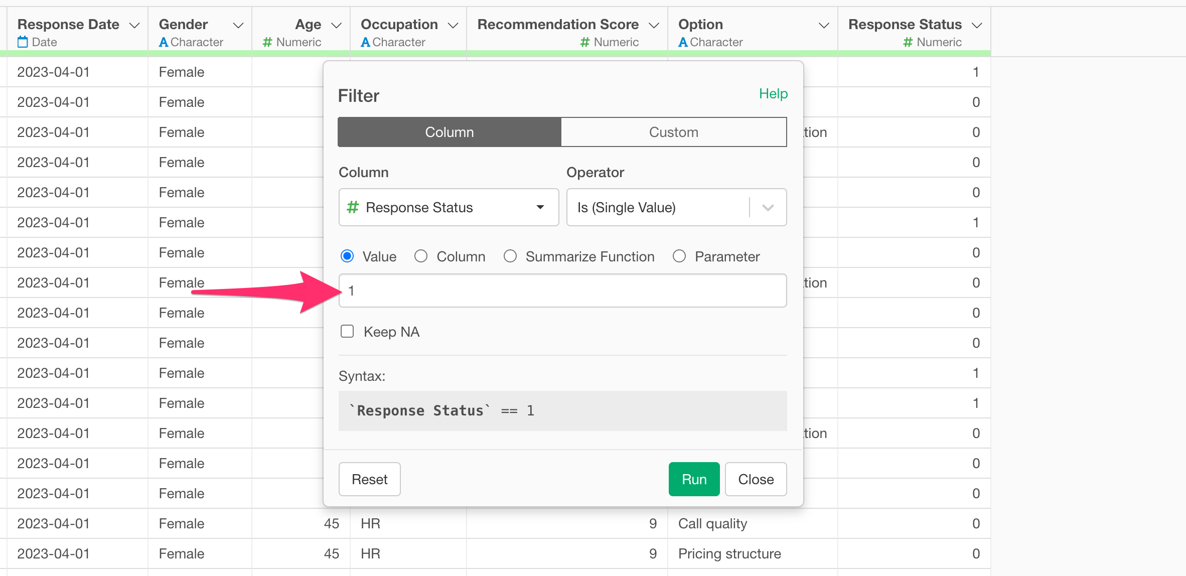 From the column header menu of the “Response Status” column, select “Filter” and then “Is (Single Value)”