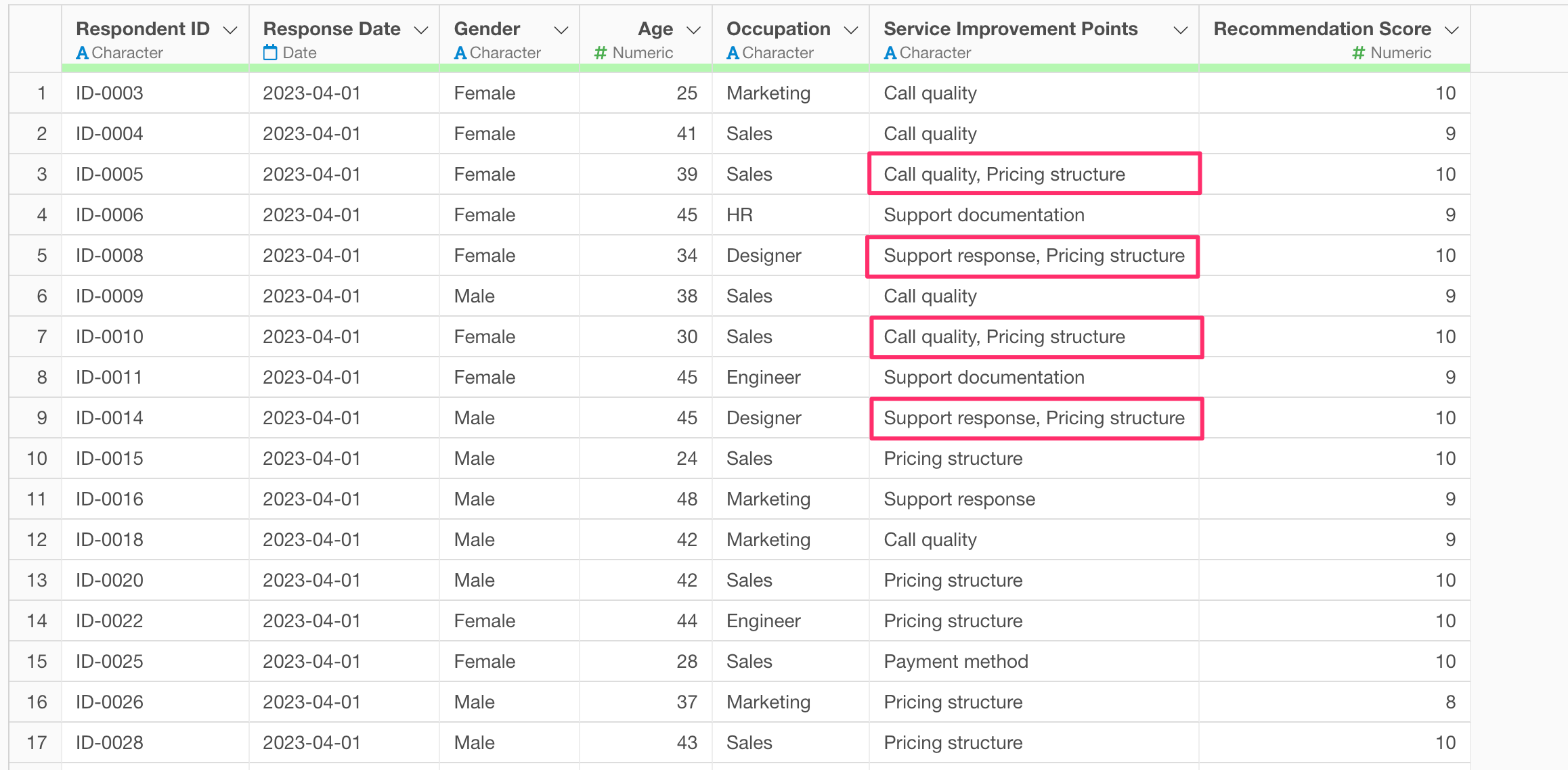 For instance, the highlighted columns in the image below represent the response status for “points to be improved” for a certain service.