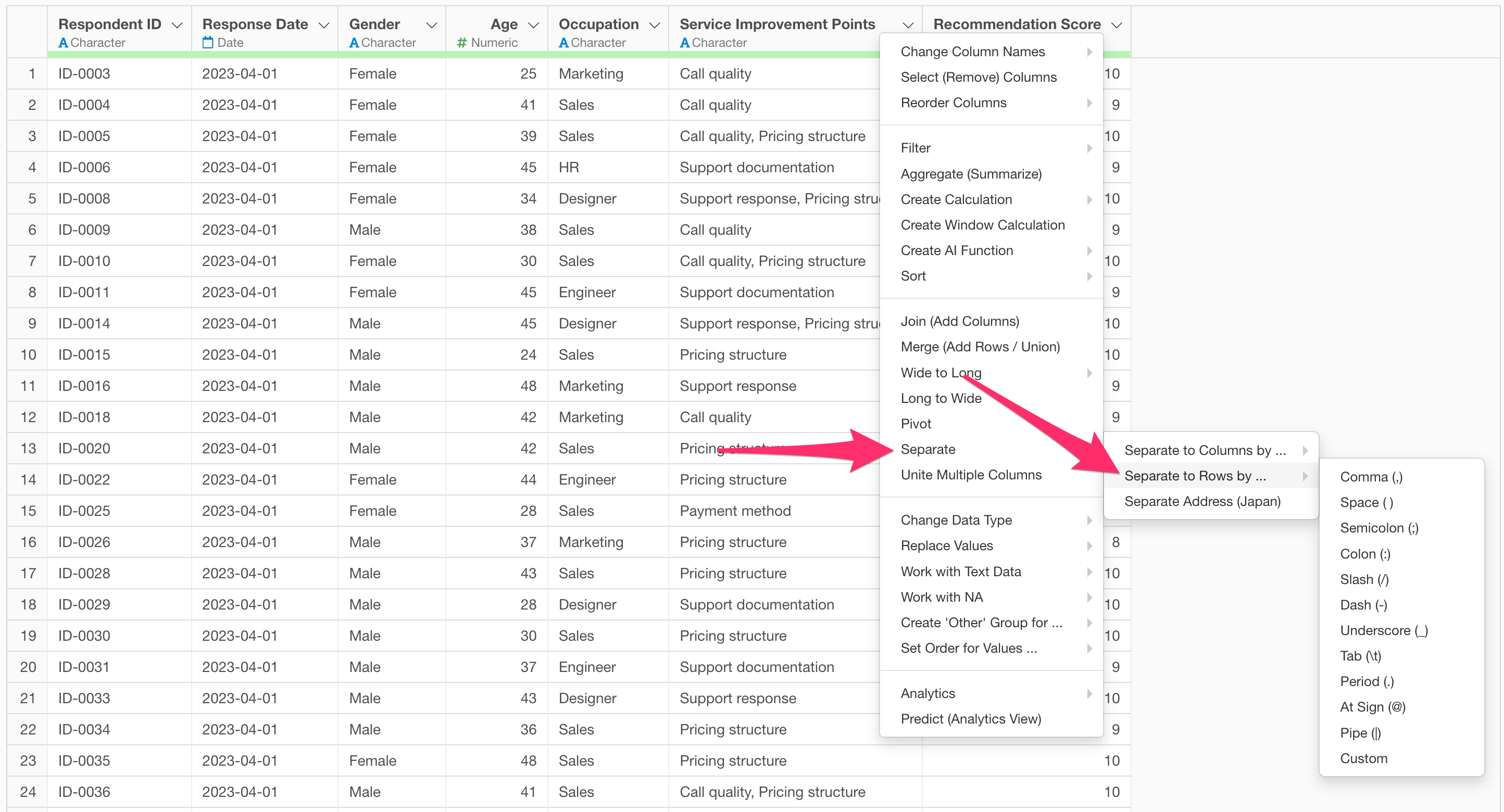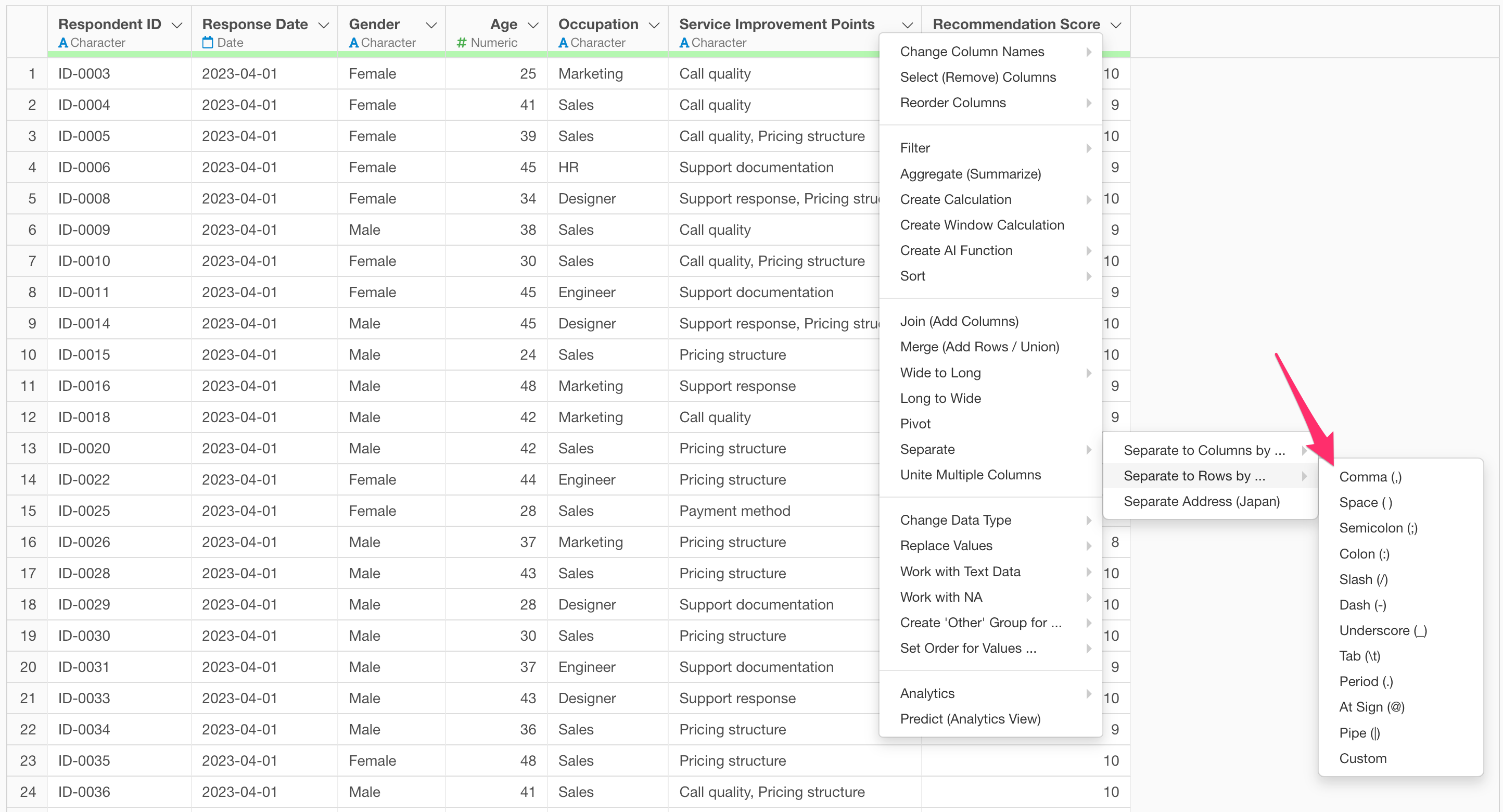 If you have data like this, select “Separate” and then “Separate to Rows by” from the column header menu of the “Service Improvement Points” column.