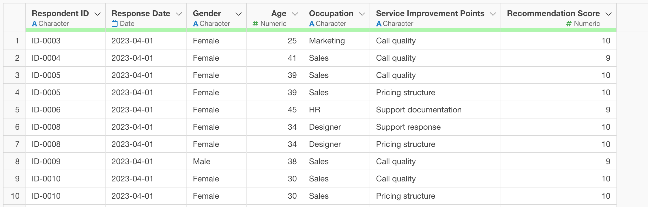Therefore, filter the data to include only those where the “Response Status” value is “1” to convert it into data where one row represents one answer from one person.