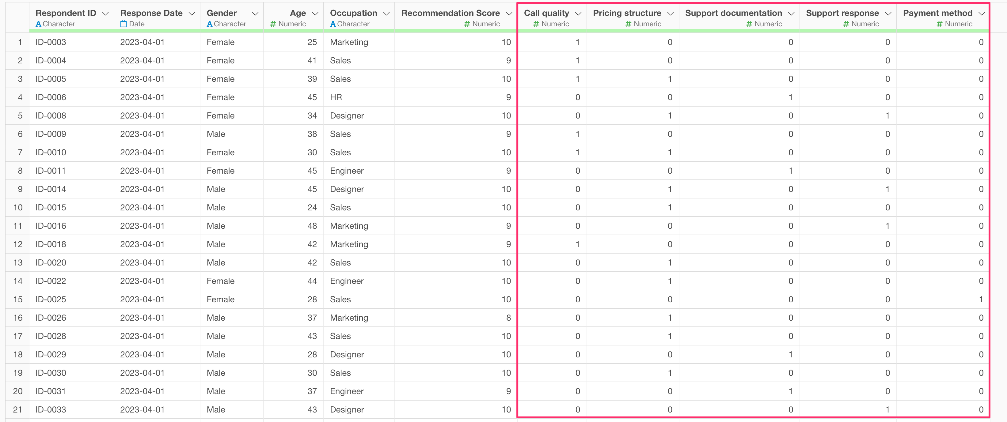 Now, each answer is expanded into a single row, converting the data into a format suitable for Market Basket Analysis.
