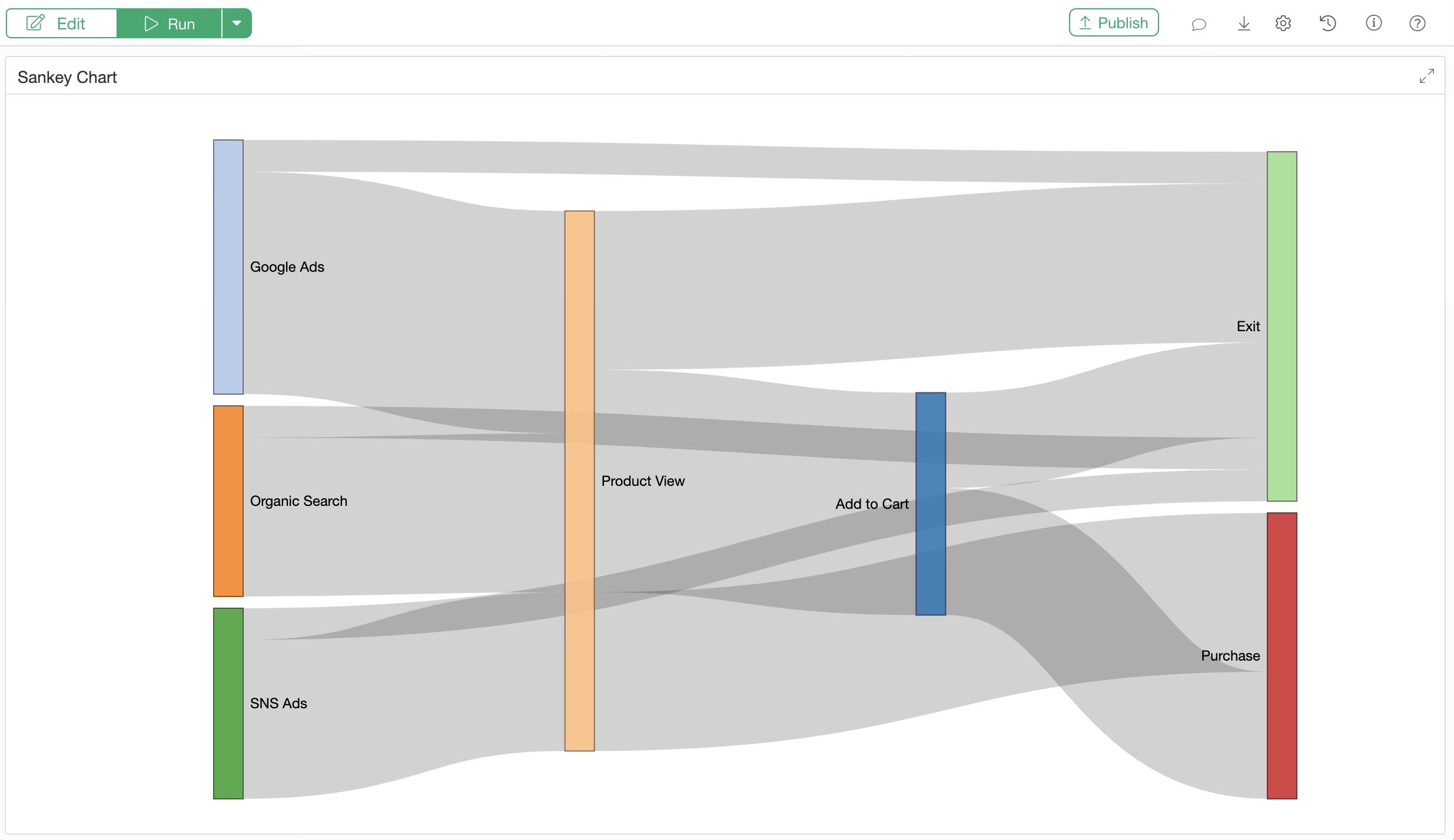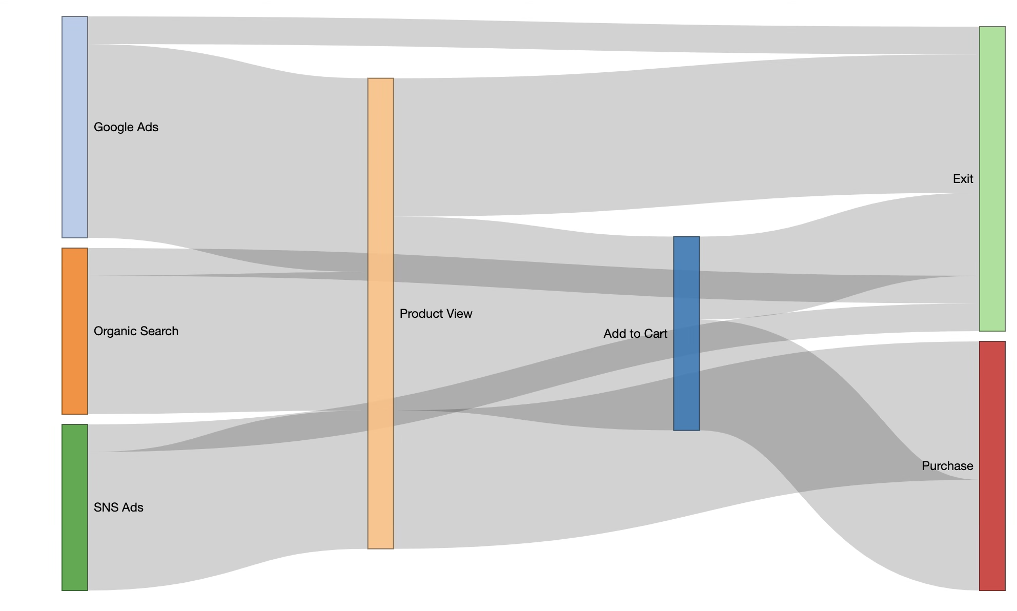 For example, the chart above is a Sankey chart representing the navigation paths of users entering an e-commerce site. You can track the journey from the entry source on the left to either exit or purchase, where wider bands indicate a higher number of users (sessions) for that path.