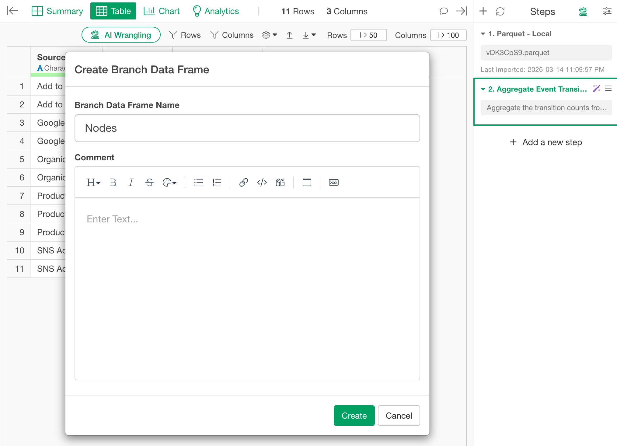 Since nodes require a unique list of event names appearing in both the source and target columns, we will use the Branch feature to split this into a separate data frame.