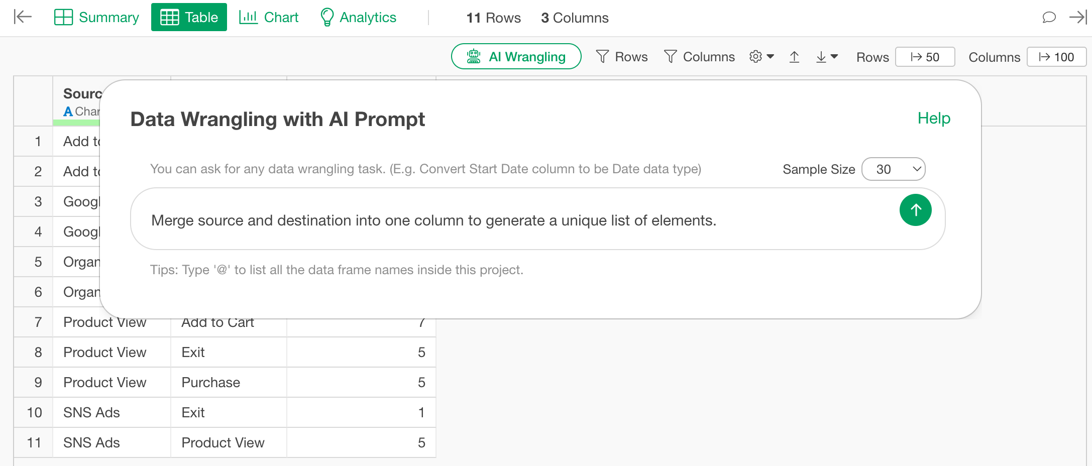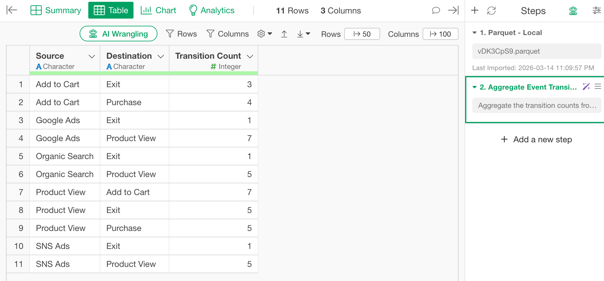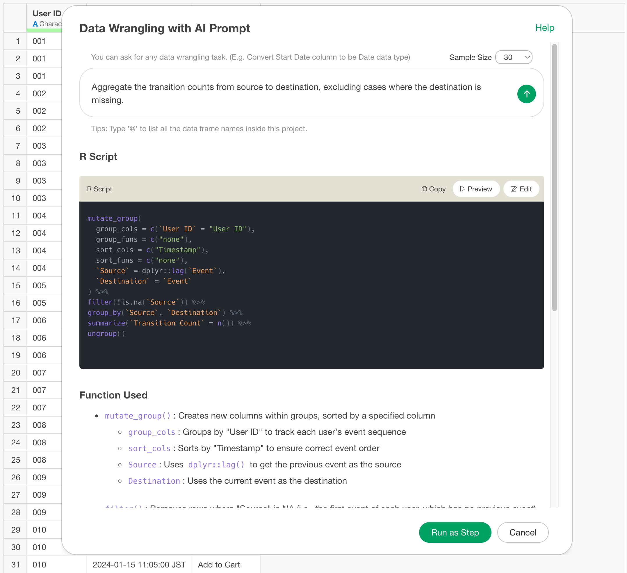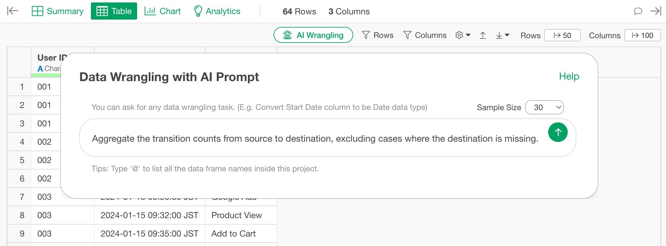 When the AI Prompt input field appears, enter the following prompt to aggregate all transition combinations and run it.