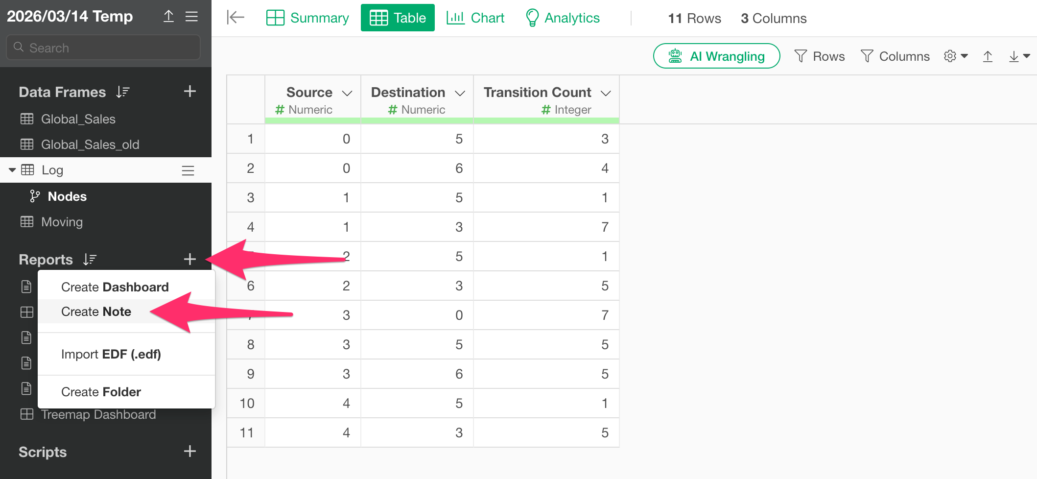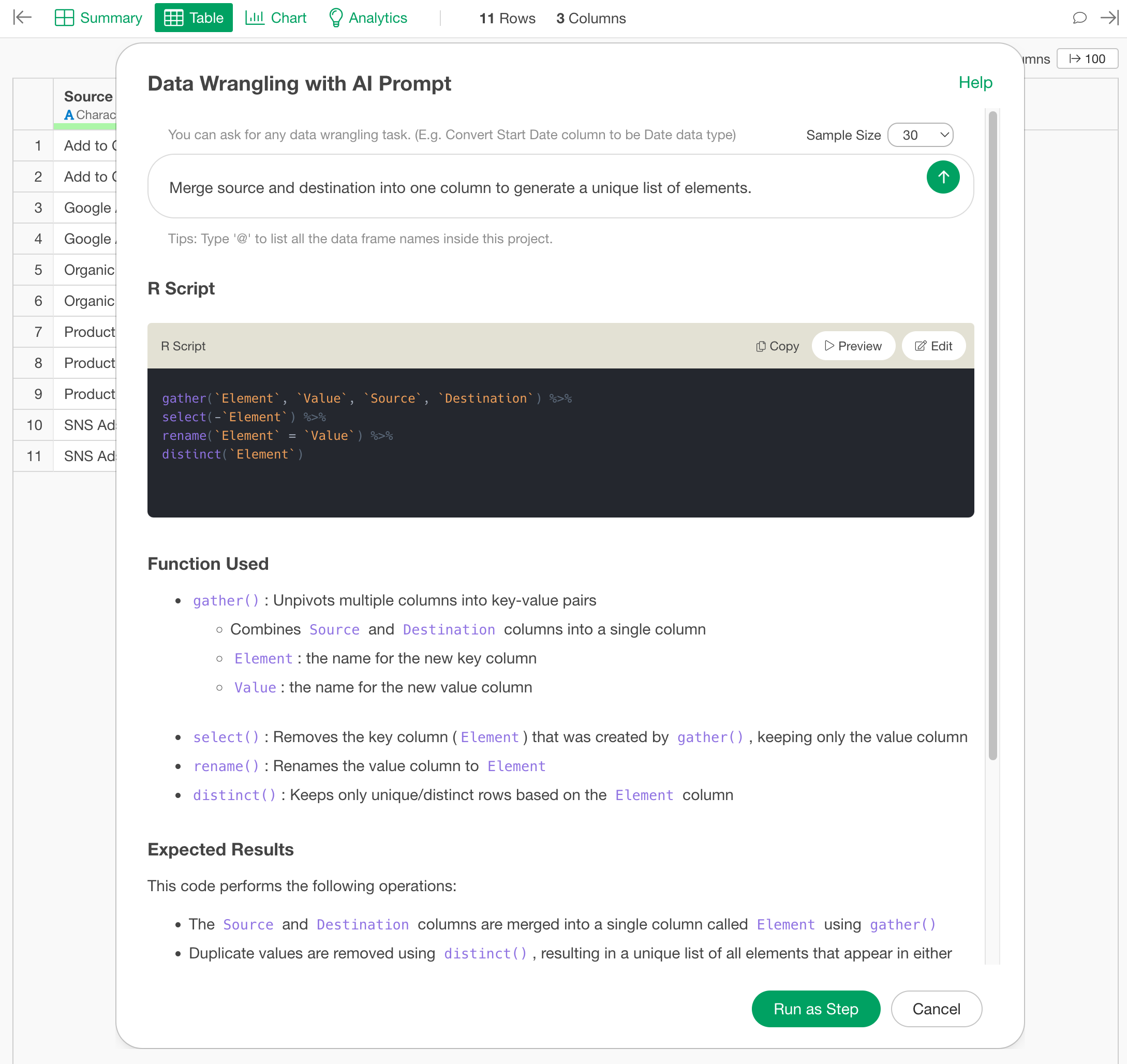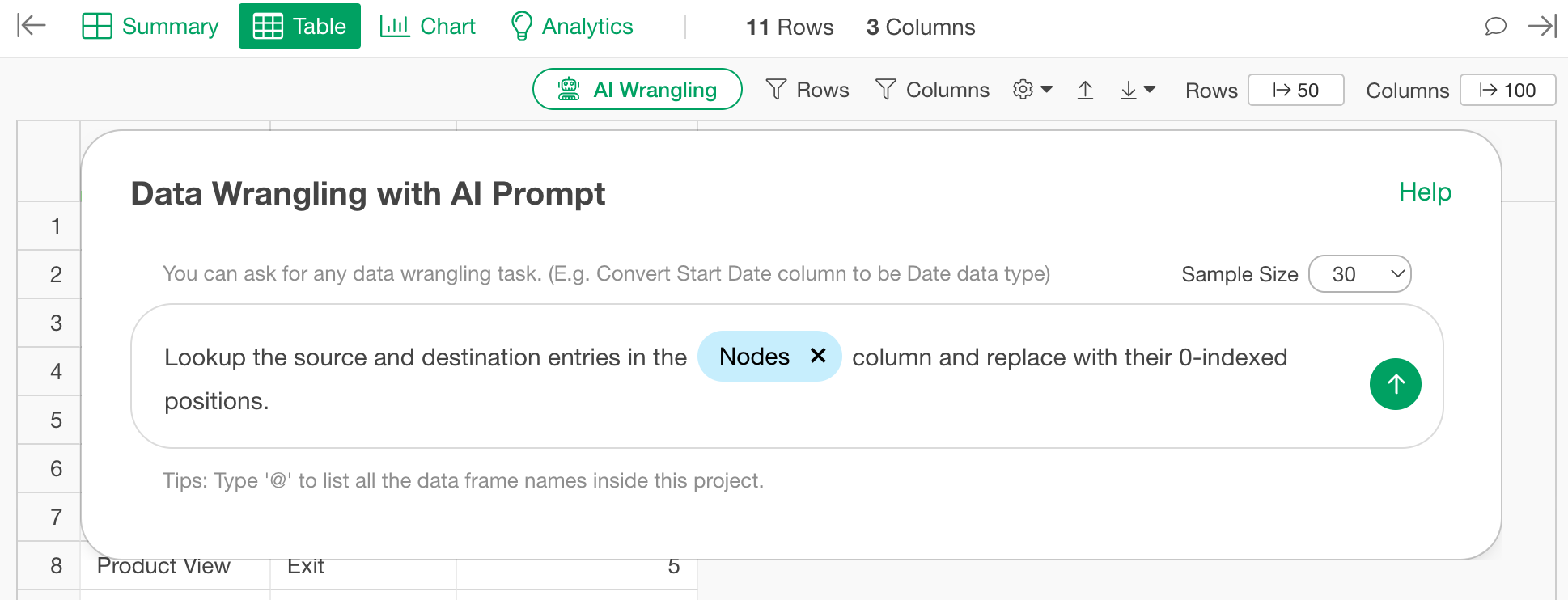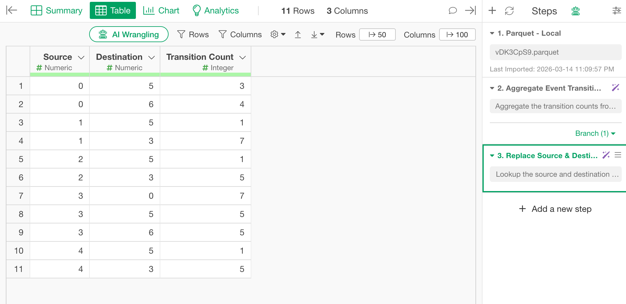When the AI Prompt input field appears, enter the following prompt to aggregate all transition combinations and run it.